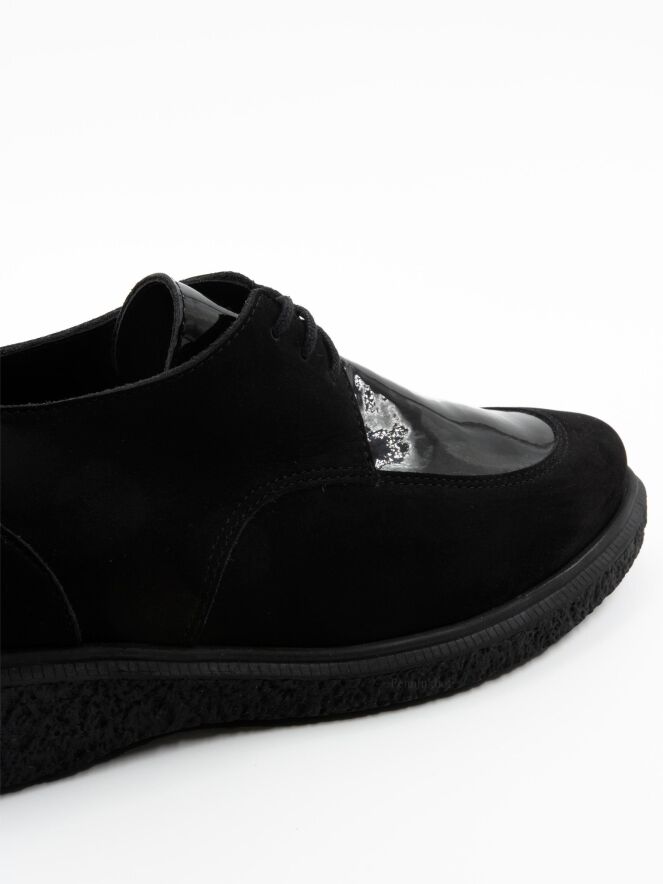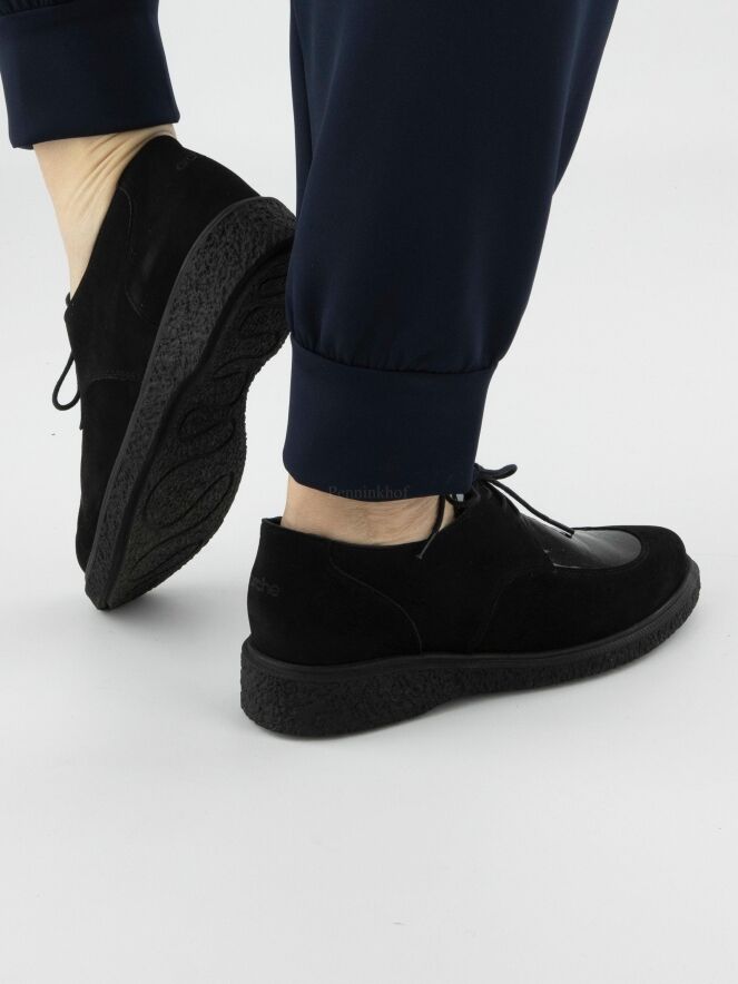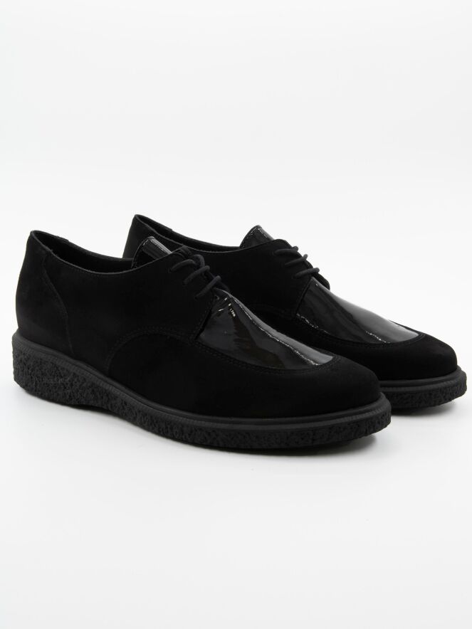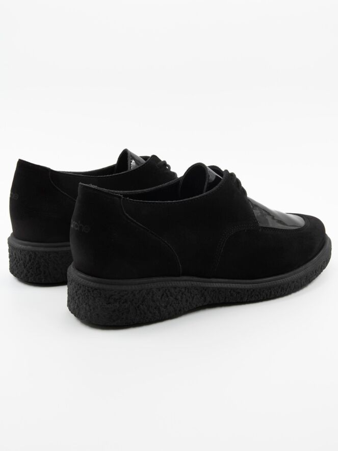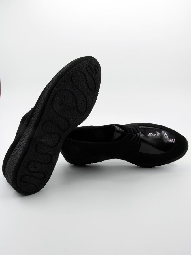 A lace-up shoe from Arche in blackThe upper of the forefoot is in a black patent leather. The inside is unlined.