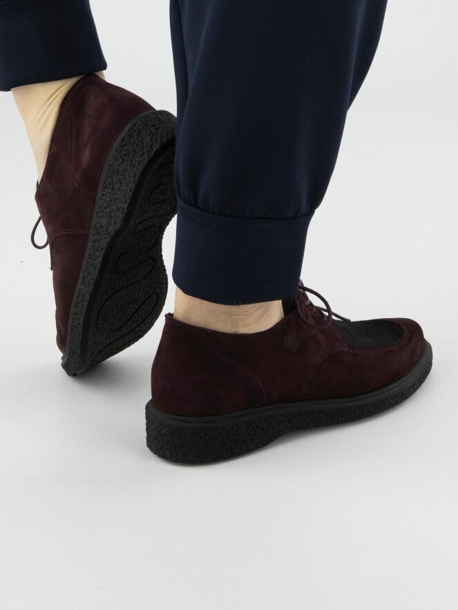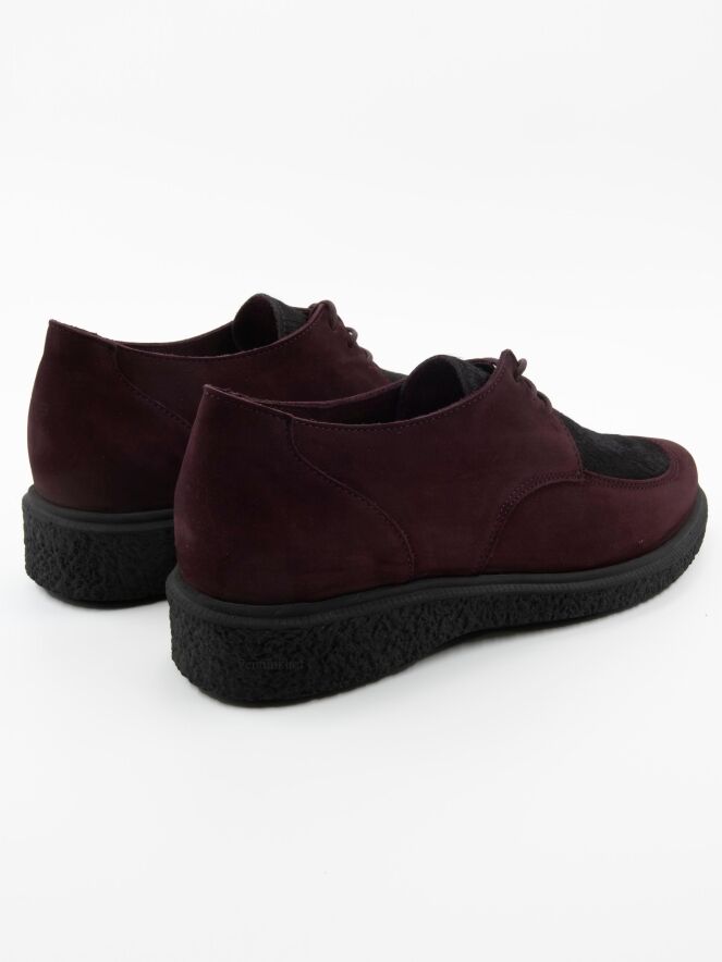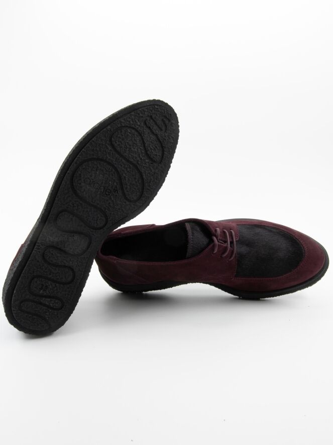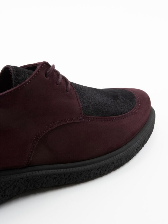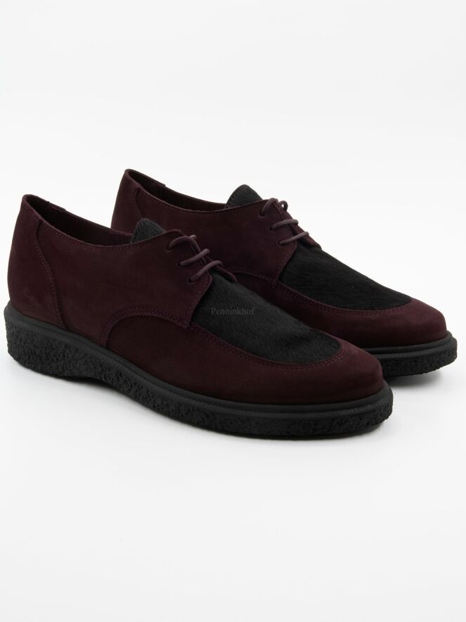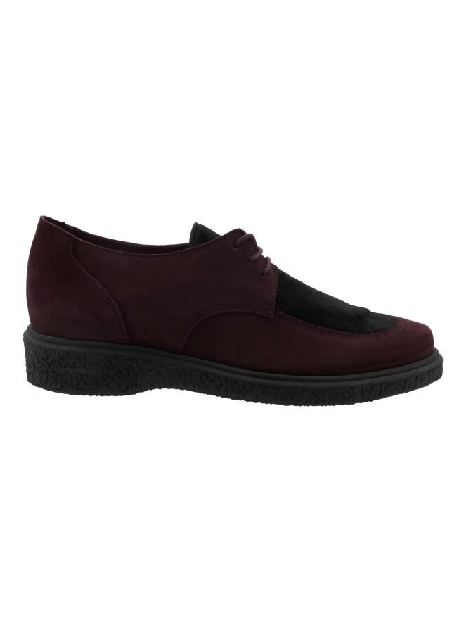 A lace-up shoe from Arche in the colour aubergine. On the forefoot is a pony coat in the colour black. The inside is unlined.
