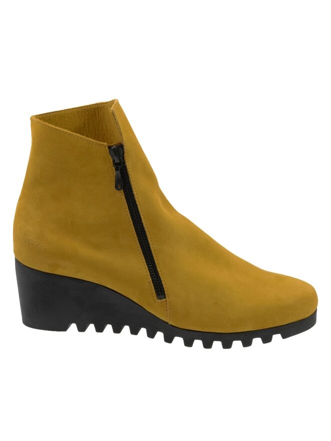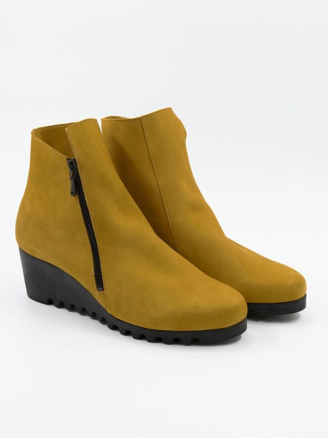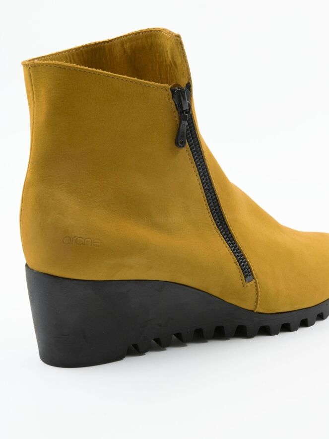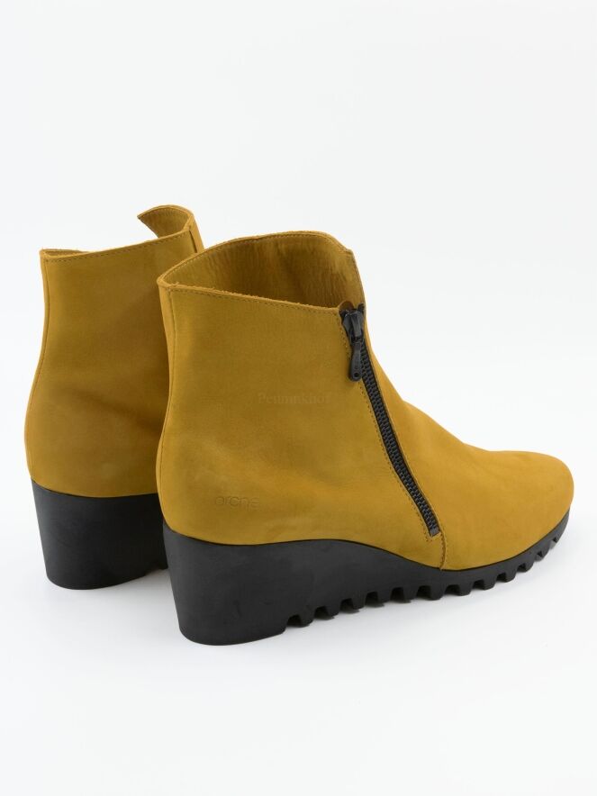 A short boot from Arche in the colour yellow. on the outside is a slanted zip in the colour black. The knurled sole is in the colour black. The boot has a round toe and the inside is unlined.