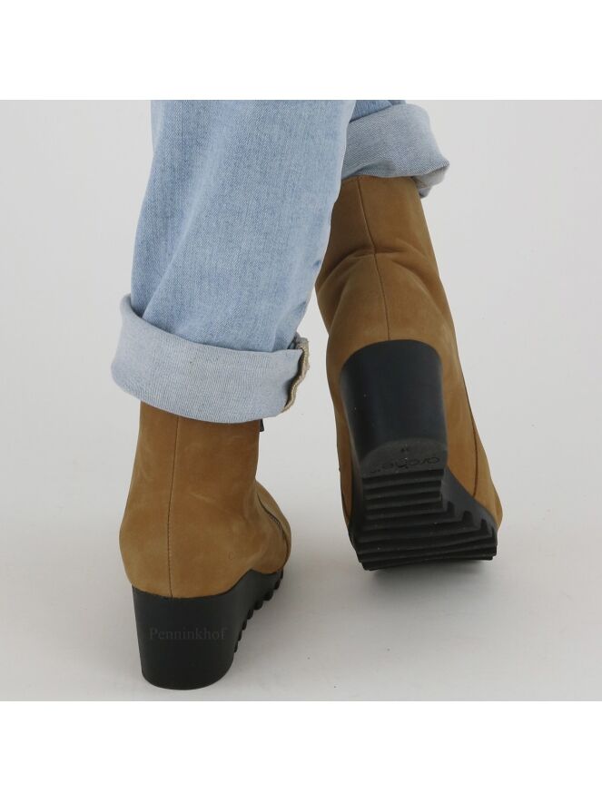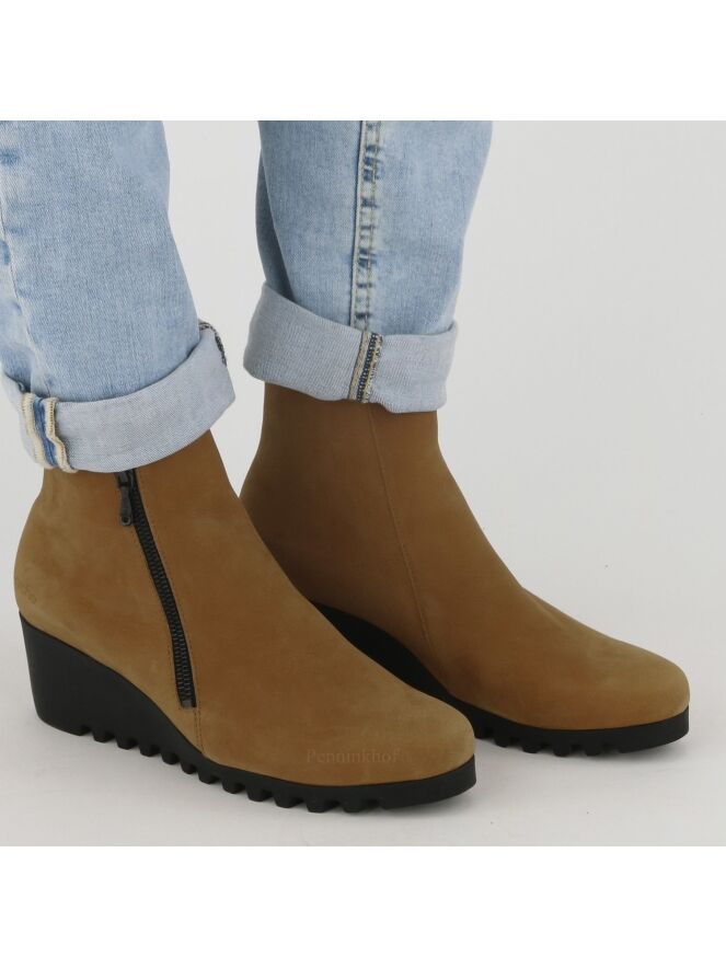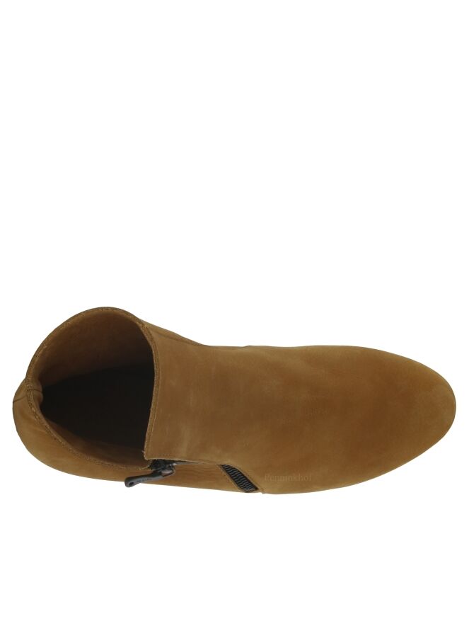 A short boot from Arche in the color cognac. on the outside is a slanting zipper in the color black. The serrated sole is black. The boot has a round nose and the inside is unlined.