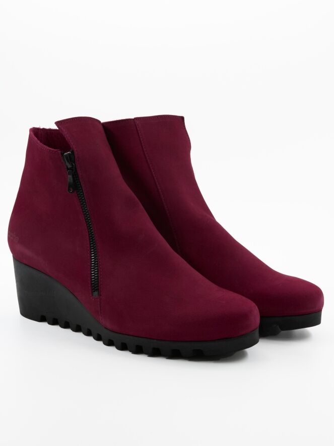 A short boot from Arche in the colour bordeaux red. on the outside is a slanted zip in the colour black. The knurled sole is in the colour black. The boot has a round toe and the inside is unlined.