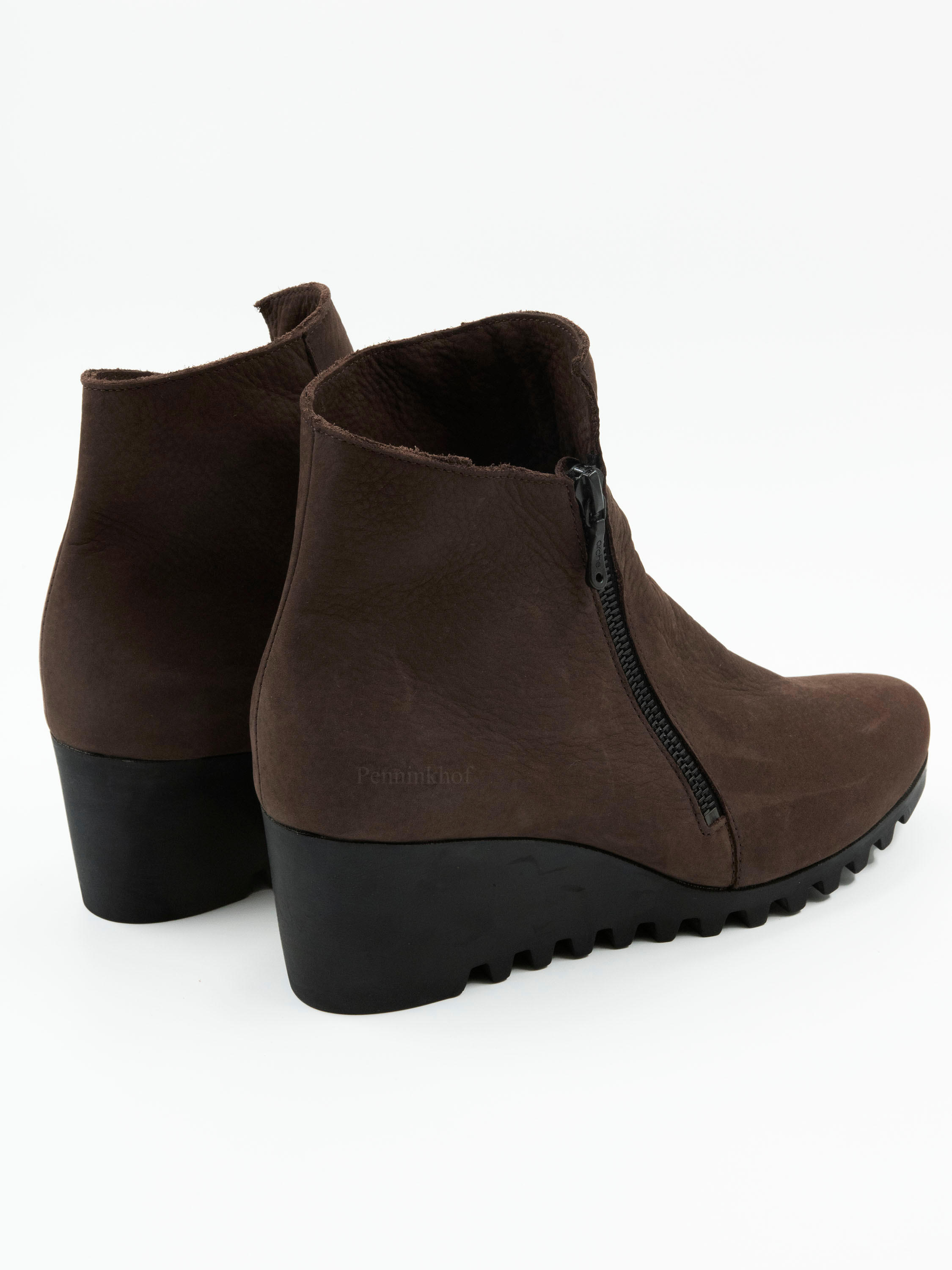A short boot from Arche in the color mocha brown. on the outside is a slanting zipper in the color black. The serrated sole is in the color black. The boot has a round toe and the inside is unlined.