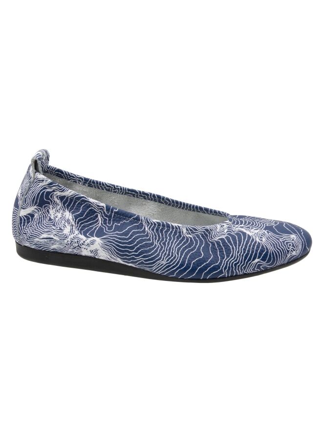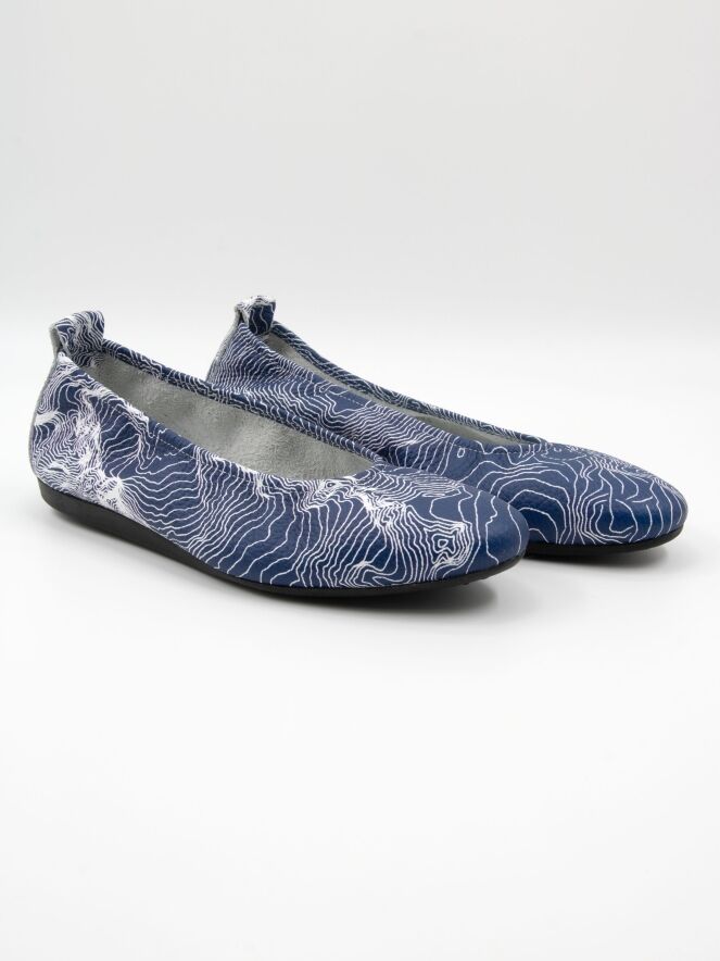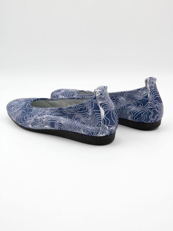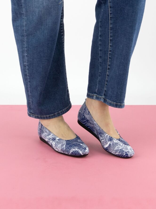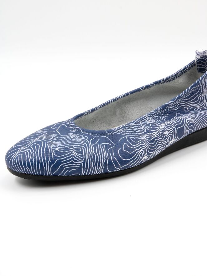 The Laius model is a classic design by Arche, featuring a graphic print of white lines on a blue background. This ballerina is made from high-quality calf leather and has a flexible latex sole. The toe is beautifully rounded. The interior is unlined for added softness. The heel section of the sole is slightly elevated for enhanced comfort.