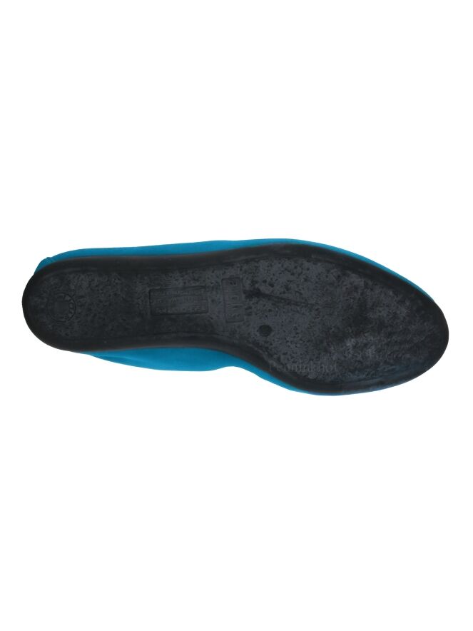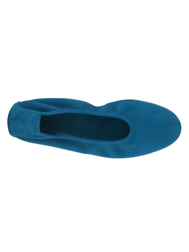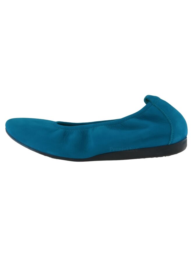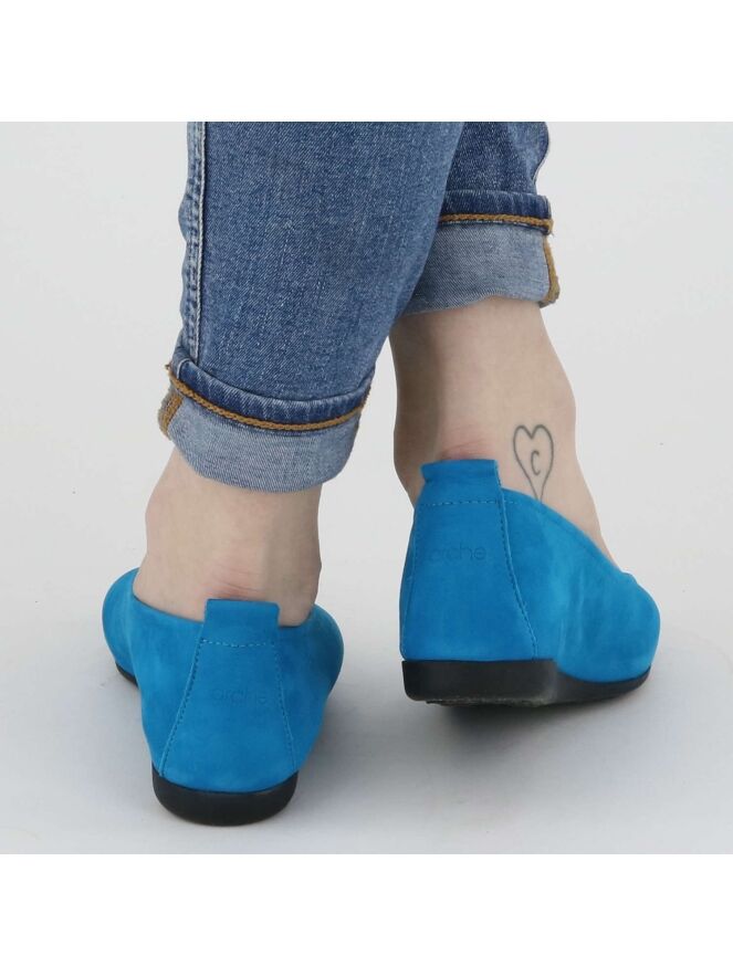 The model Laius is a basic model of the brand Arche in the color turquoise. This ballerina is made of high quality nubuck suede and has a black latex sole. The model has a uni color. The ballerina's toe is nicely rounded. The ballerina is not lined on the inside. The back of the sole is slightly raised, which contributes to more comfort.