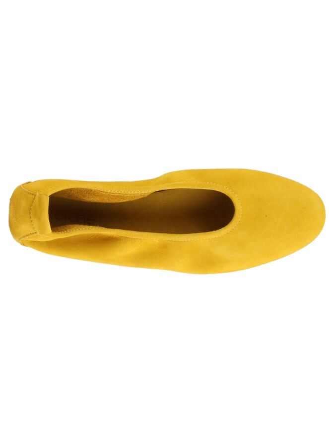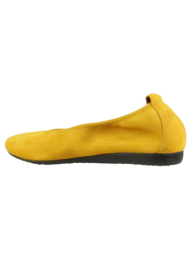 The Laius model is a basic model of the Arche brand. This ballerina is made of a high quality calf suede and has a latex sole. The model has an ocher yellow color. The toe of the ballerina is nicely cut around. The ballerina is not lined on the inside. The rear section of the sole is slightly raised which contributes to more comfort.