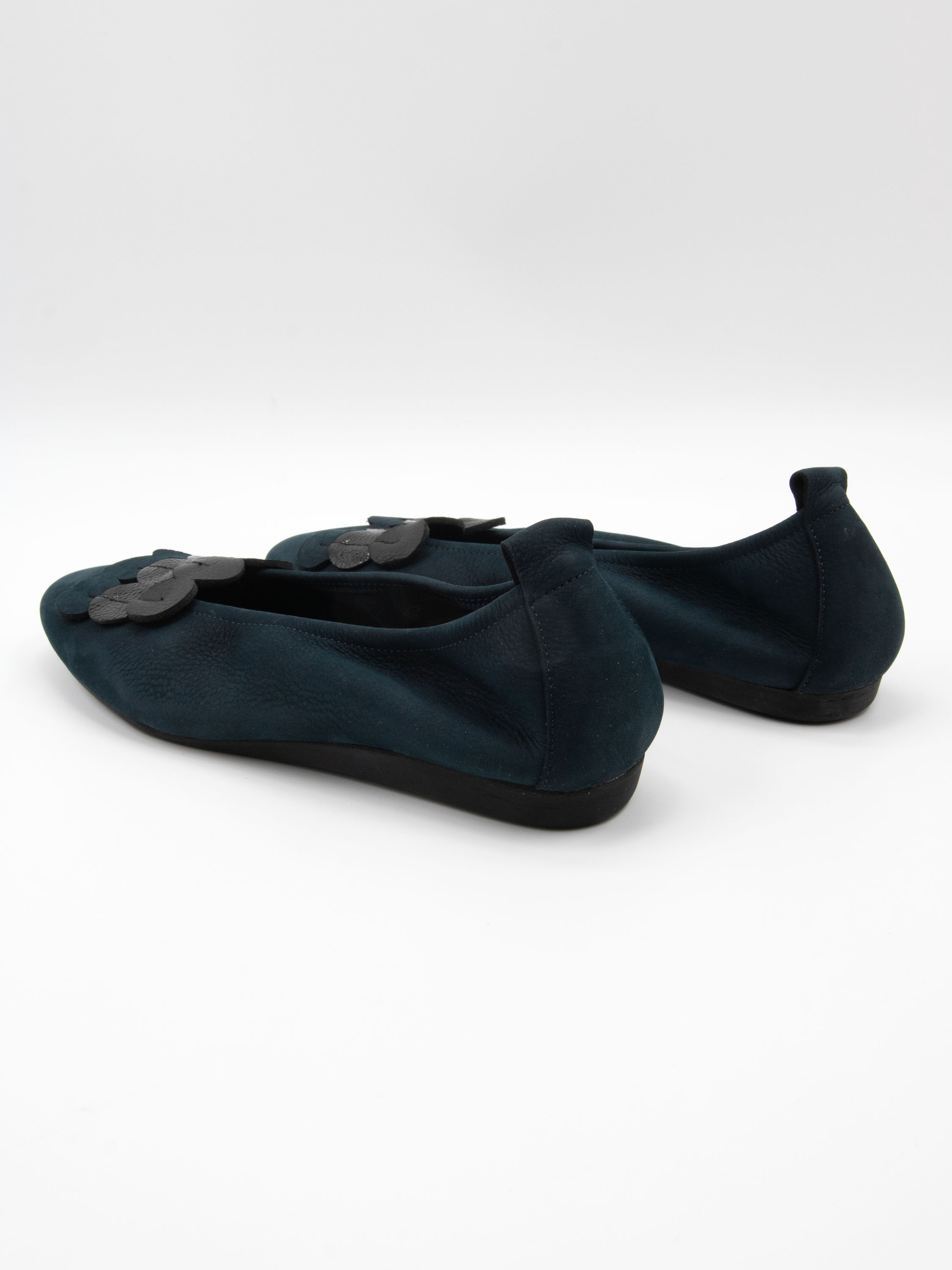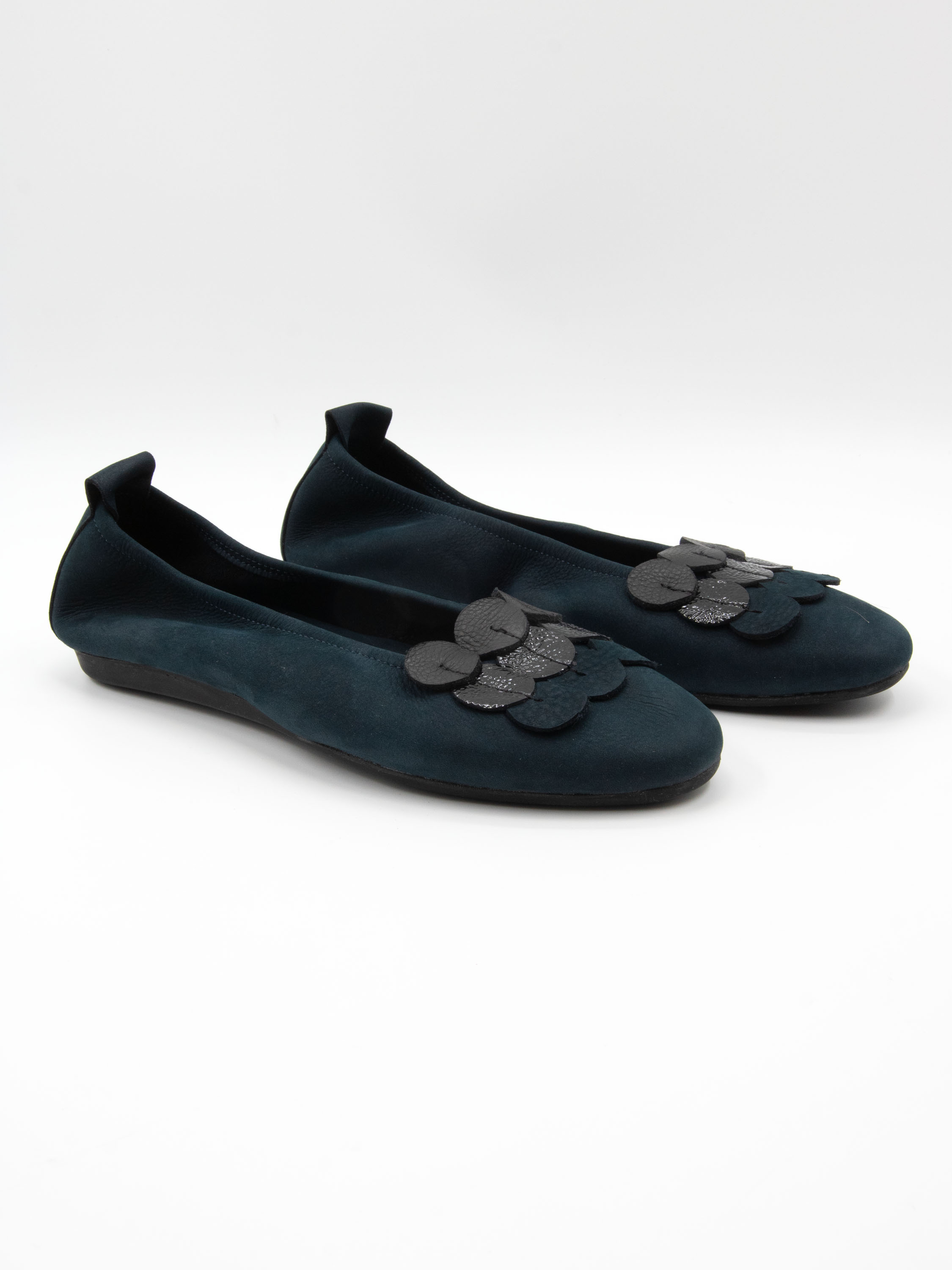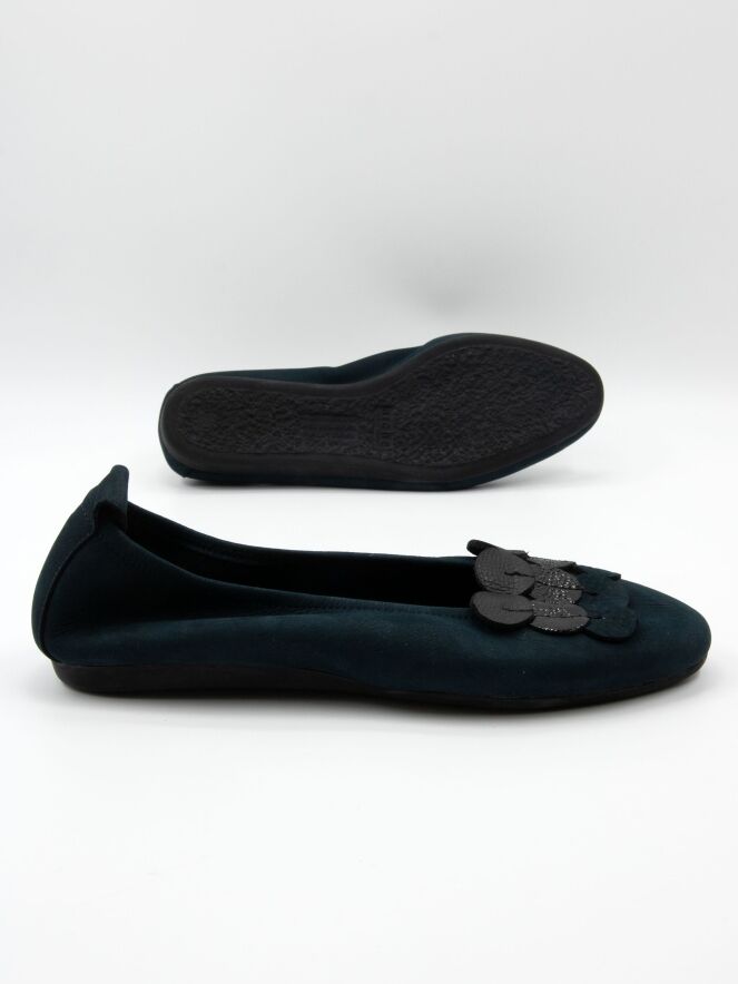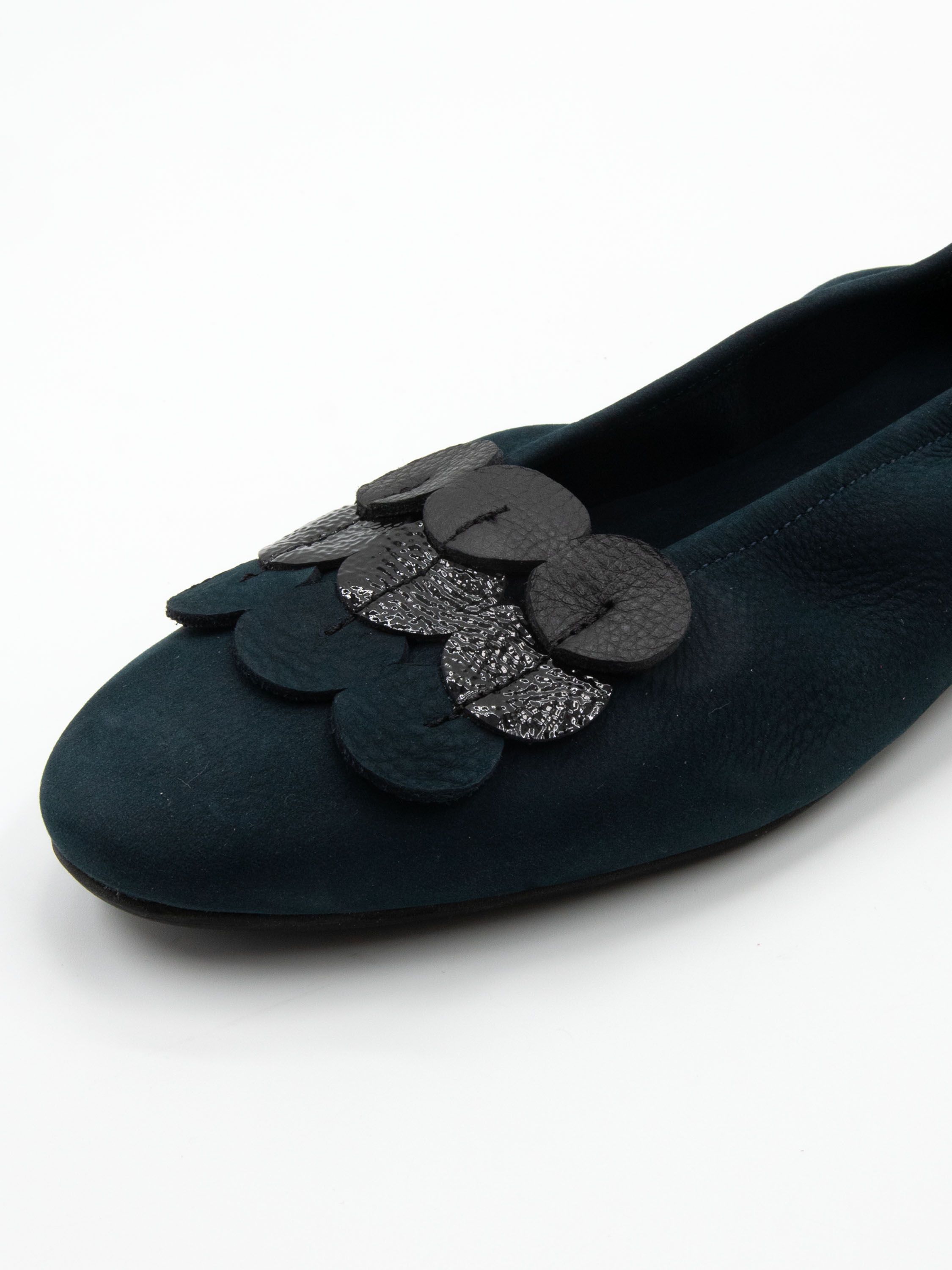 Ballerina by Arche, identical to the Laius model, in an elegant navy blue shade. The forefoot is adorned with nine decorative circular elements (3x3), crafted in three different leather qualities, creating a playful yet refined texture. The elegantly rounded toe enhances its timeless appeal. The unlined interior ensures added suppleness and a natural fit, while the slightly raised heel section provides additional comfort with every step.