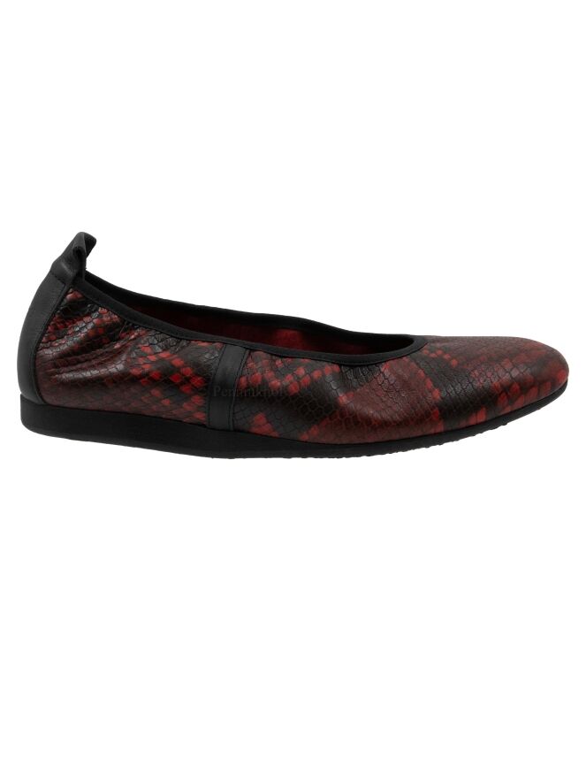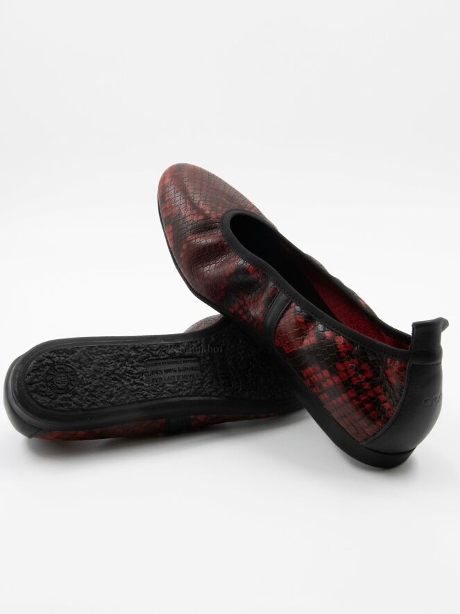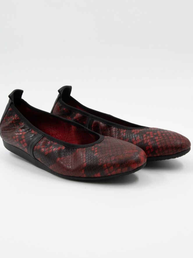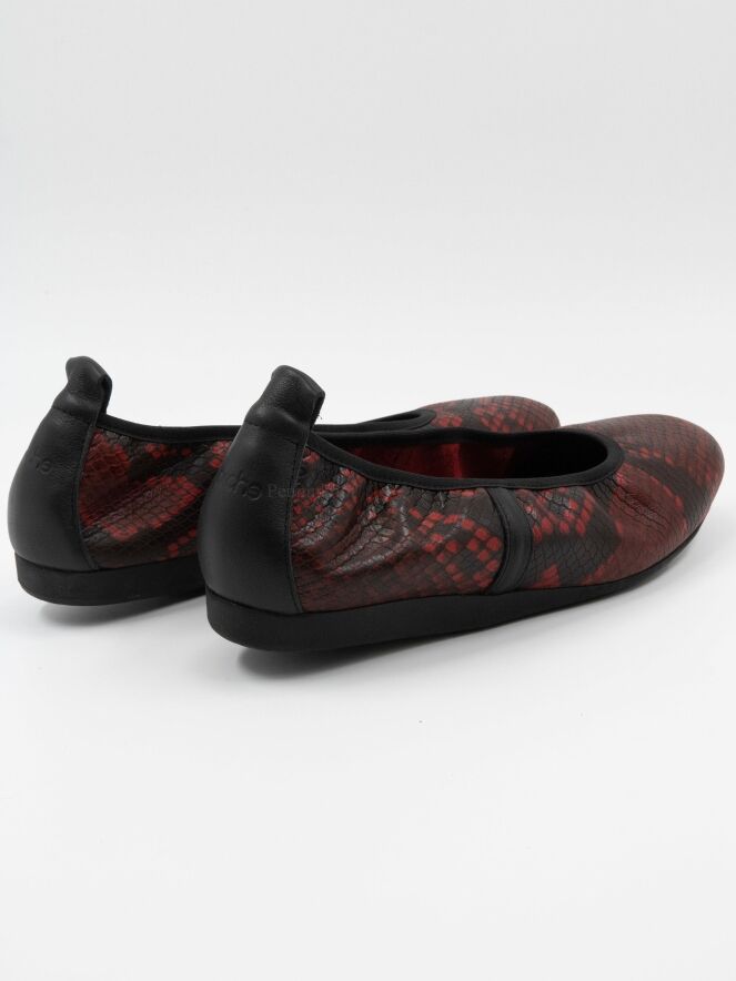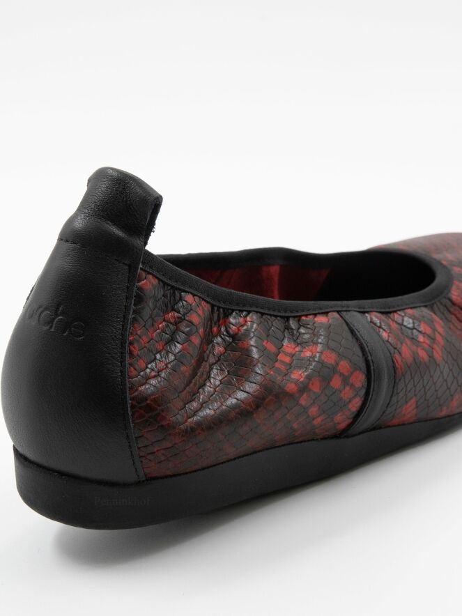 A ballerina from Arche in a reptile print with the colours red and black. Along the side and on the heel is a black trim. The inside is unlined.