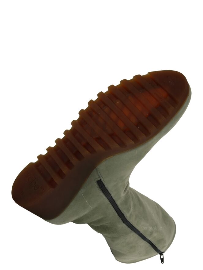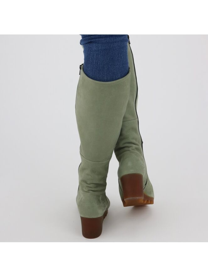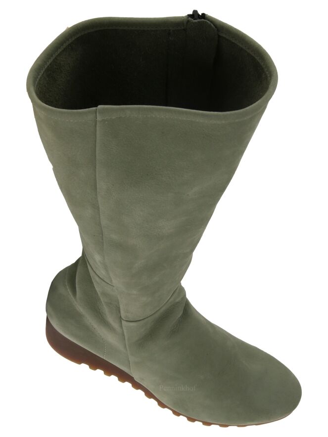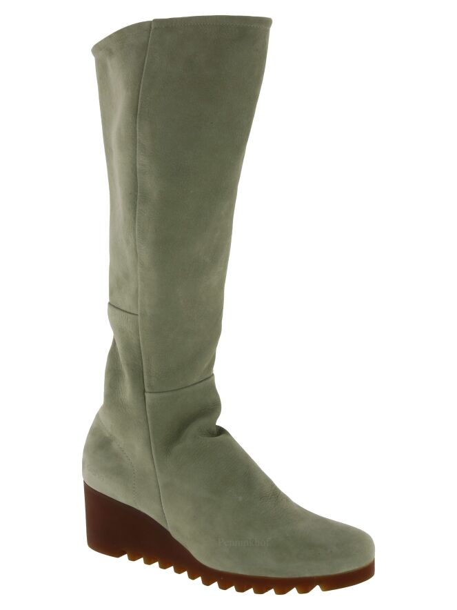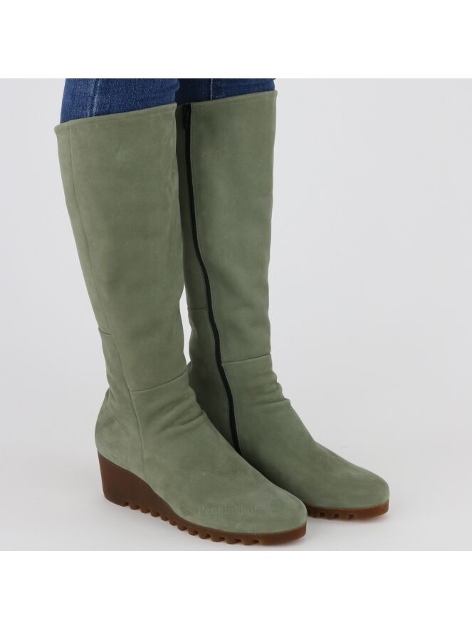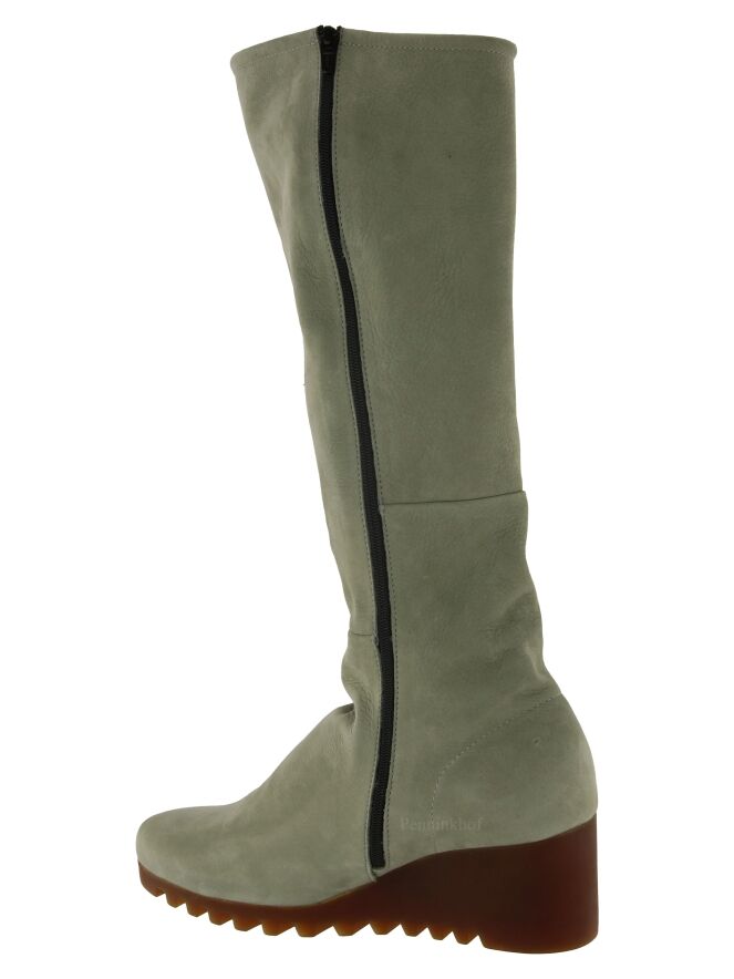 A high boot from Arche in the color olive green. The boot has a wedge heel with a latex sole in a cognac color. The zipper on the inside is in the color black. The inside is unlined.