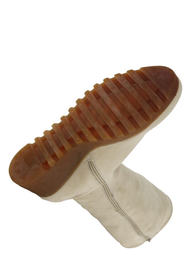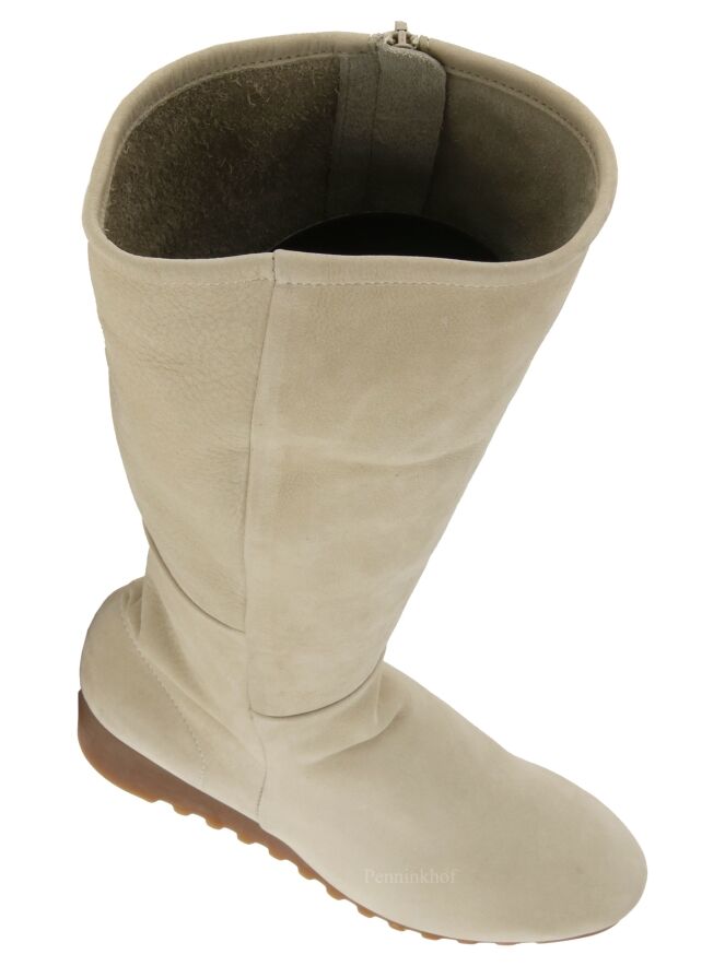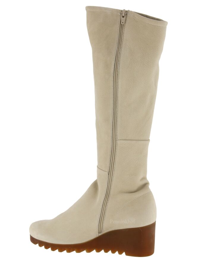 A high boot from Arche in the color creamy white. The boot has a wedge heel with a latex sole in a cognac color. The zipper on the inside is in the color black. The inside is unlined.