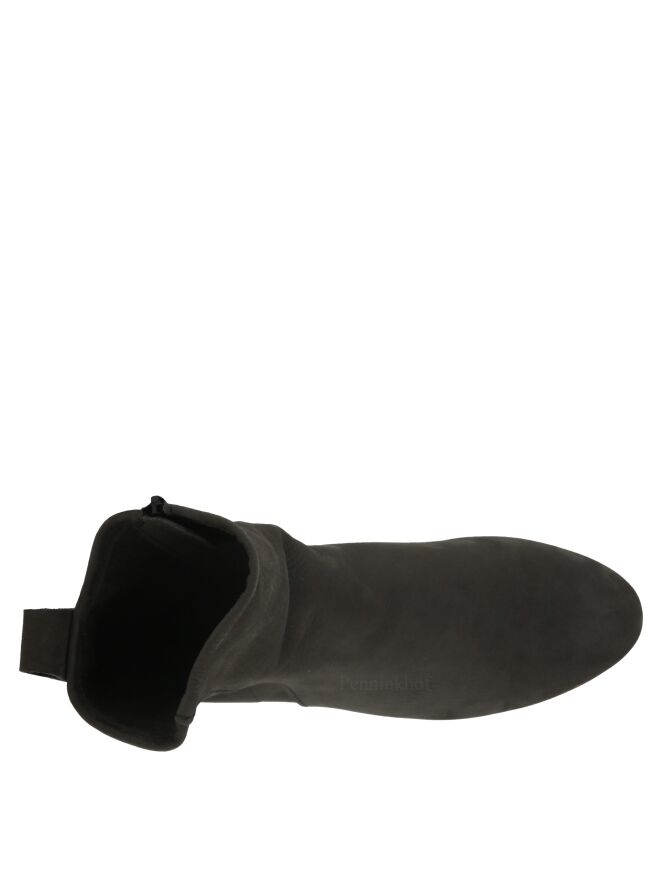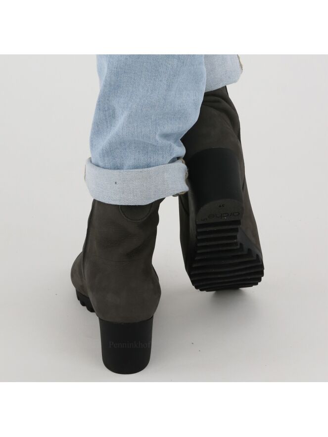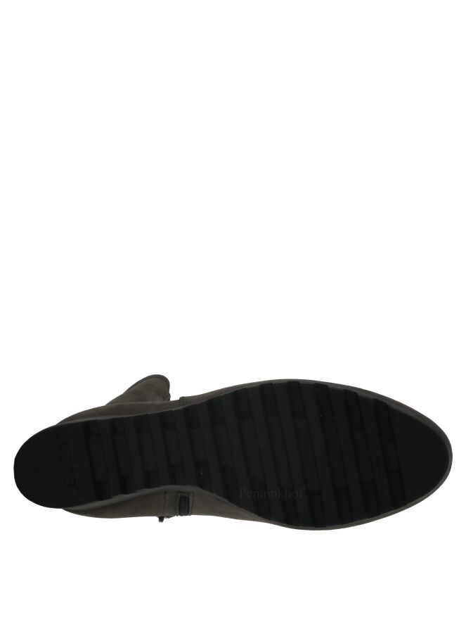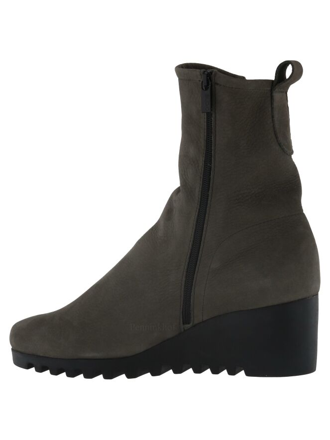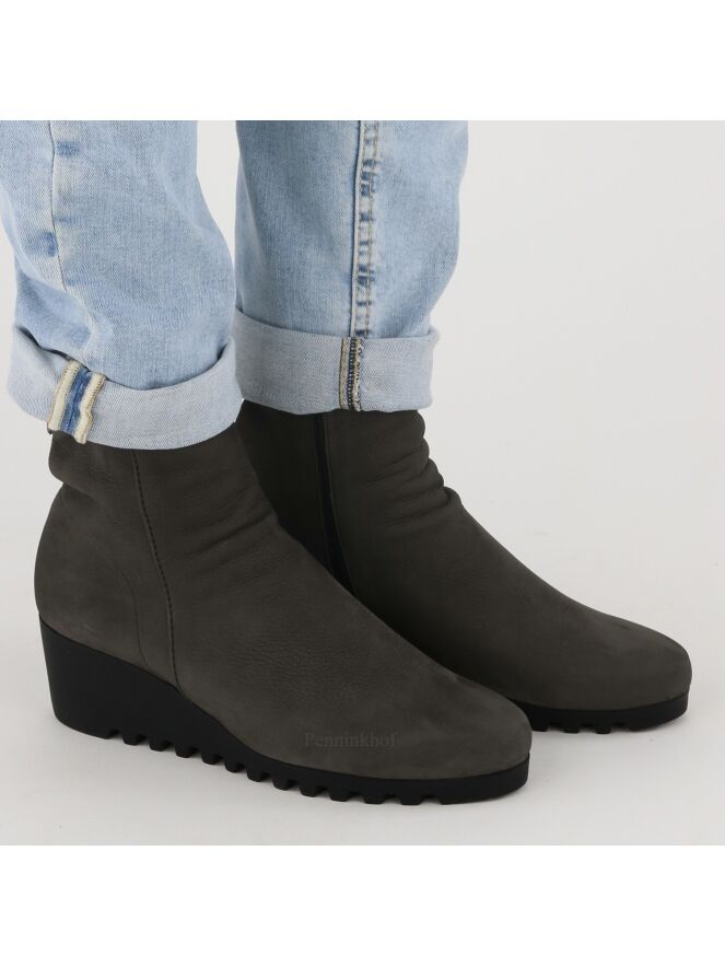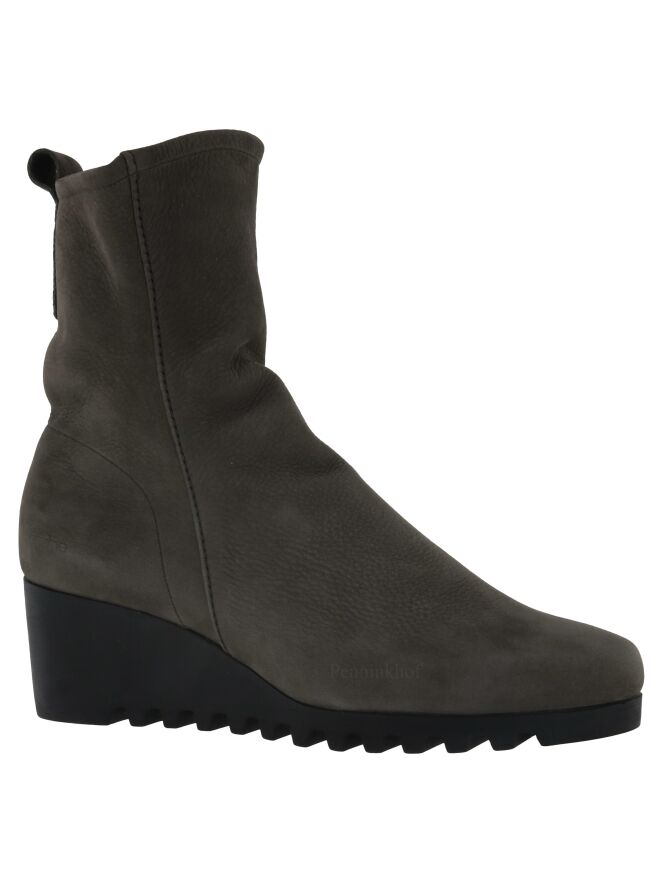 An ankle boot on a wedge heel of the brand Arche in a very soft leather in a gray color. The boot is unlined. The sole is sporty serrated.