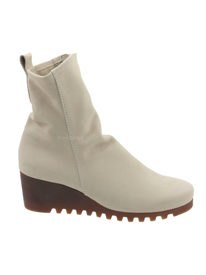 An ankle boot on a wedge heel from the brand Arche in a very soft suede in a creamy white color. The boot is unlined. The sole is sportily serrated.