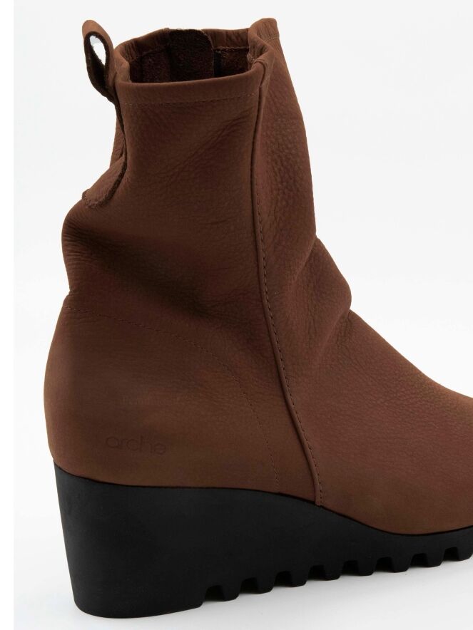 An ankle boot on a wedge by the brand Arche in a very soft leather in a cognac color. The boot is unlined. The sole is in a brown color and is sportly jagged.