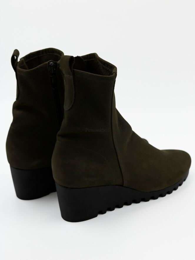 An ankle boot on a wedge heel from the Arche brand in a very soft suede in a olive green colour. The boot is unlined. The sole is sporty ridged.