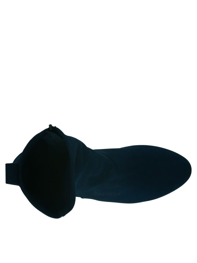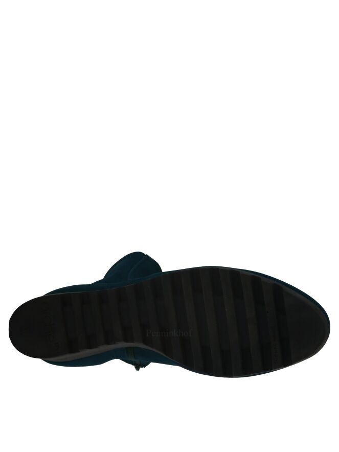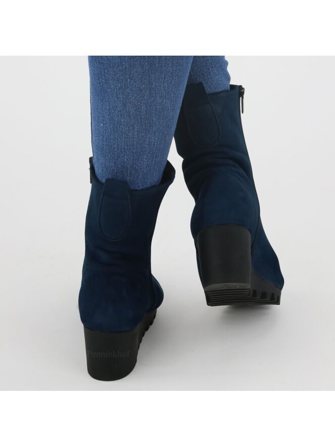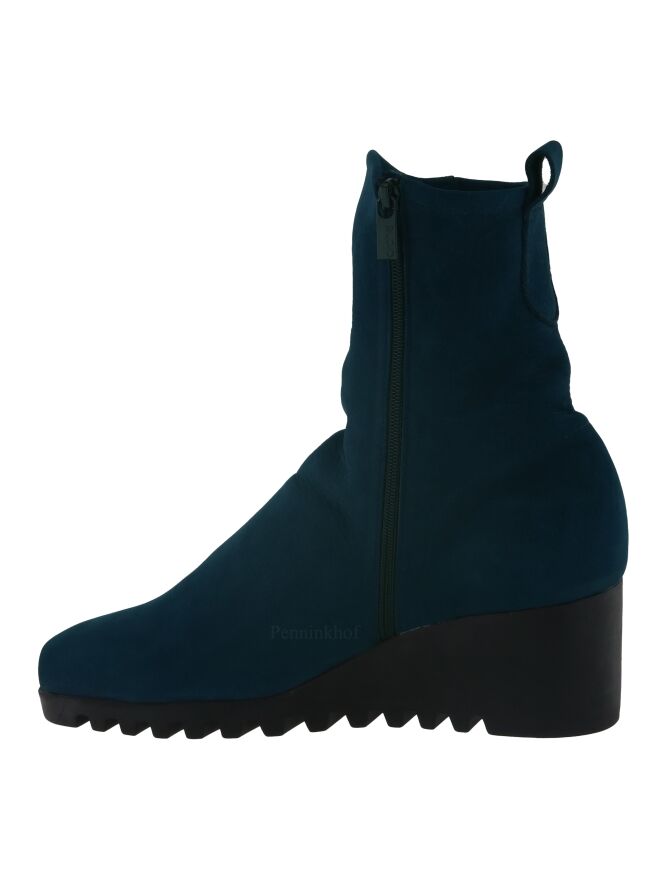 An ankle boot on a wedge heel of the brand Arche in a very soft leather in a midnight blue color. The boot is unlined. The sole is sporty serrated.