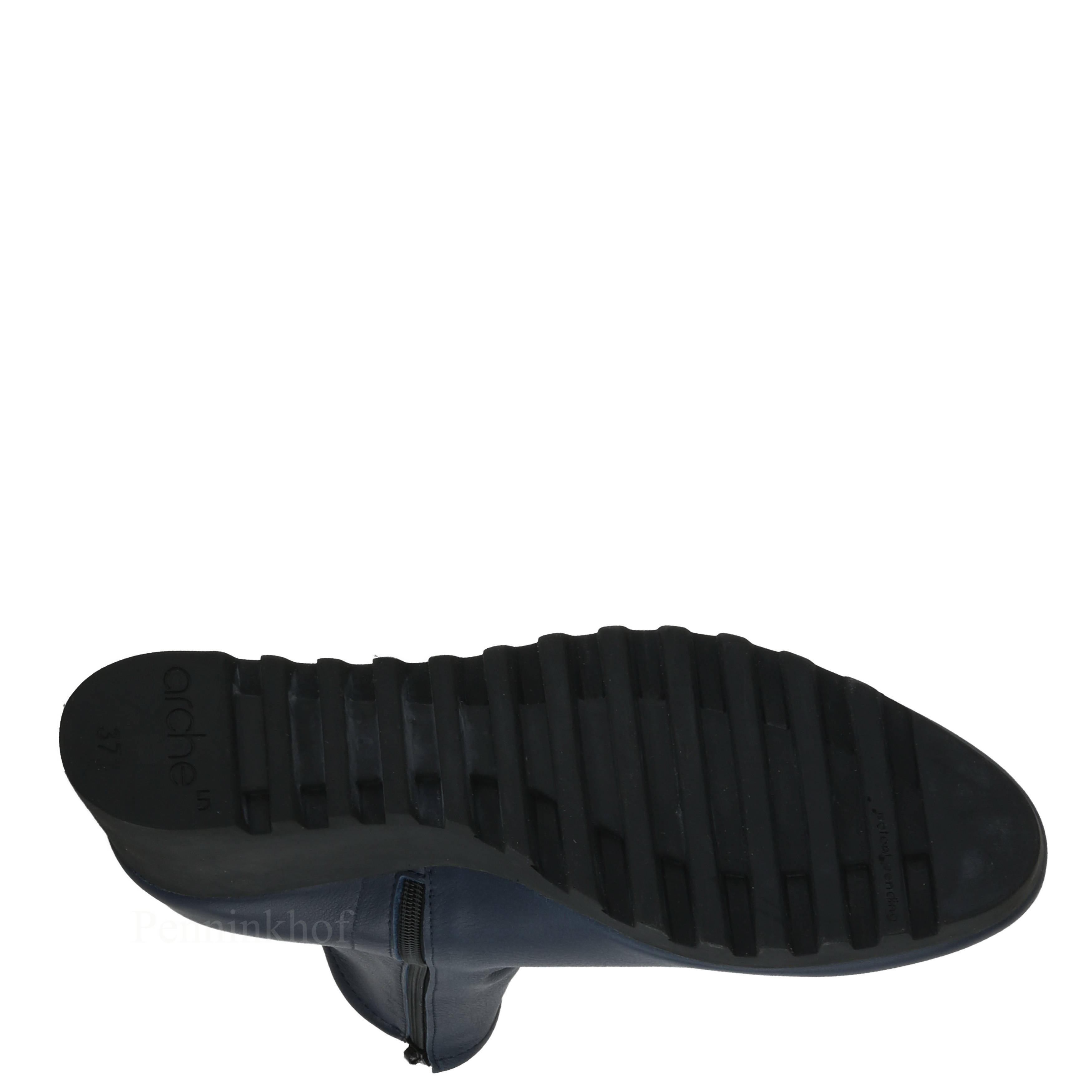 An ankle boot on a black wedge heel of the brand Arche in a very soft leather in a midnight blue color. The boot is unlined. The sole is sporty serrated.