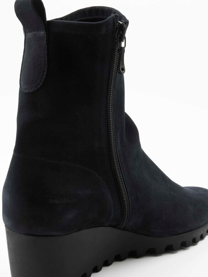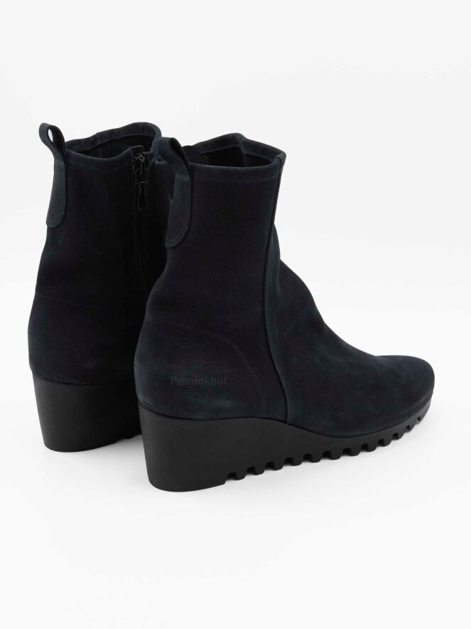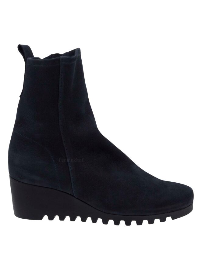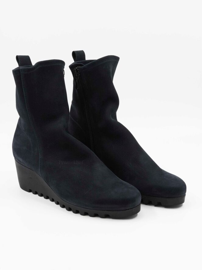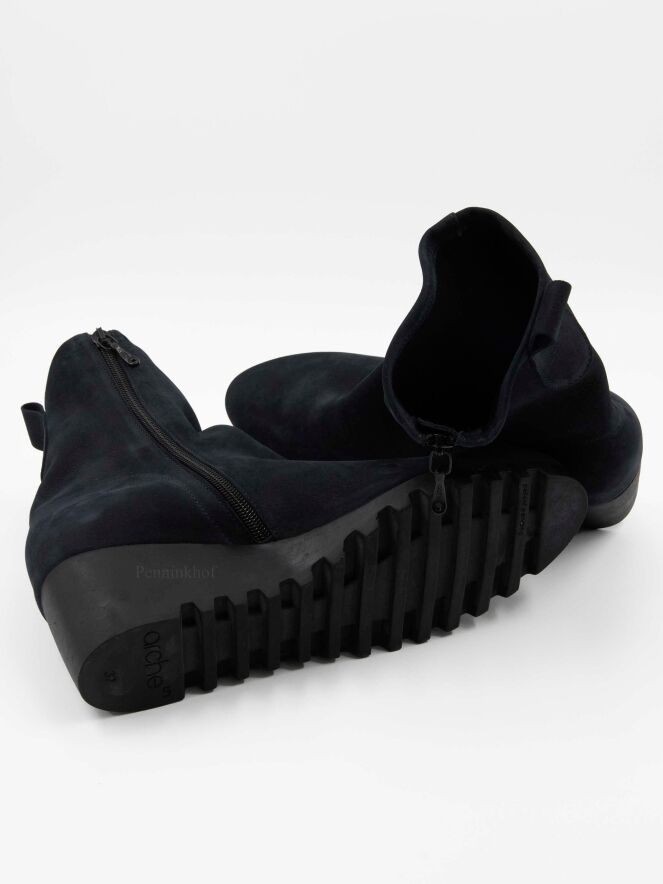 An ankle boot on a wedge heel from the brand Arche in a soft leather in a navy blue colour. The boot is unlined. The sole is sporty ridged.