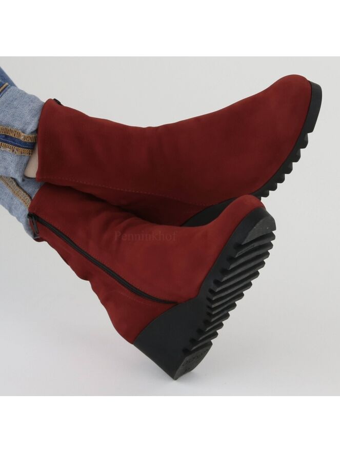 An ankle boot on a wedge of the Arche brand in a very soft leather in a black color. The boot is unlined. The sole is sportly jagged.