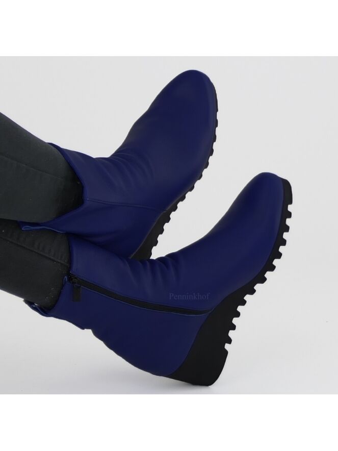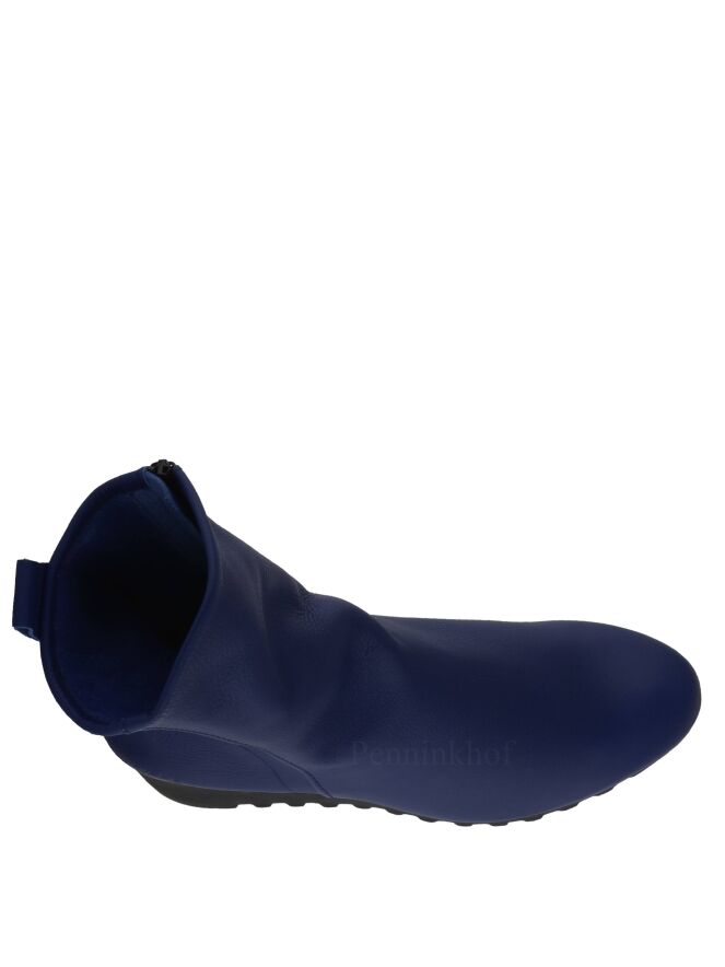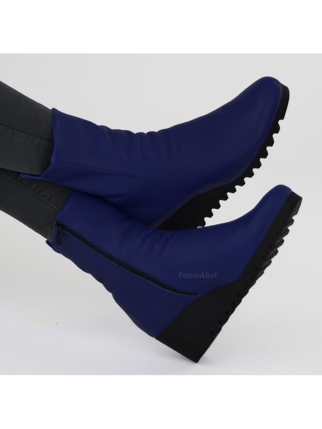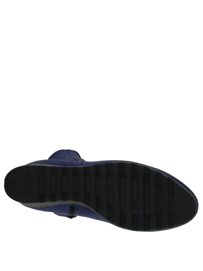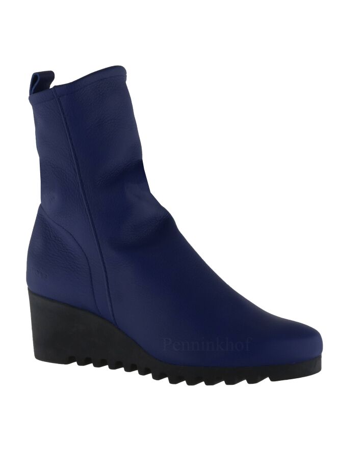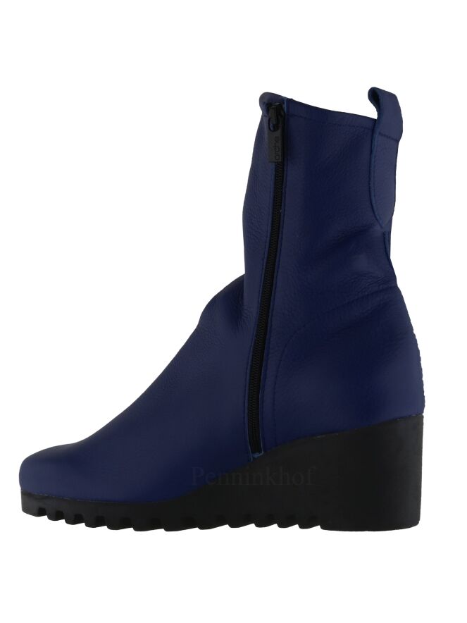 An ankle boot on a wedge heel of the brand Arche in a very soft leather in a cobalt blue color. The boot is unlined. The sole is sporty serrated.