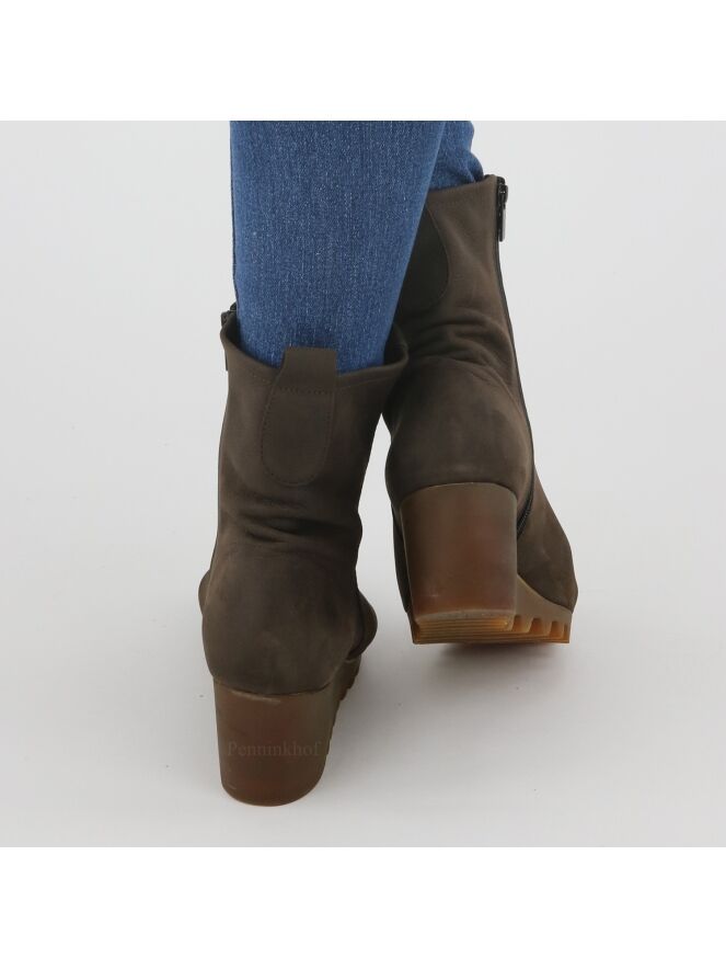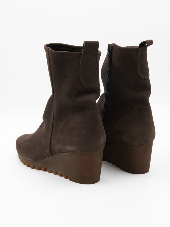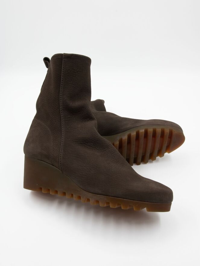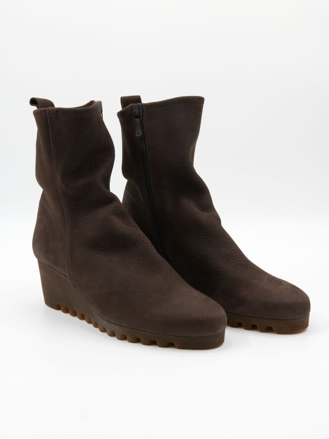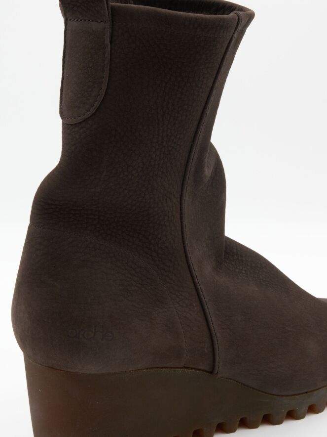 An ankle boot on a wedge by the brand Arche in a very soft leather in a mocha brown color. The boot is unlined. The sole is in a brown color and is sportly jagged.