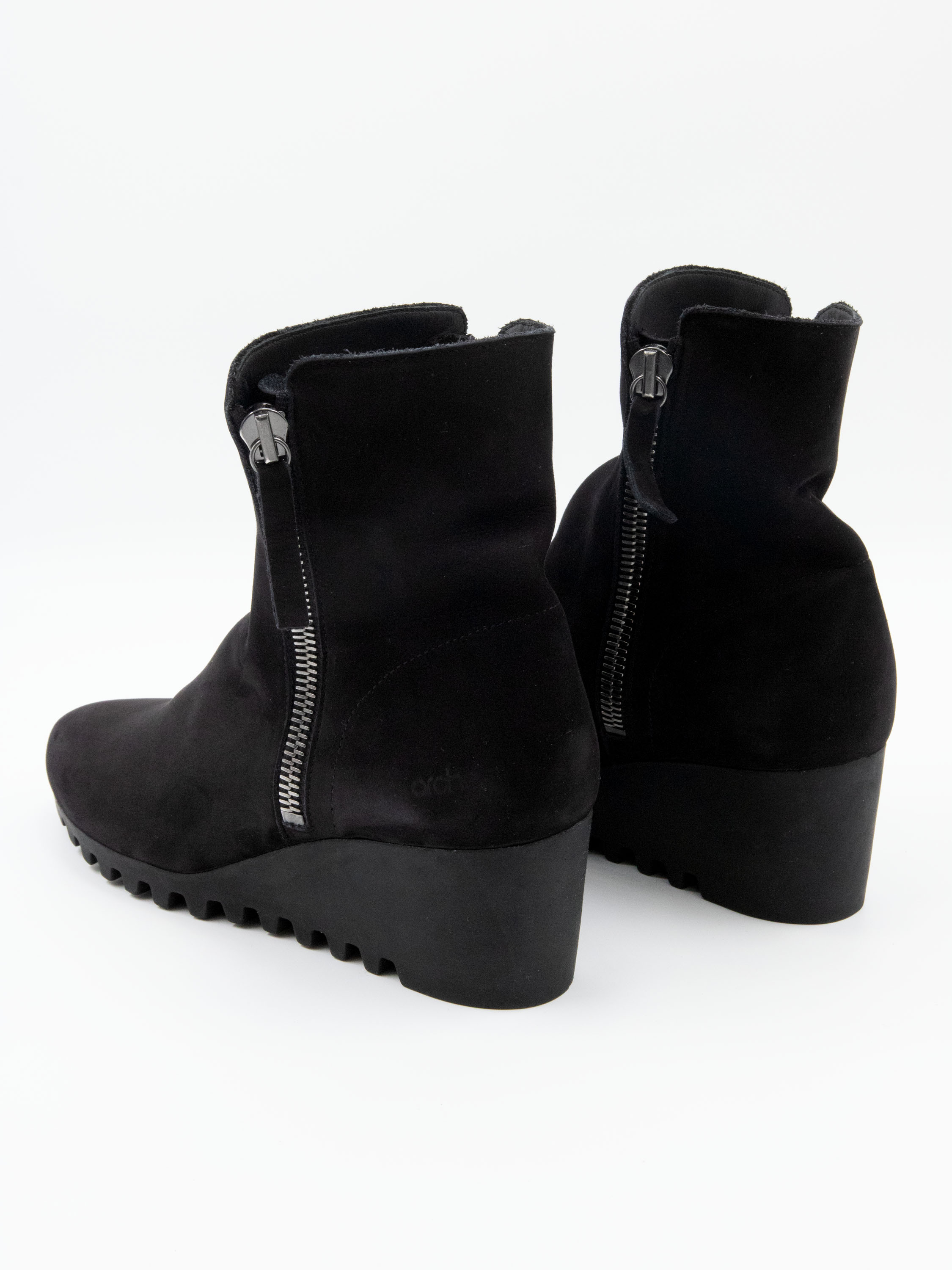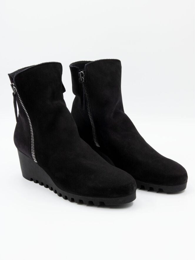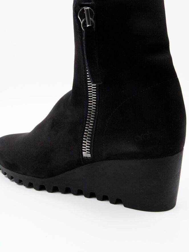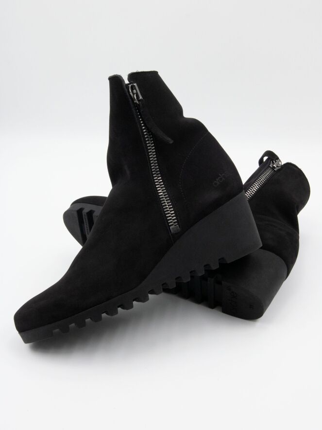 An ankle boot by Arche in black color. There is a zipper on both sides of the shaft. The latex sole has a fine checkered tread pattern. The interior of the boot is unlined.