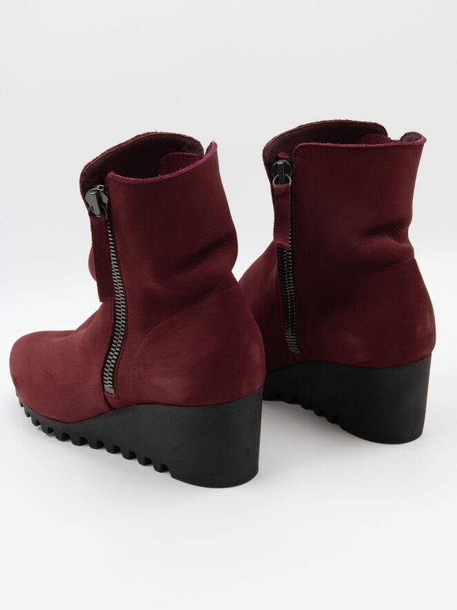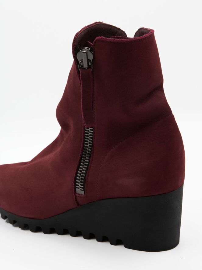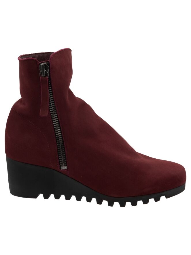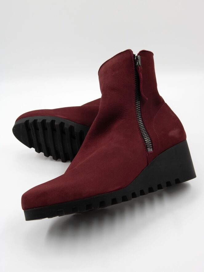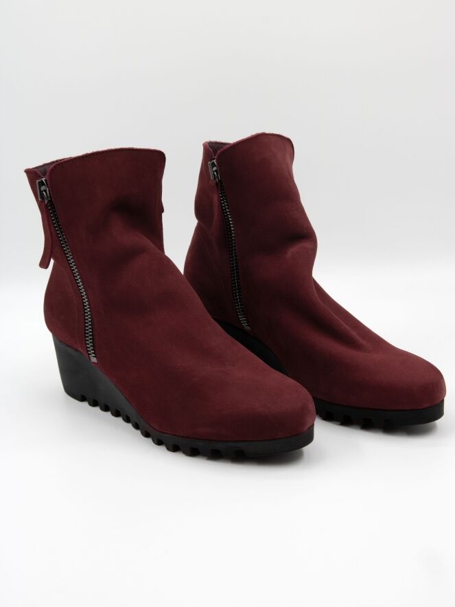 An ankle boot by Arche in a deep burgundy red. There is a zipper on both sides of the shaft. The latex sole features a fine block-pattern tread. The inside of the boot is unlined.