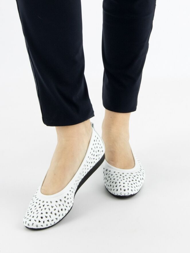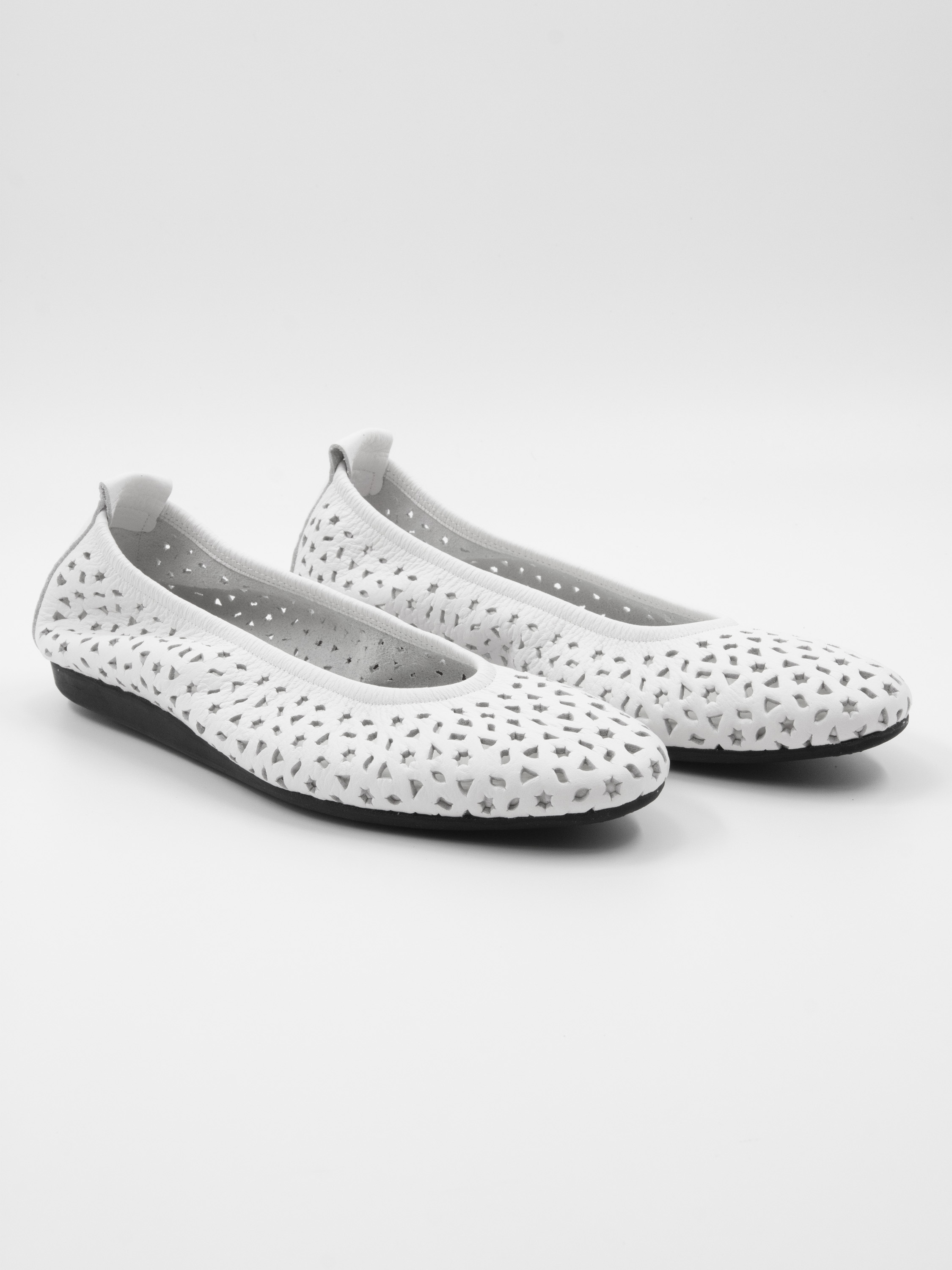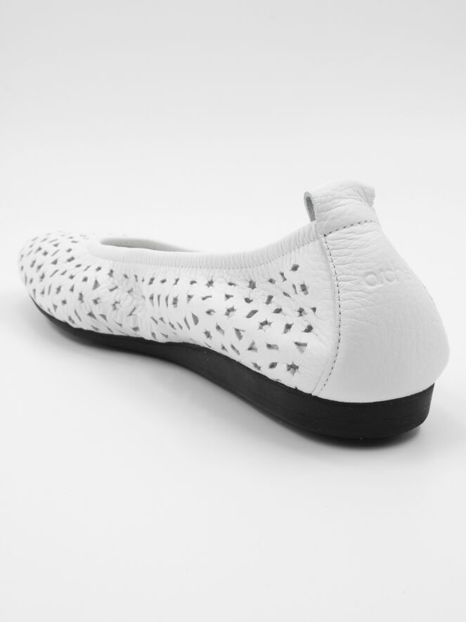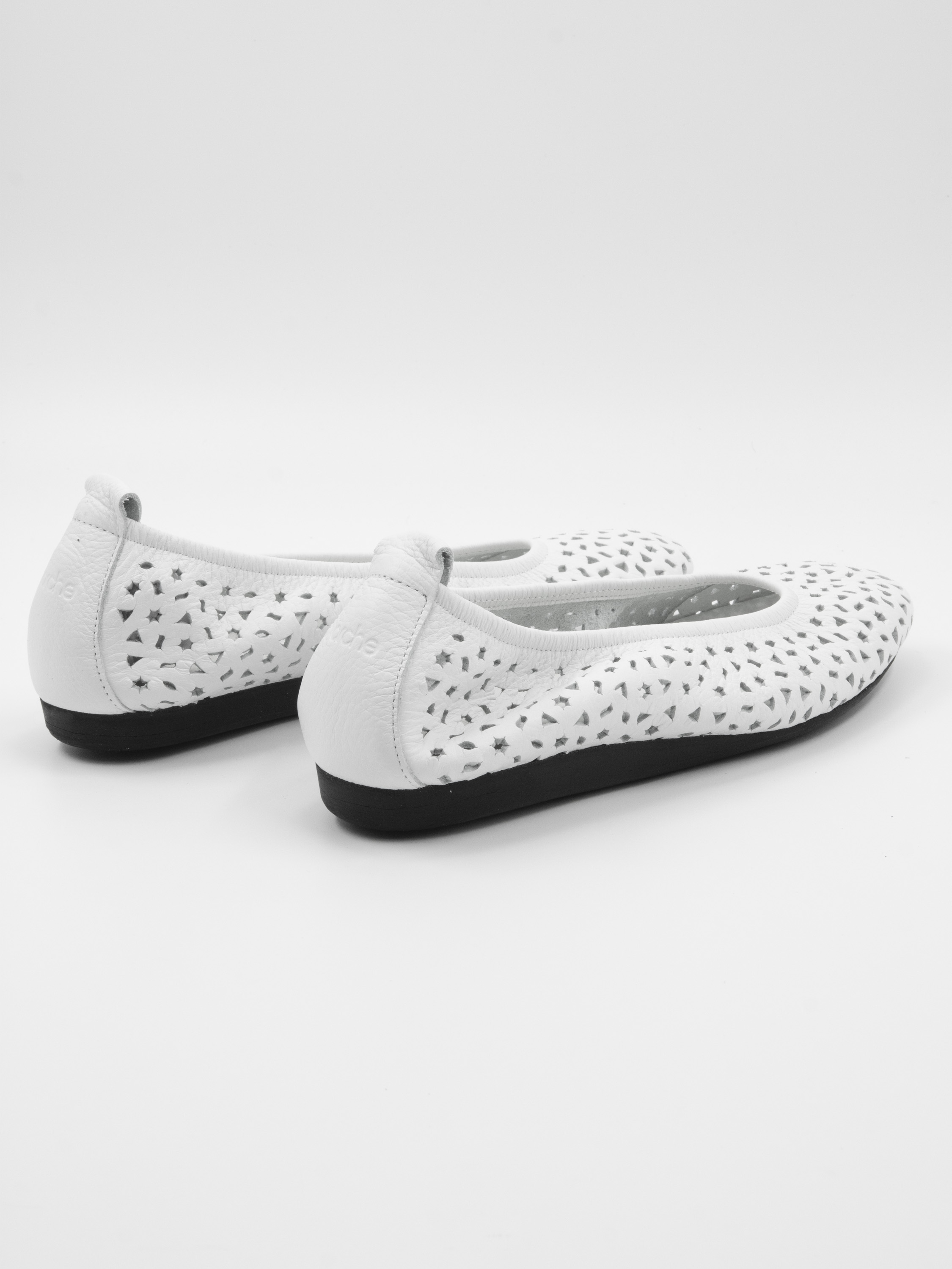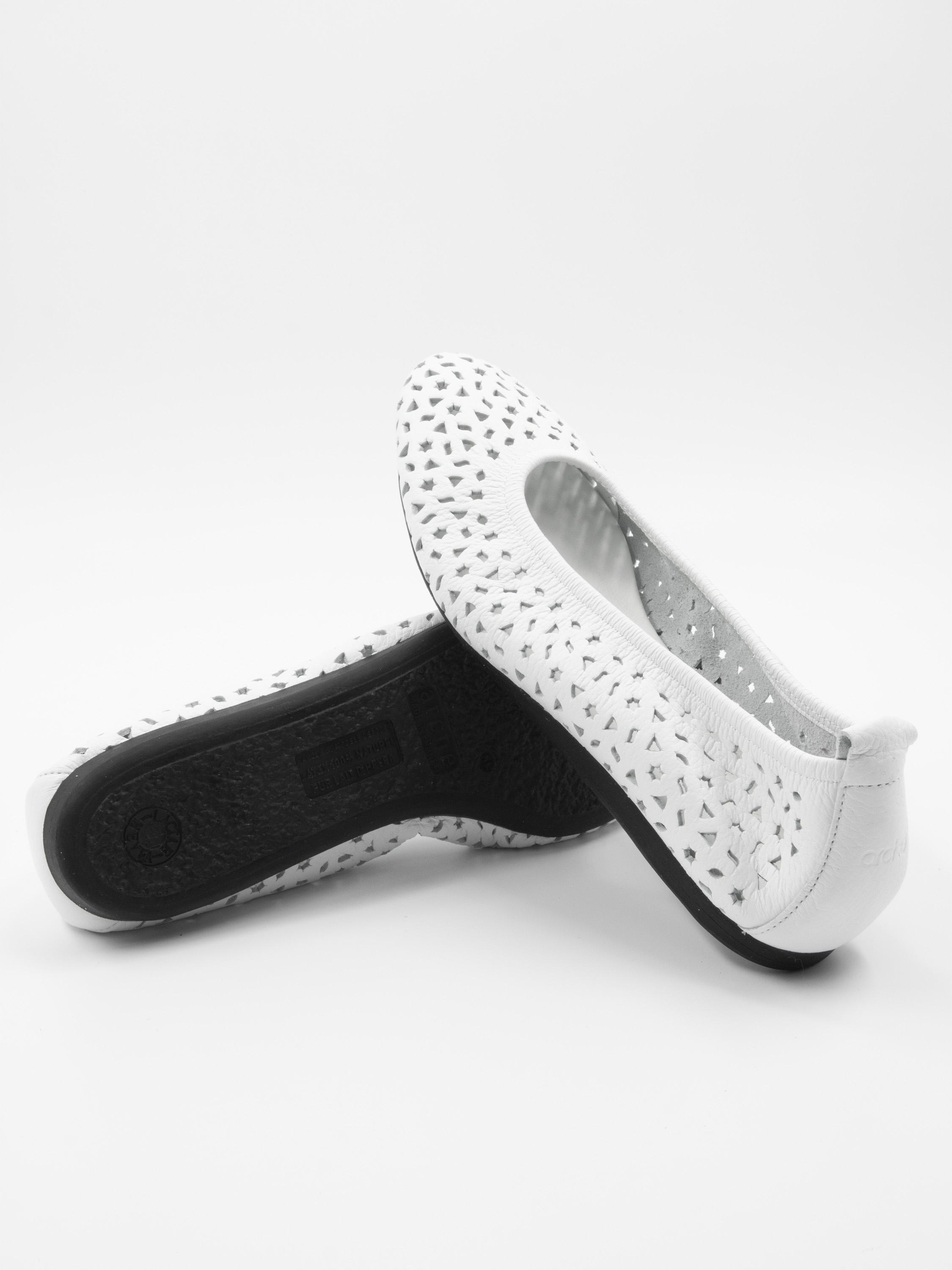 A ballerina from Arche in the colour white. The leather is perforated in multiple figures including stars and triangles. The ballerina has a round toe and is unlined.