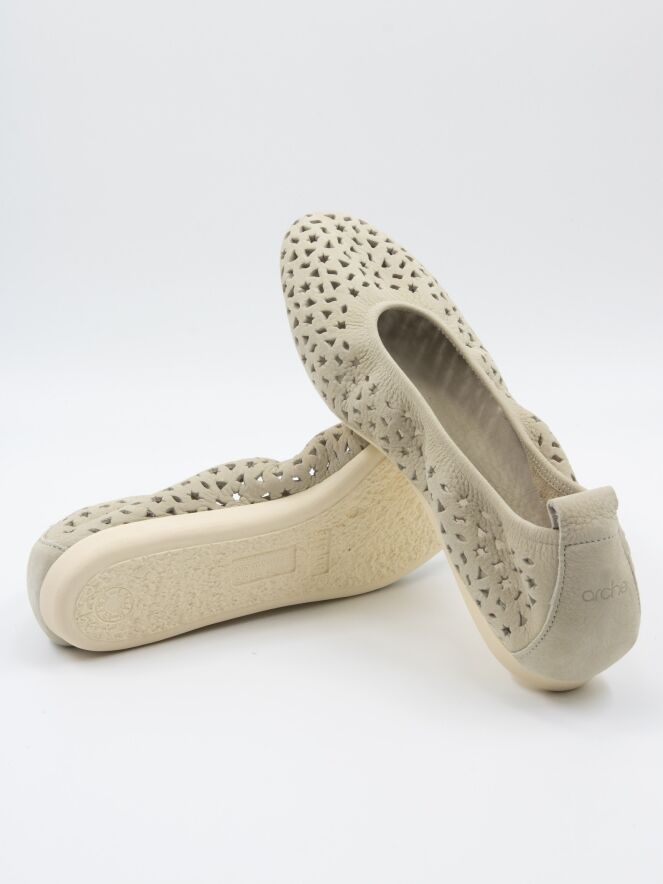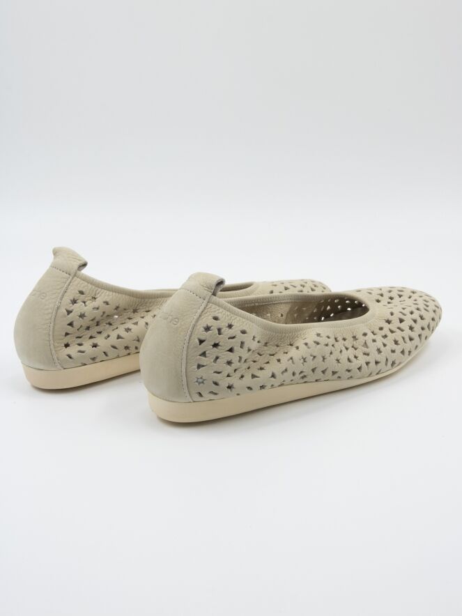 A ballerina from Arche in the colour cream white. The leather is perforated in multiple figures including stars and triangles. The ballerina has a round toe and is unlined.