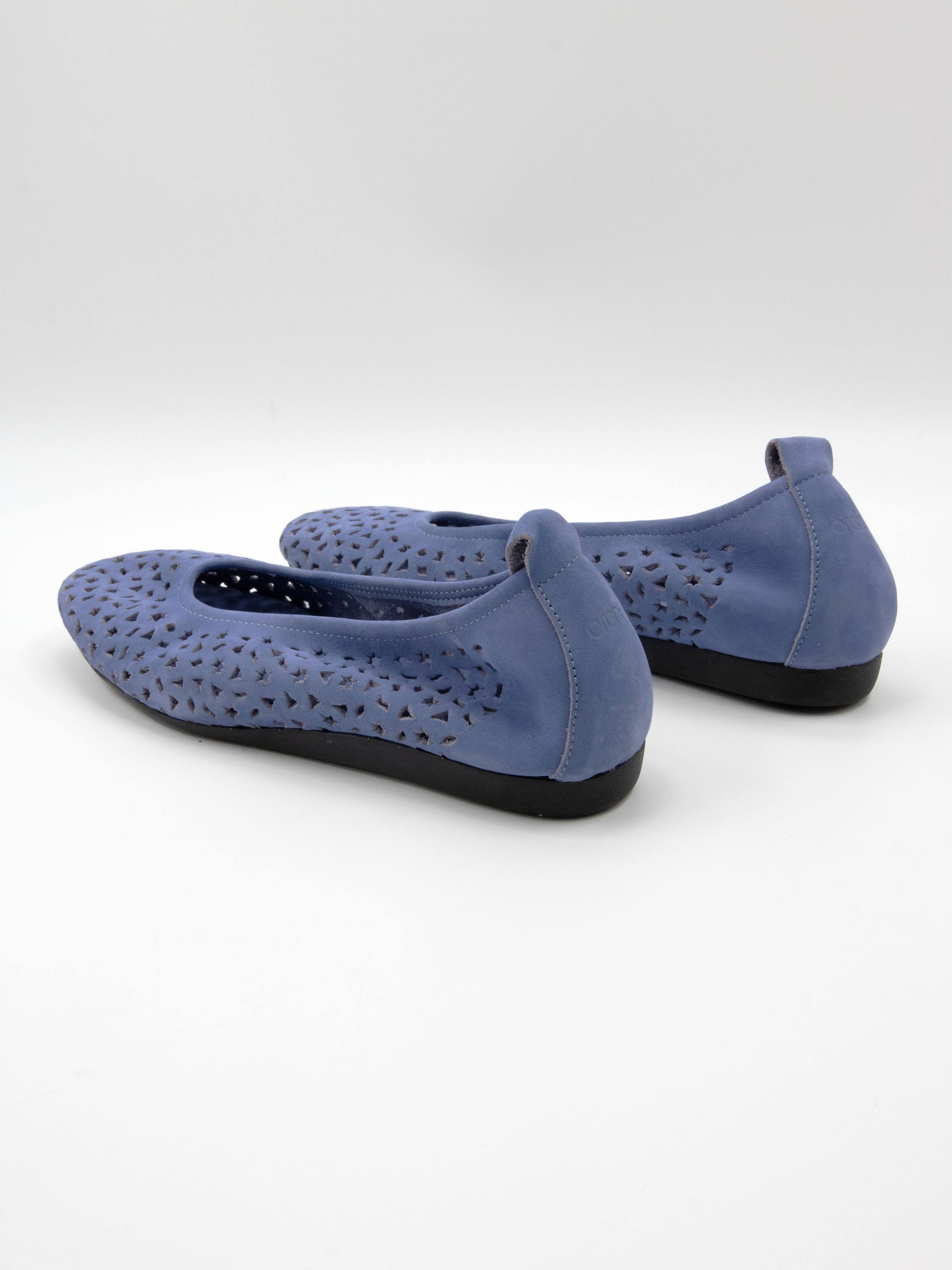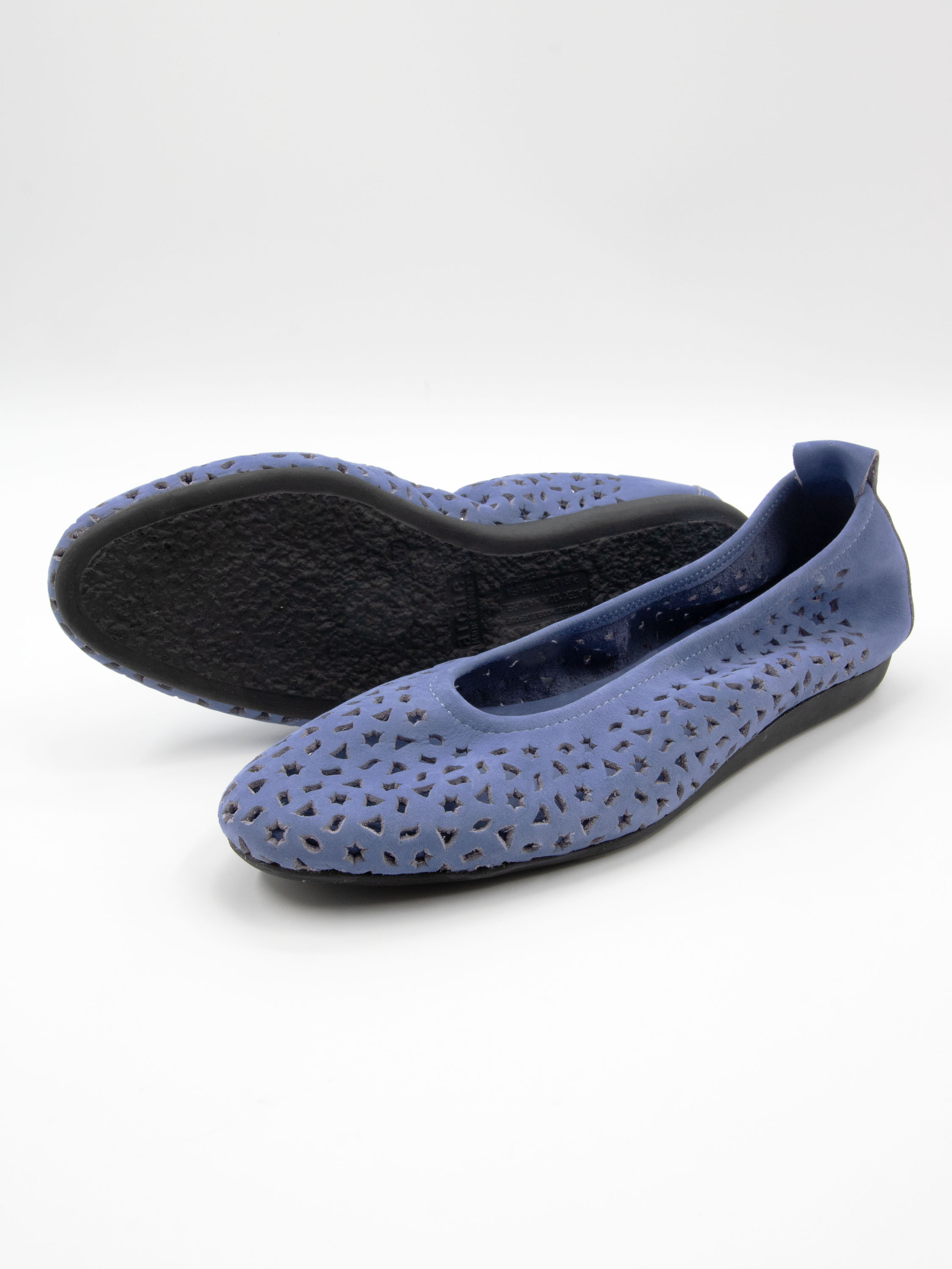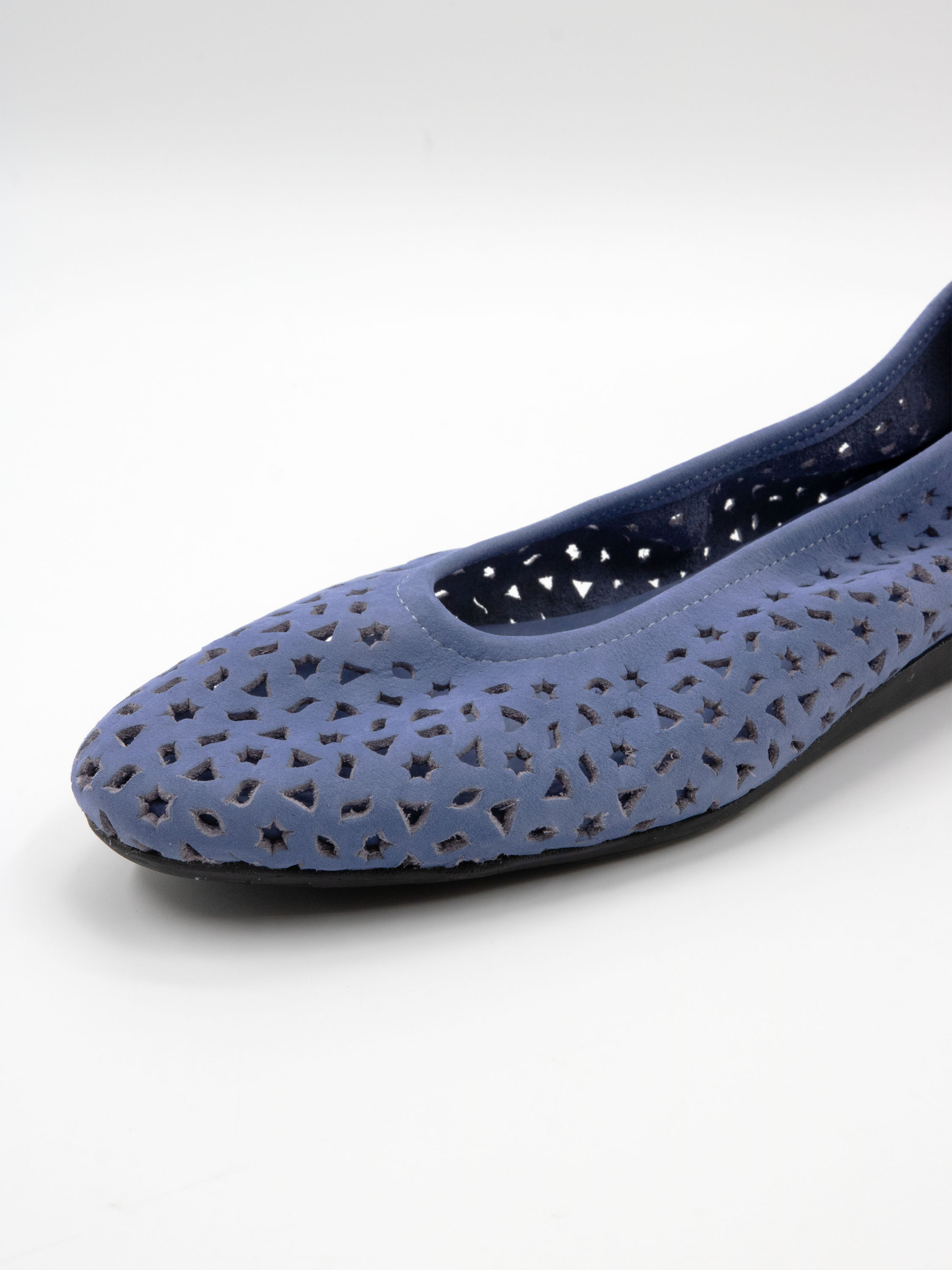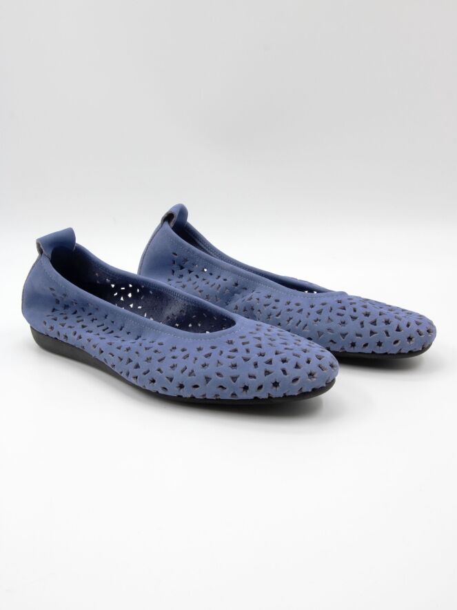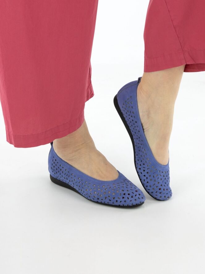 Ballerina by Arche in a soft lavender shade. The nubuck suede is perforated with delicate motifs, including small stars and triangles, creating a playful yet refined effect. Designed with a rounded toe and an unlined interior, it offers exceptional suppleness and natural comfort. The flexible latex sole provides optimal cushioning, while the slightly raised heel section enhances overall comfort.