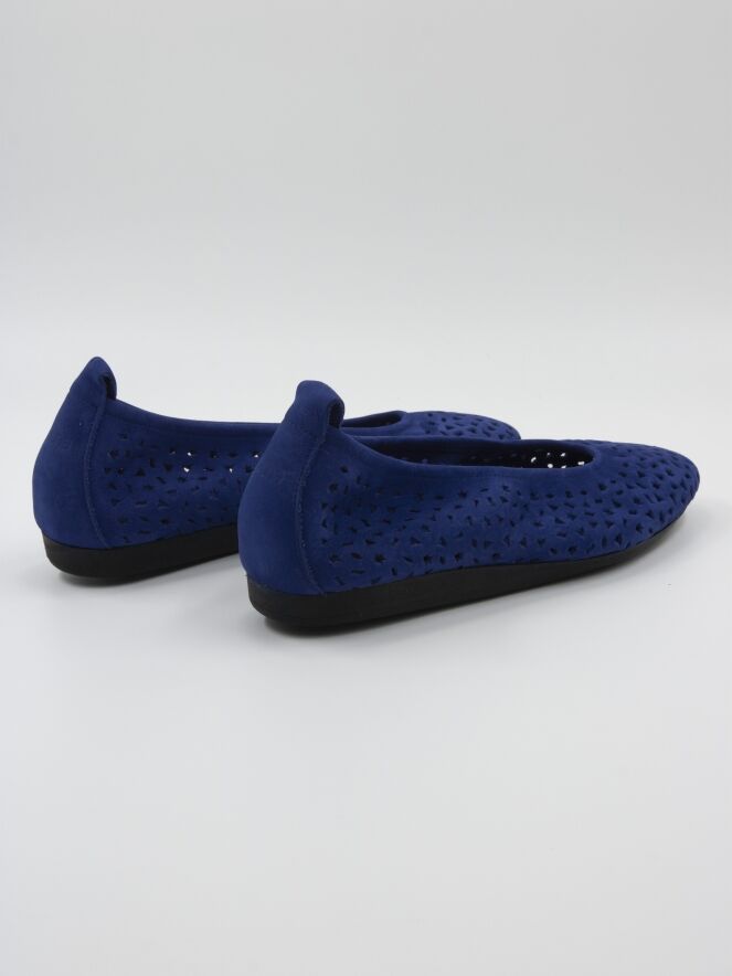 A ballerina from Arche in the color Cobaltblue. The nubuck suede is perforated with multiple patterns, including stars and triangles. The ballerina has a round toe and is unlined.