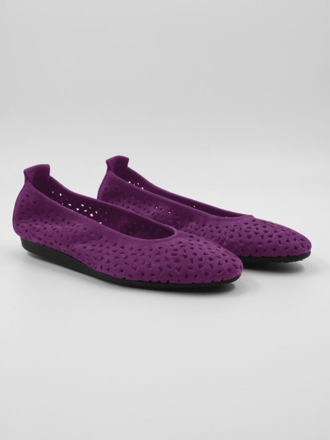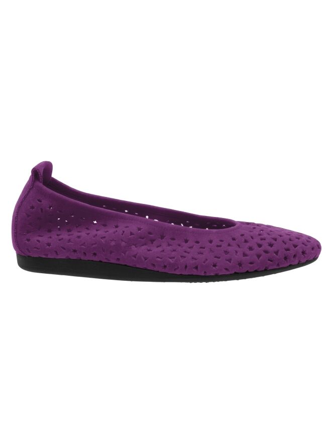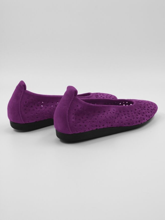 A ballerina from Arche in the color fuchsia. The nubuck suede is perforated with multiple patterns, including stars and triangles. The ballerina has a round toe and is unlined.