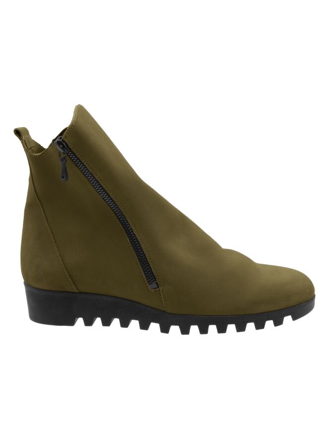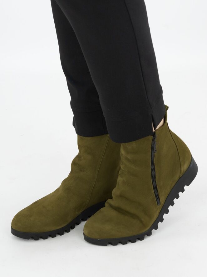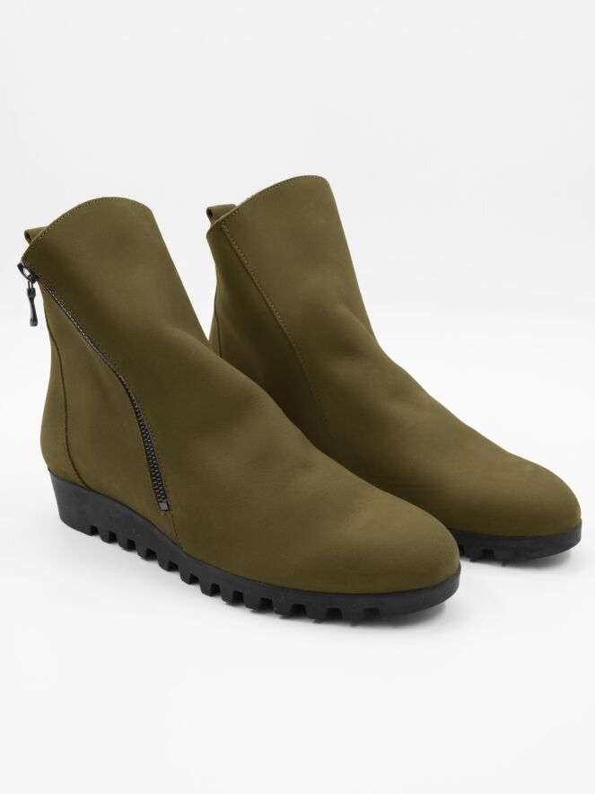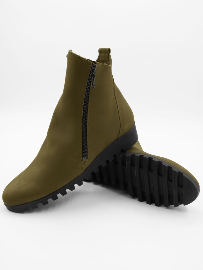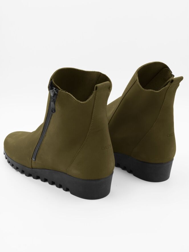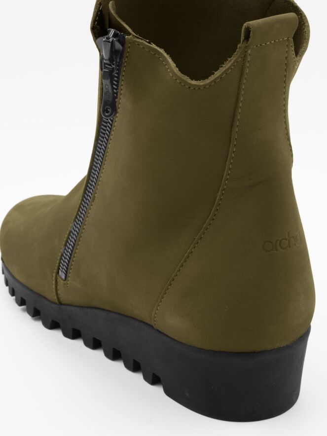 An ankle boot from Arche in olive green. On the outside is a black zip. The sole is crenellated. The boot has a round toe and the inside is unlined.