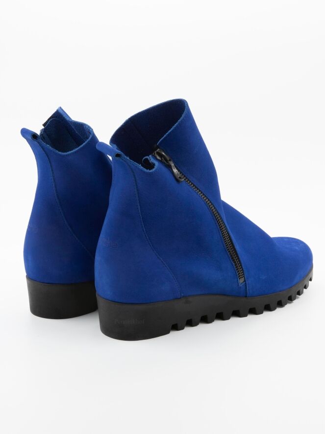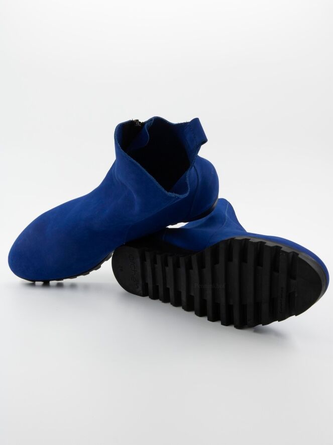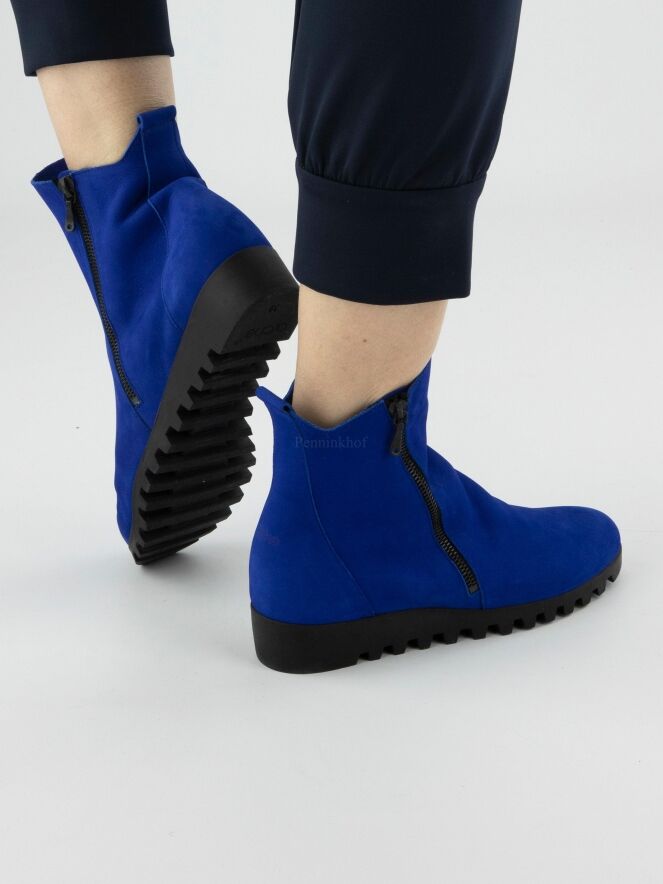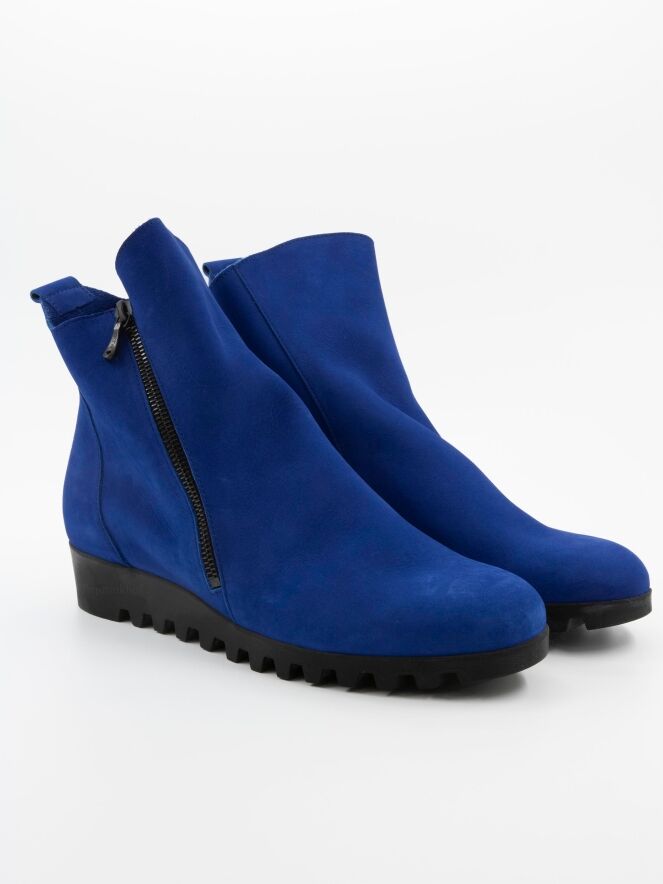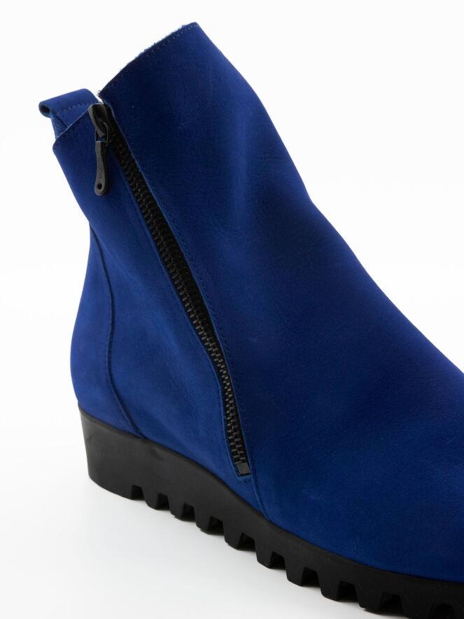 A short boot from Arche in the colour cobalt blue. There is a zip on the outside. The sole is crenellated. The boot has a round toe and the inside is unlined.