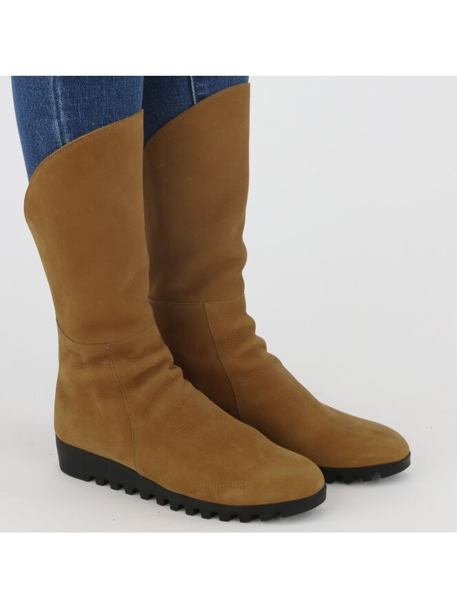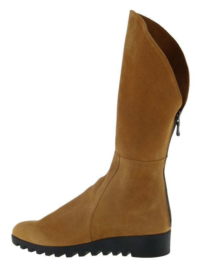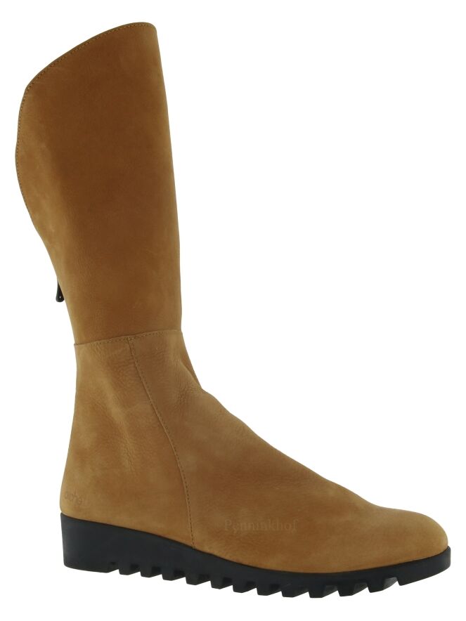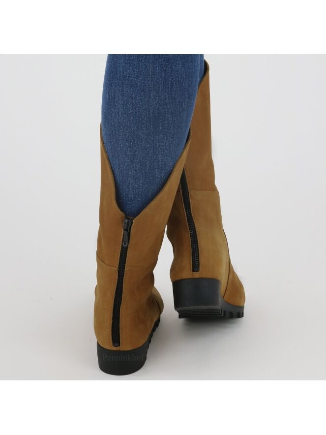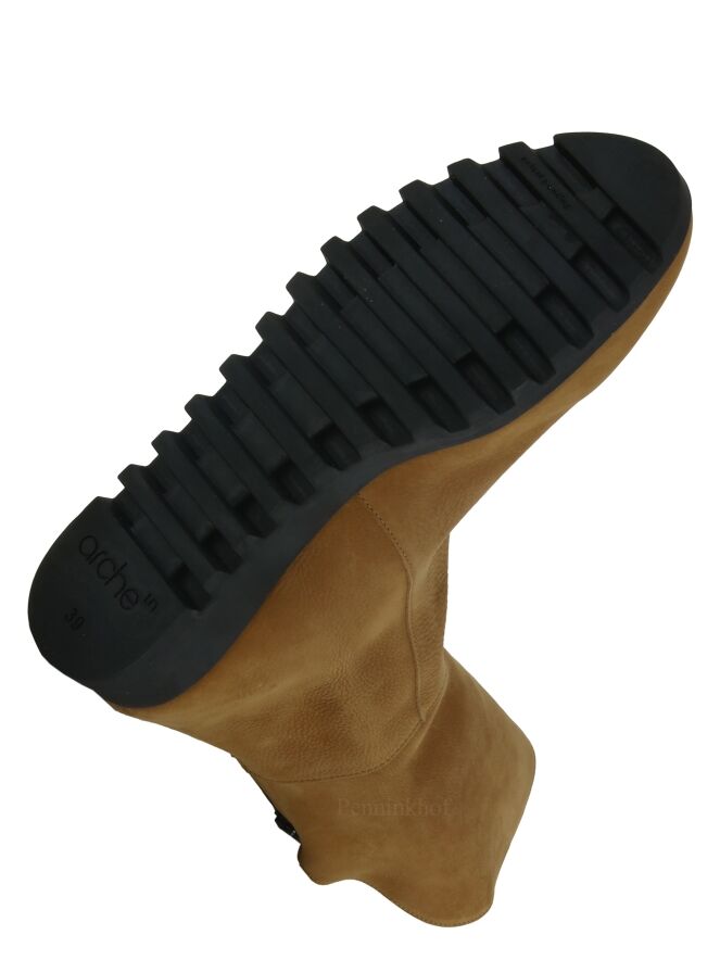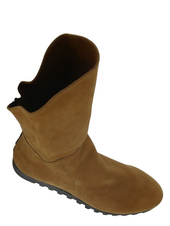 A half-high boot from Arche in the color cognac. The boot has a serrated black sole. At the back is a black zipper. The front of the shaft is 14 cm higher than the back. The inside of the shaft is unlined.