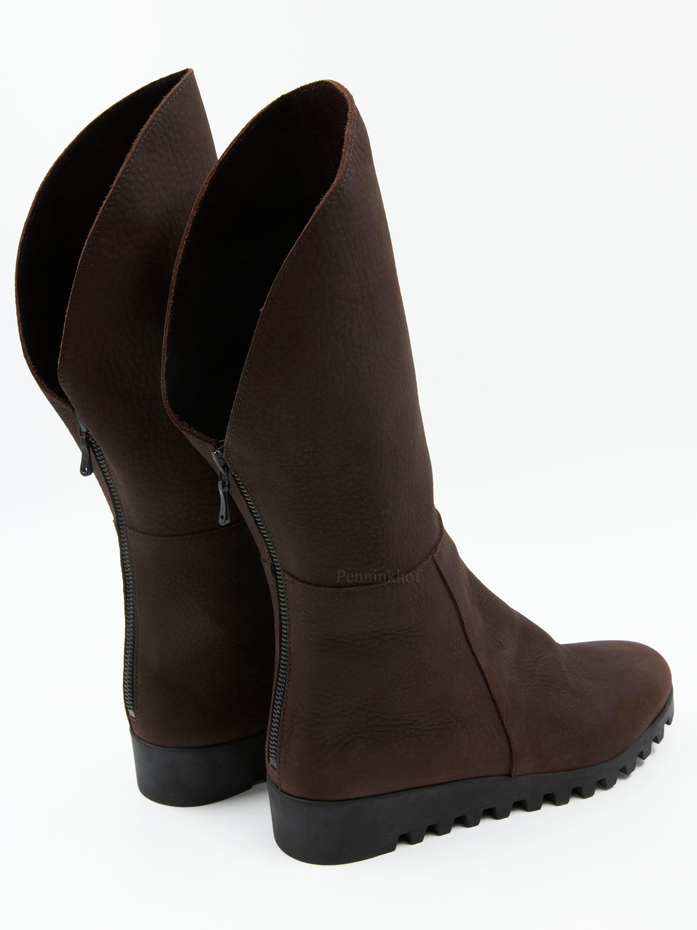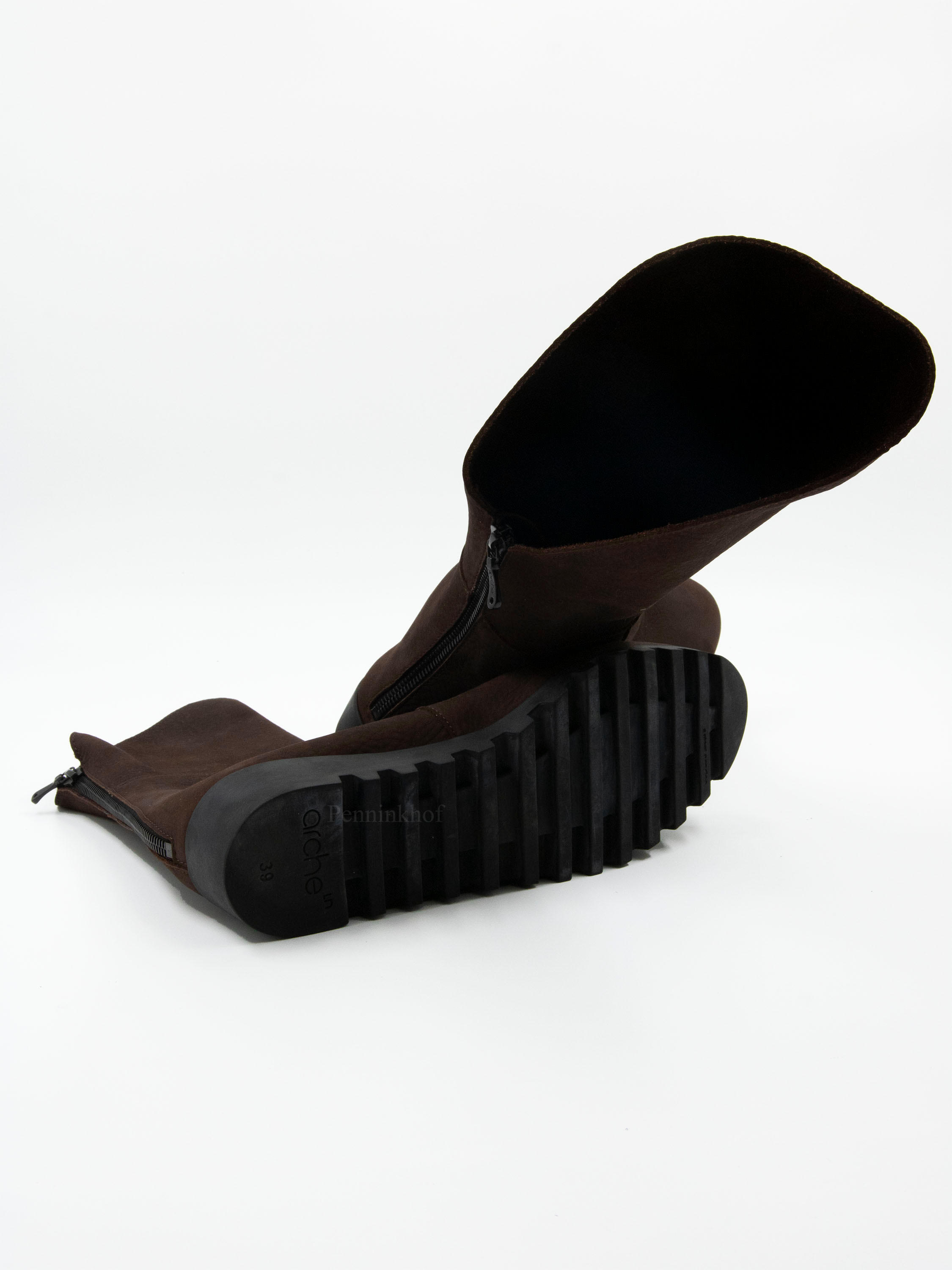 A half-high boot from Arche in the color mocha brown. The boot has a serrated black sole. At the back is a black zipper. The front of the shaft is 14 cm higher than the back. The inside of the shaft is unlined.