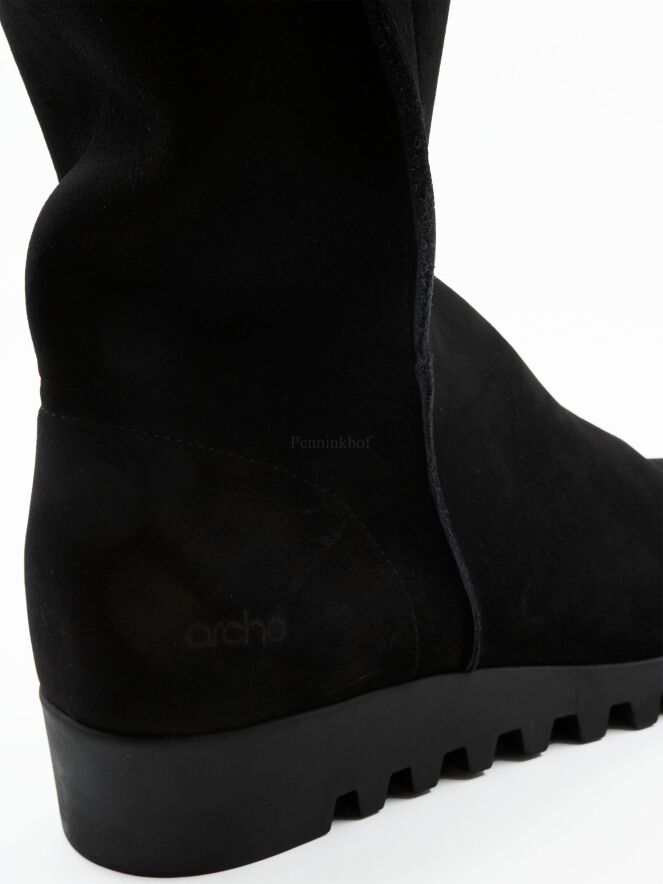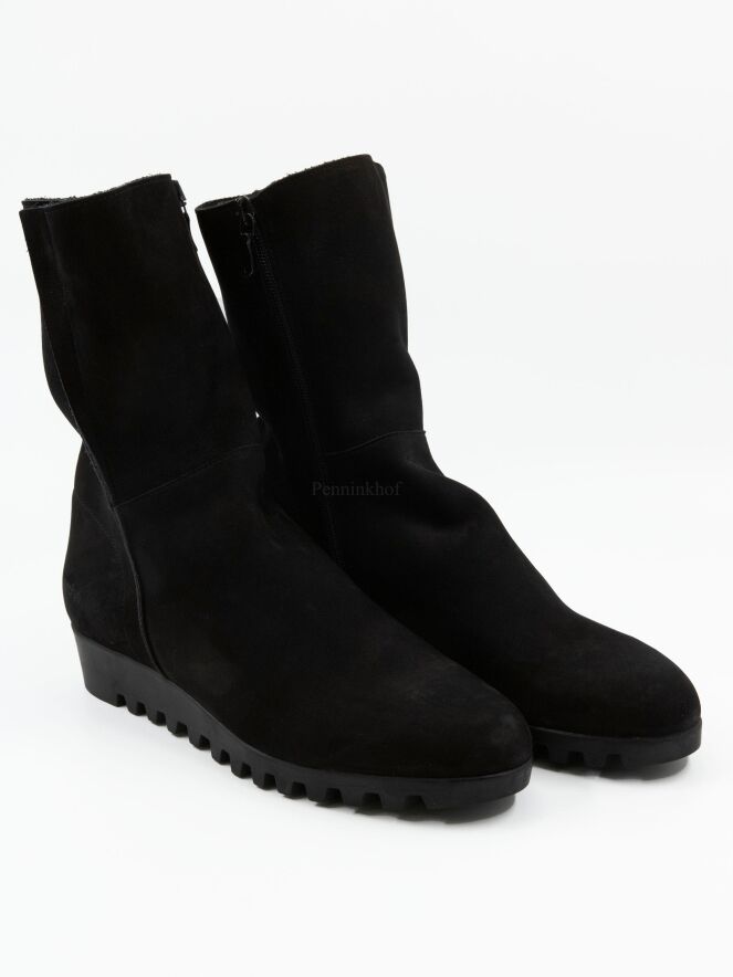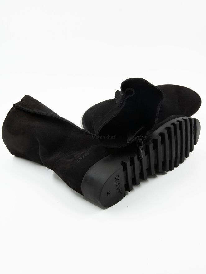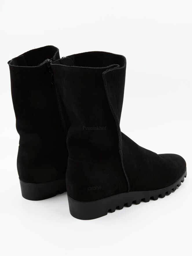 An ankle boot on a low wedge heel from the brand Arche in a soft leather in black. The boot is unlined. The sole is in a black colour and is sporty knurled.