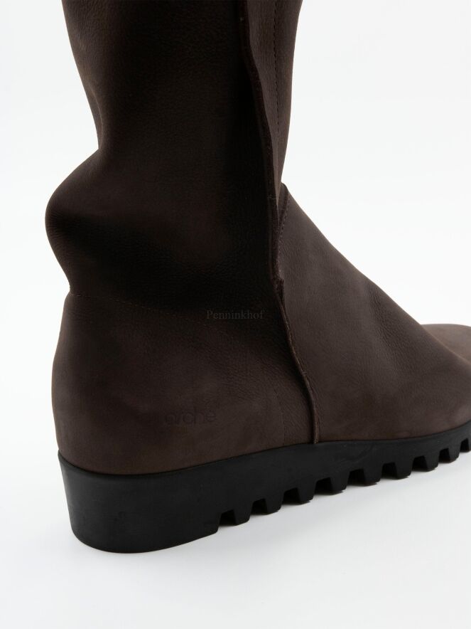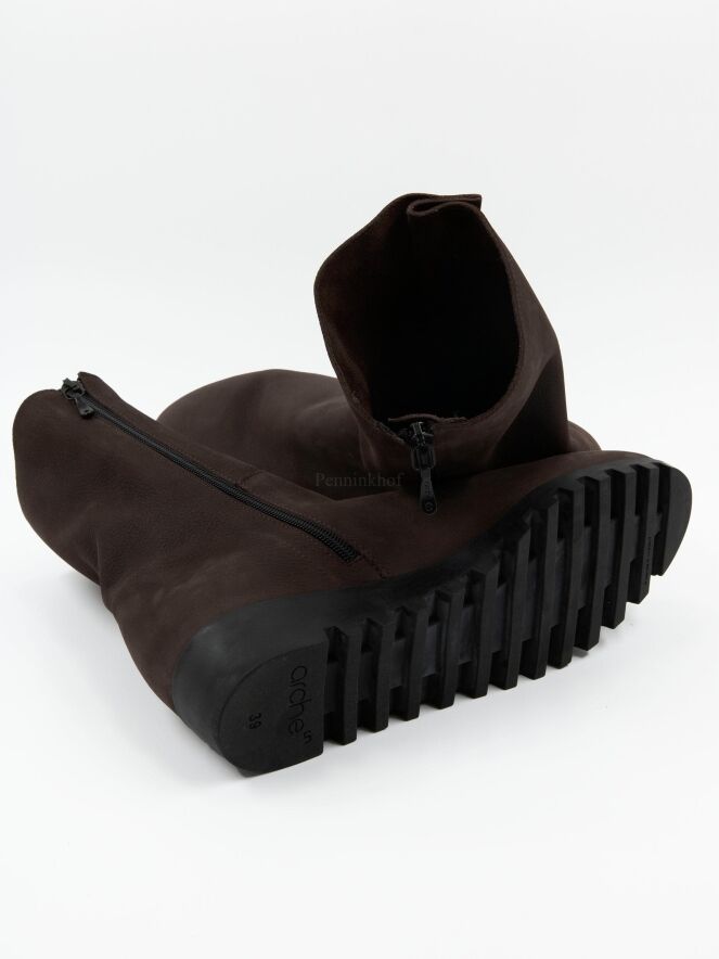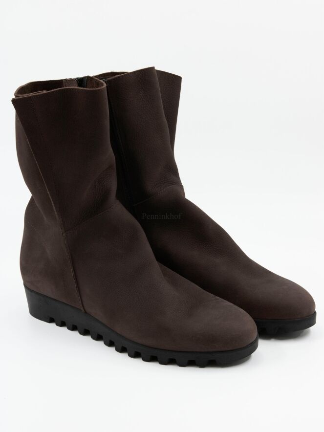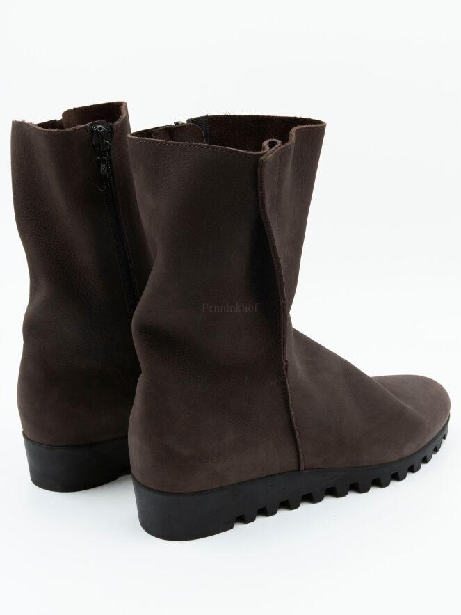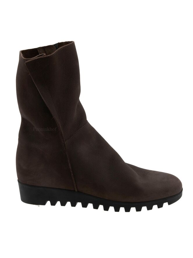 An ankle boot on a low wedge heel from the brand Arche in a soft leather in the colour mocha brown. The boot is unlined. The sole is in a black colour and is sporty knurled.
