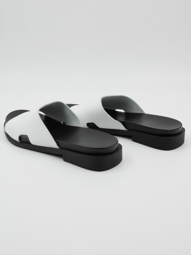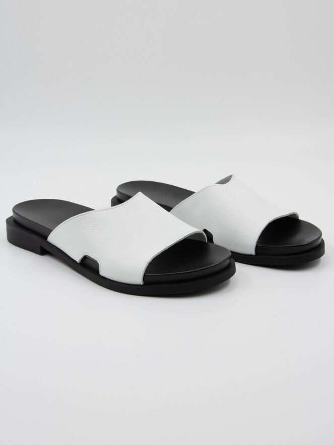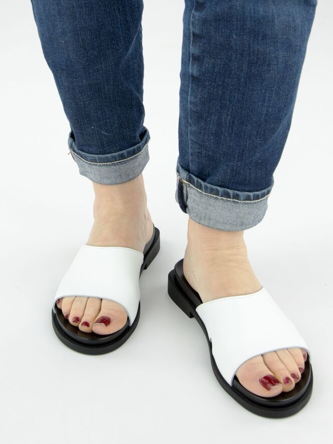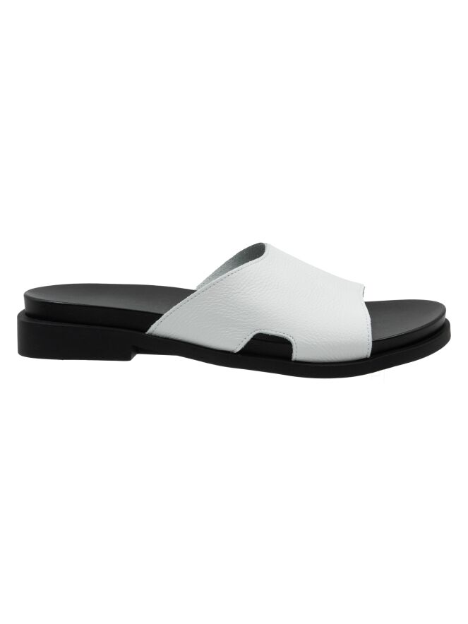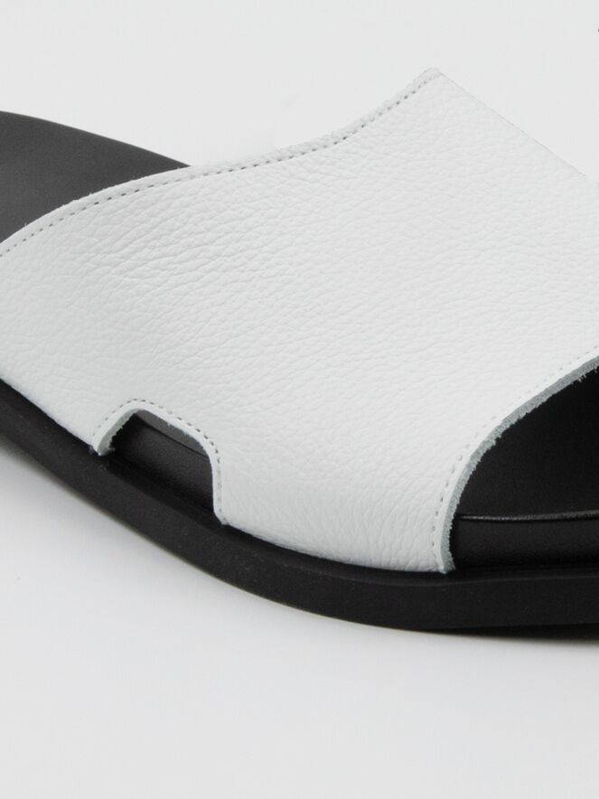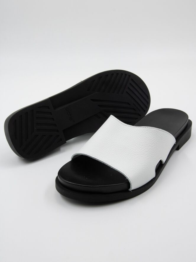 A slipper from Arche in the color white. A soft footbed has been placed on the latex sole. There is a small opening on both sides of the slipper.