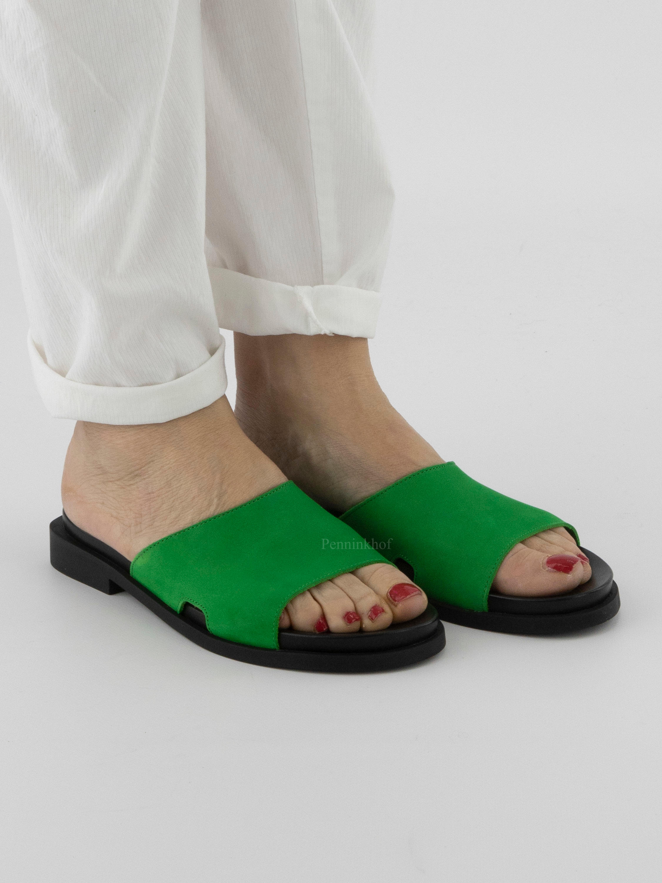 A slipper from Arche in the color green. A soft footbed has been placed on the latex sole. There is a small opening on both sides of the slipper.