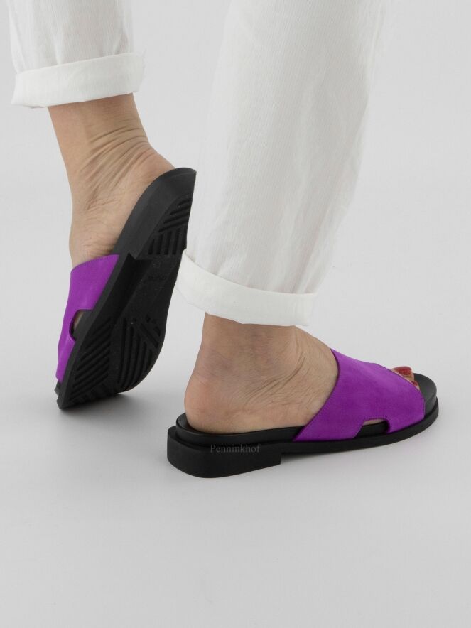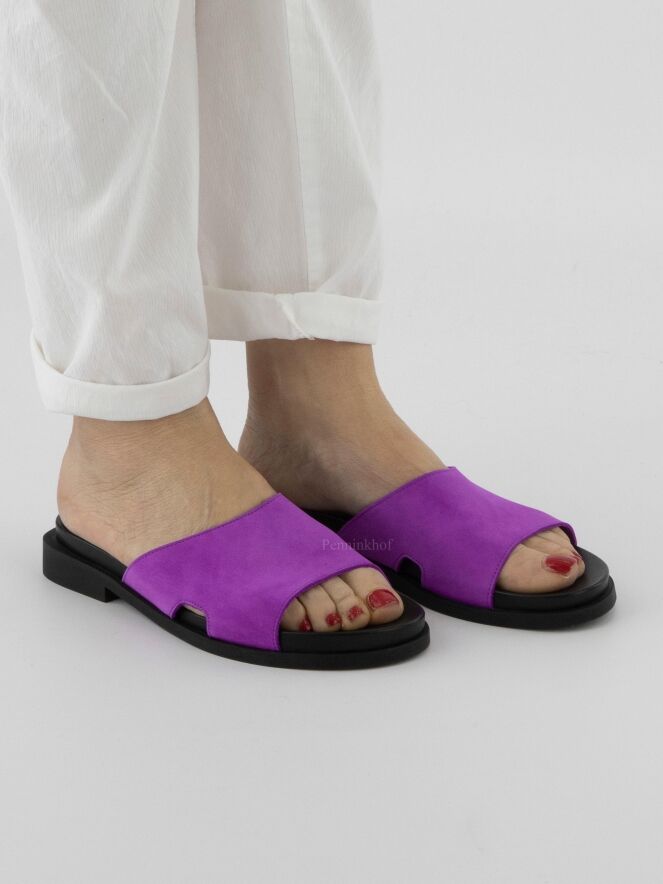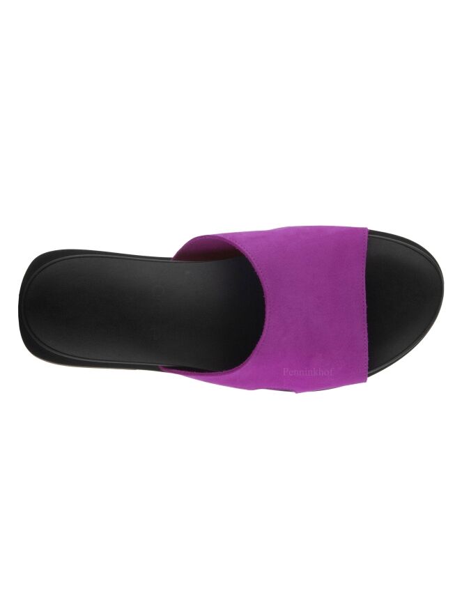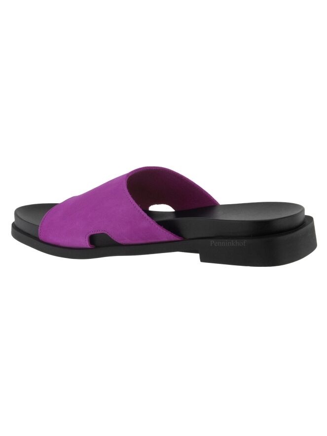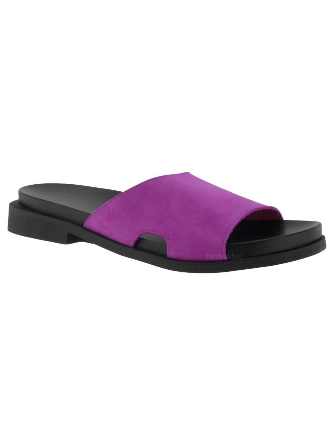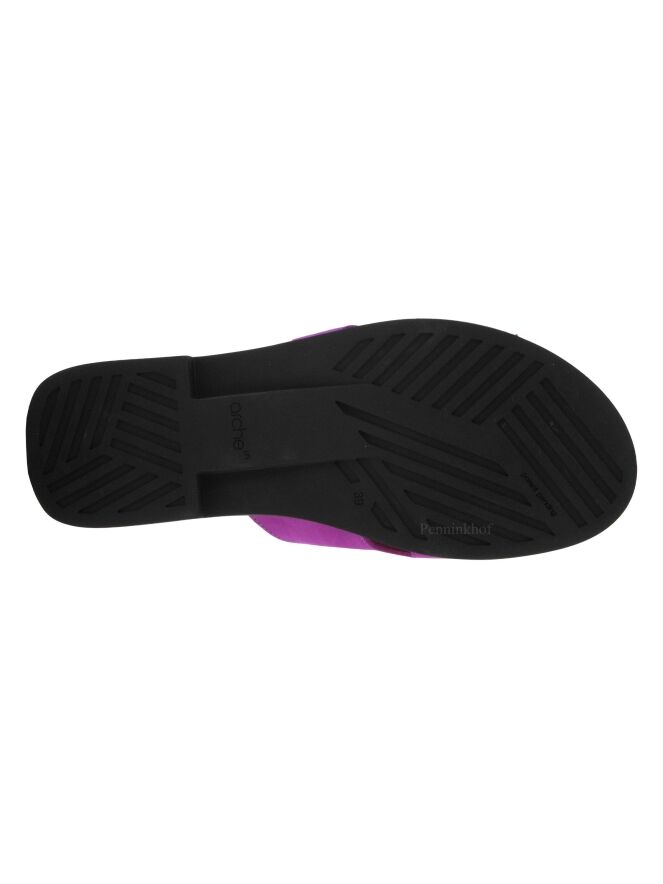 A slipper from Arche in the color fuchsia. A soft footbed has been placed on the latex sole. There is a small opening on both sides of the slipper.