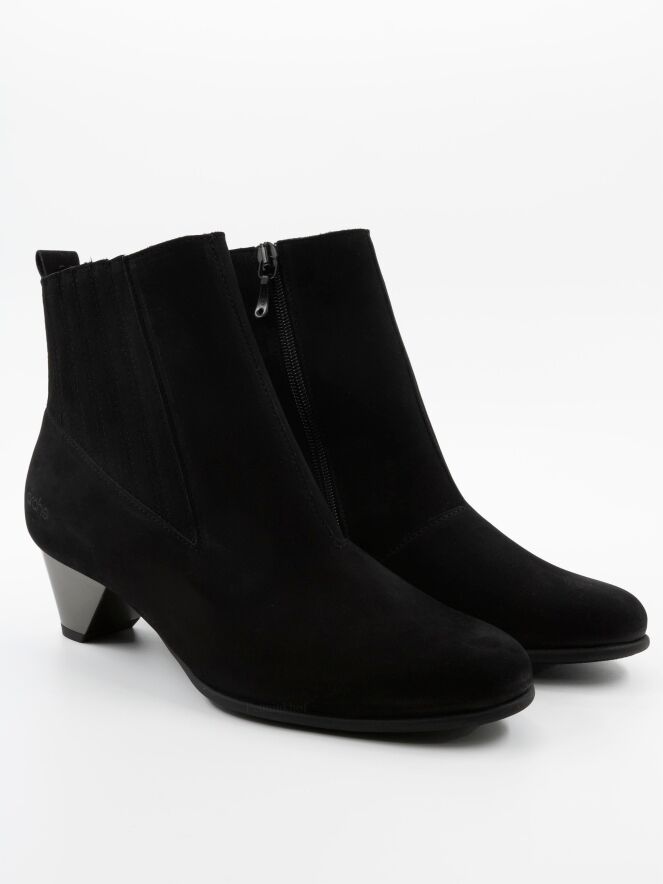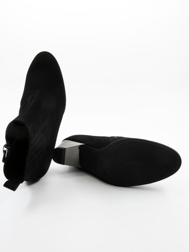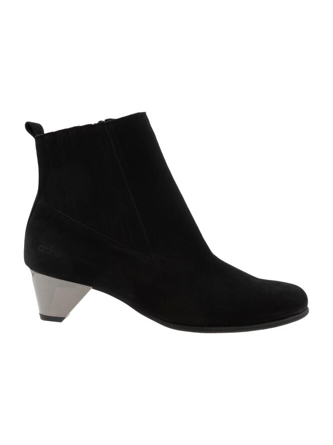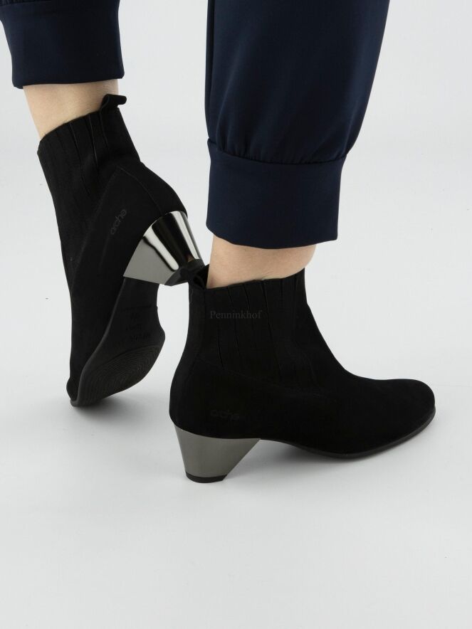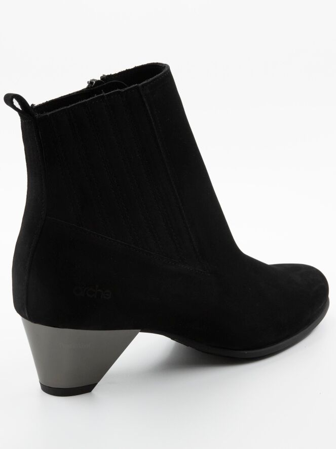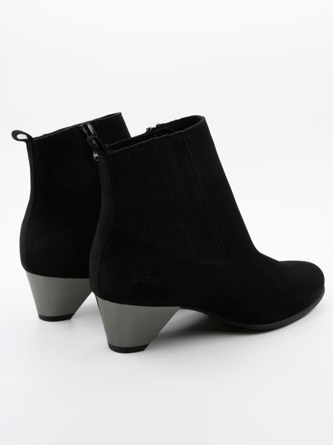A short boot from Arche in the color black. The outside of the shaft has vertical incisions behind which an elastic fabric is incorporated. On the inside of the shaft is a zipper. The short metal heel is in a nickel color. The inside is unlined.