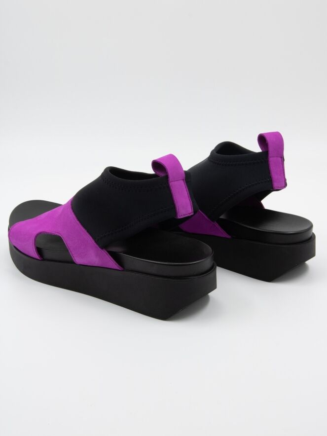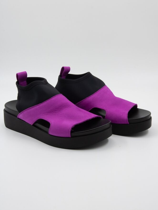 A sandal by Arche with a platform sole in purple color. From the top of the forefoot to the ankle is a black elastic fabric.
