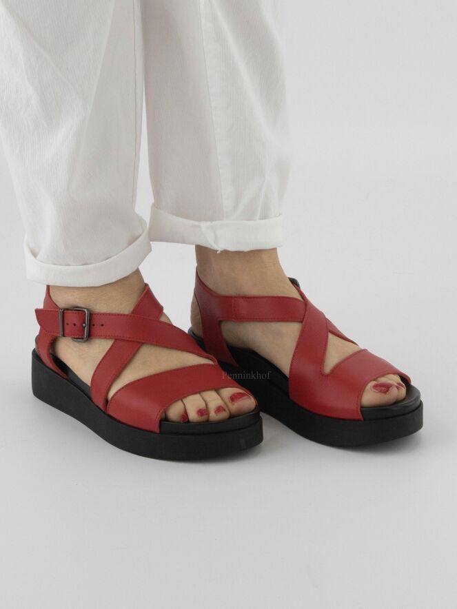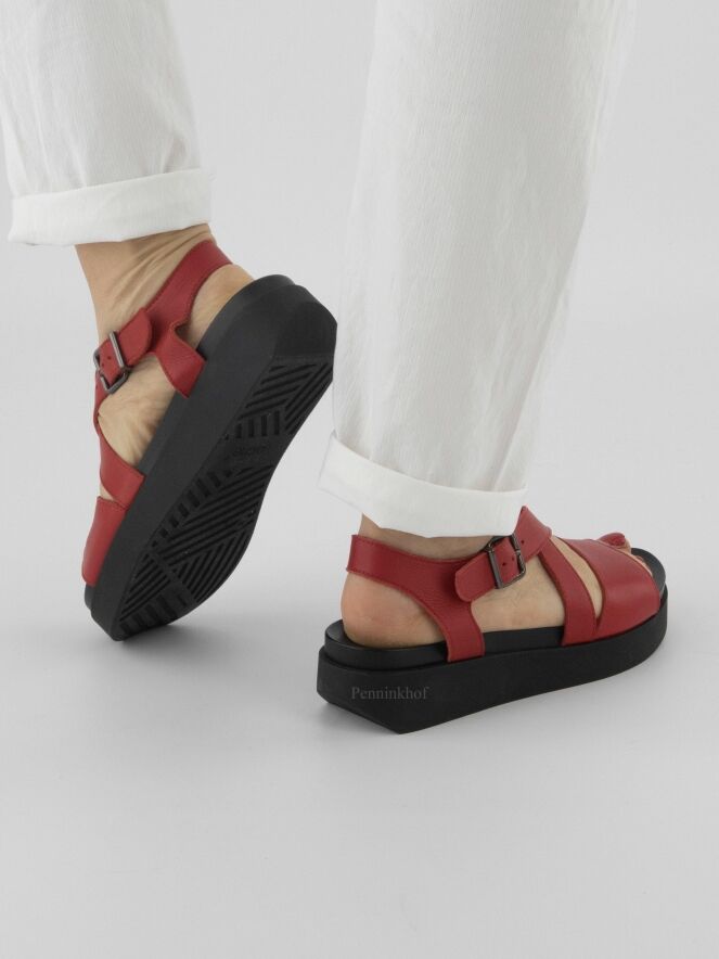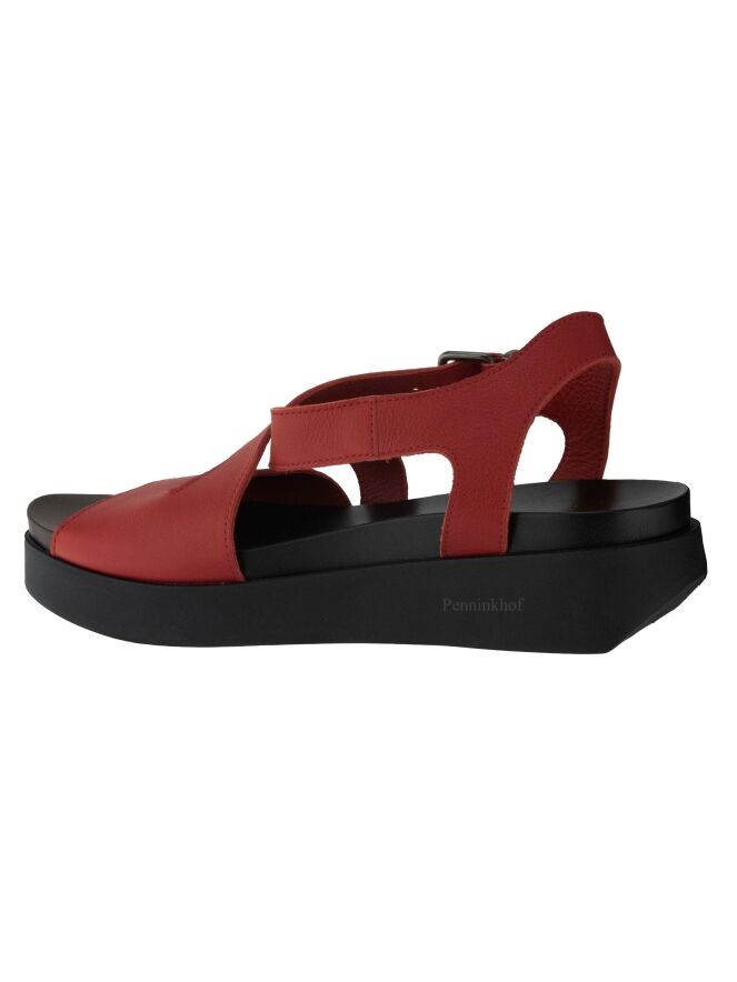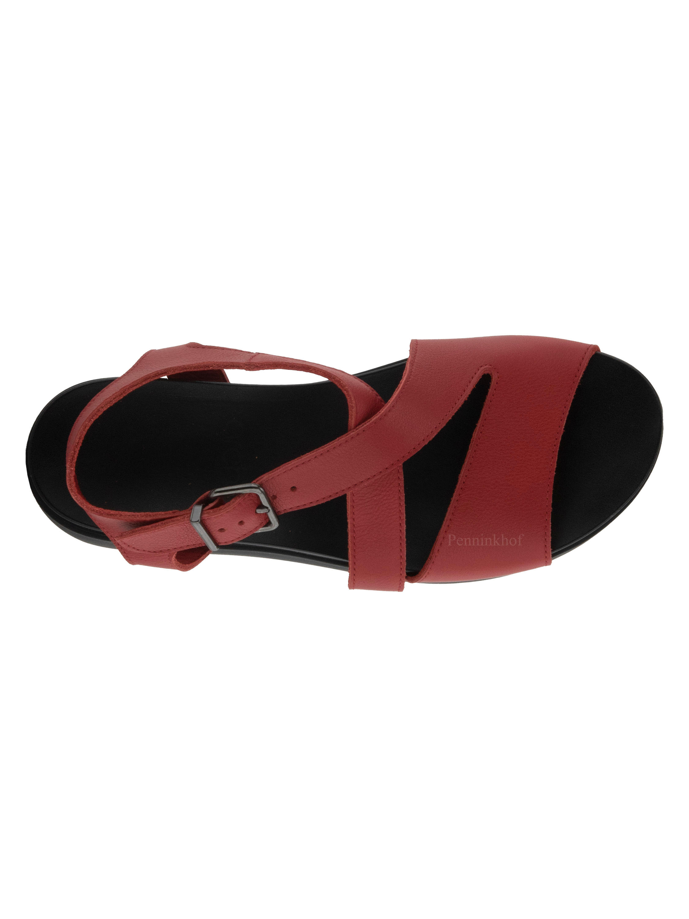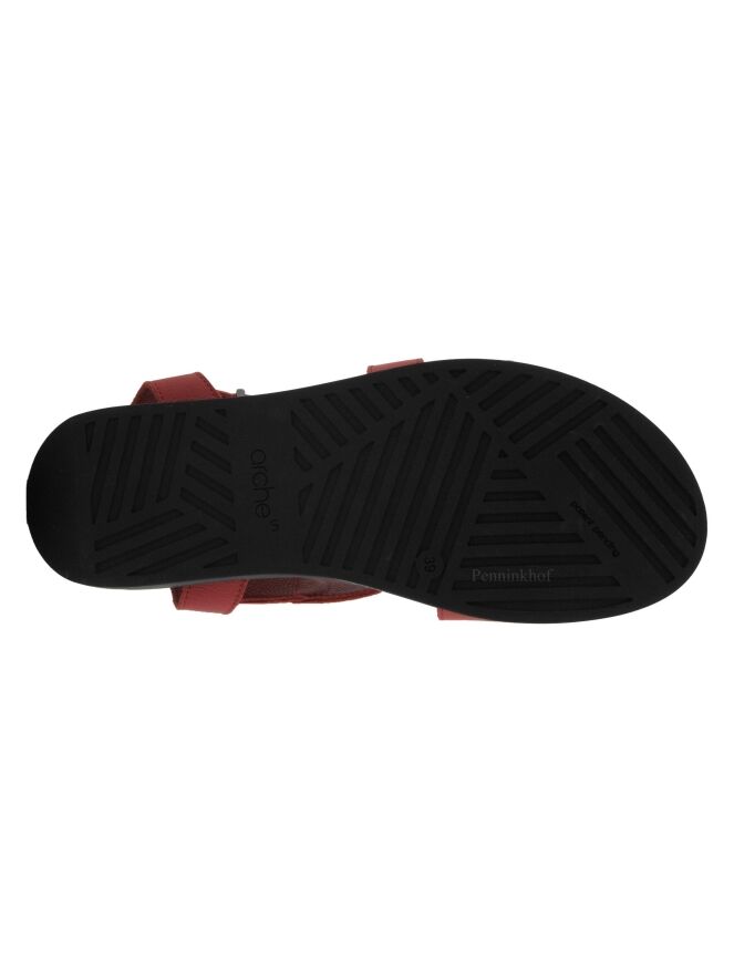 A sandal from Arche in the color red. There are 2 soft leather trims over the forefoot. From the forefoot is also a trim that runs diagonally across the instep to the outside. The heel strap is adjustable.