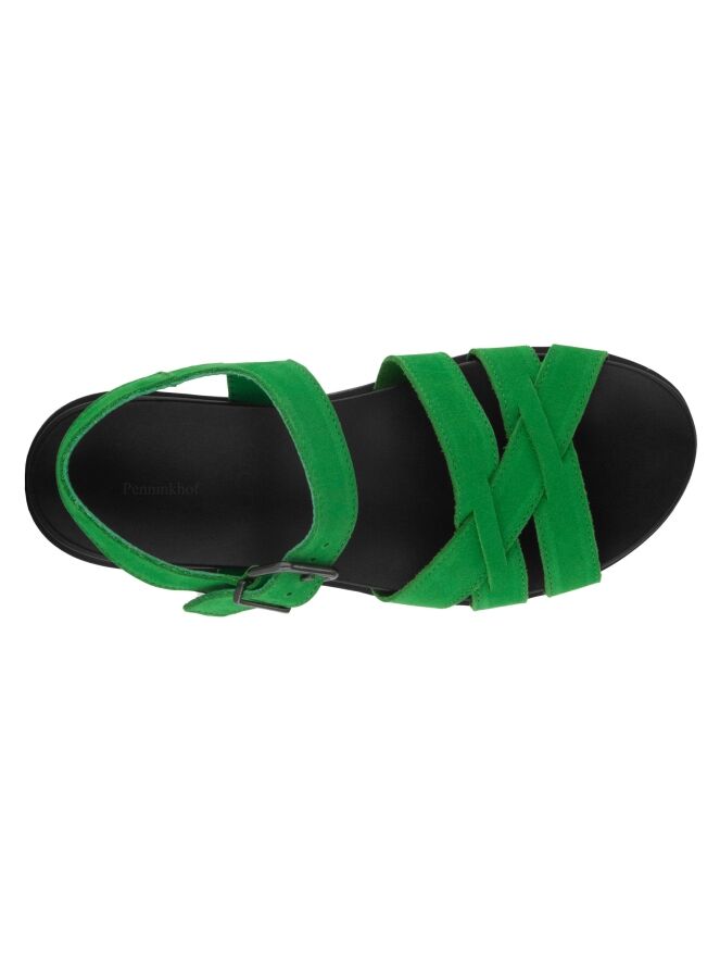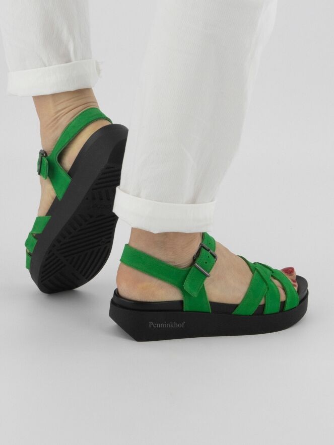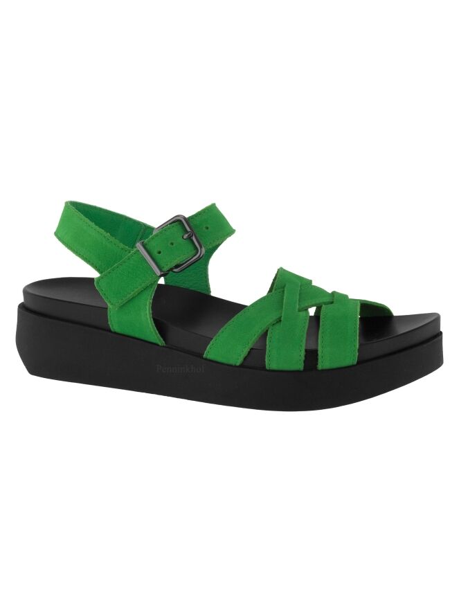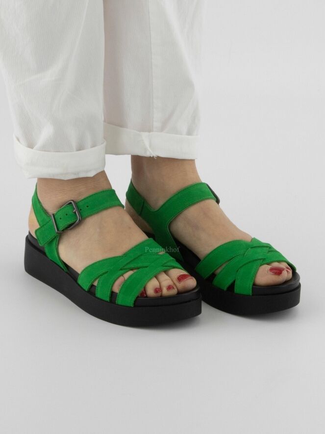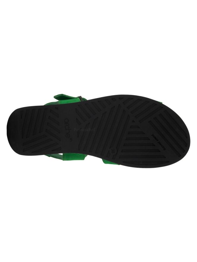 A slipper from Arche in the color green. A soft footbed has been placed on the latex platform sole. The soft leather is with 3 crossed straps over the forefoot. Over the instep is an adjustable buckle.