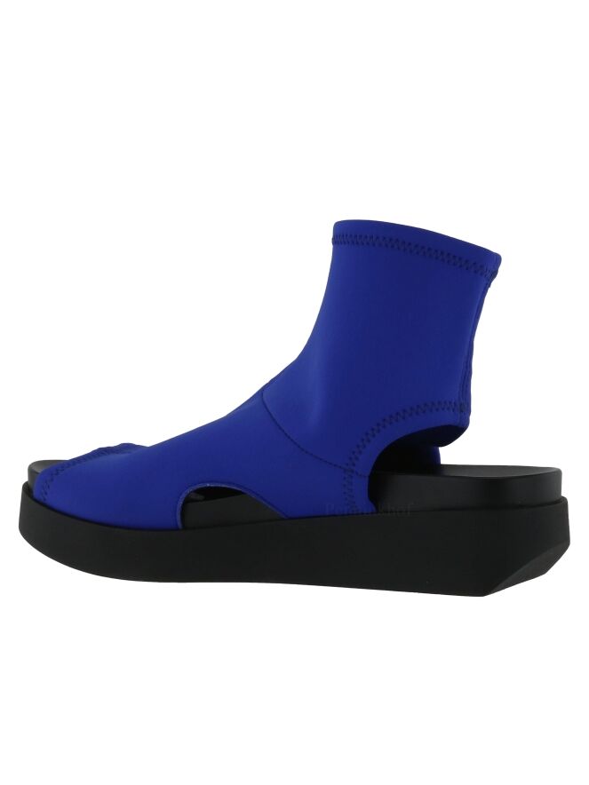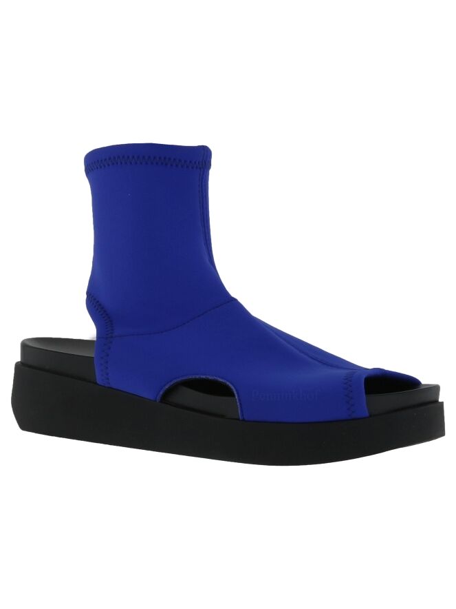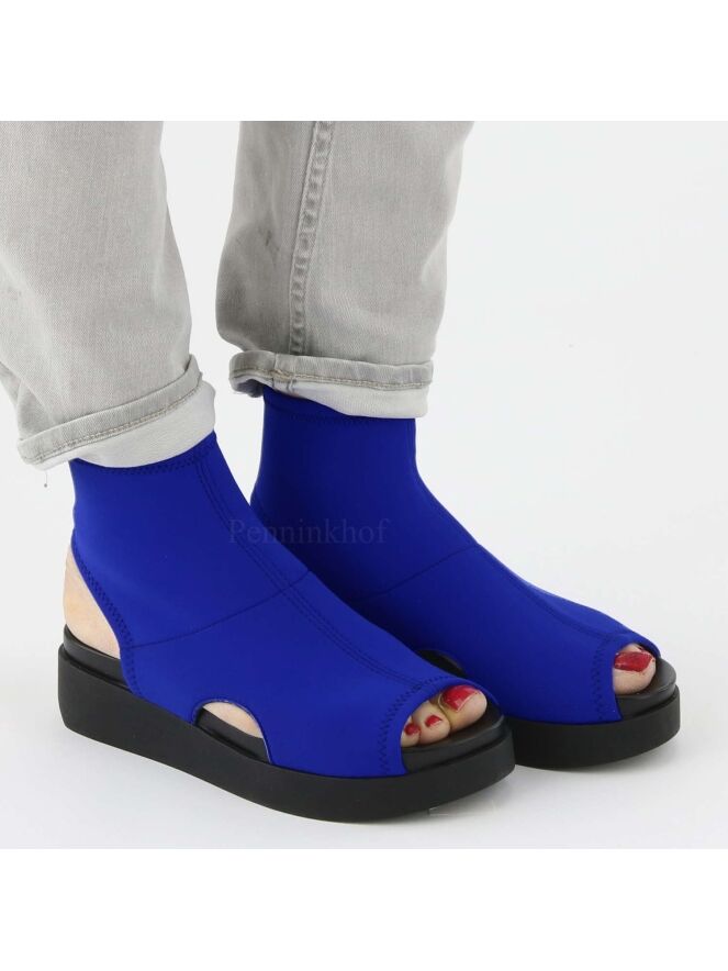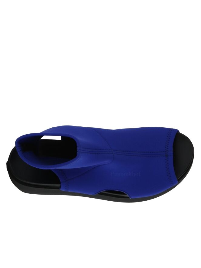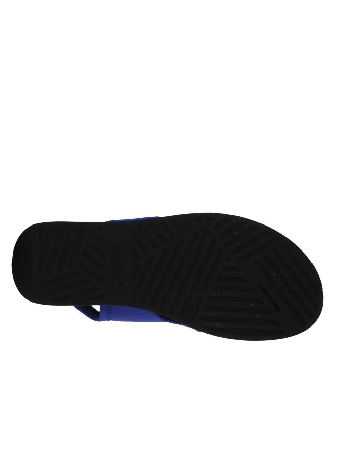A sandal from Arche in the color cobalt blue. The material is an elastic fabric. The sole is made of latex. The sandal has an open toe and heel and there are openings on the sides.