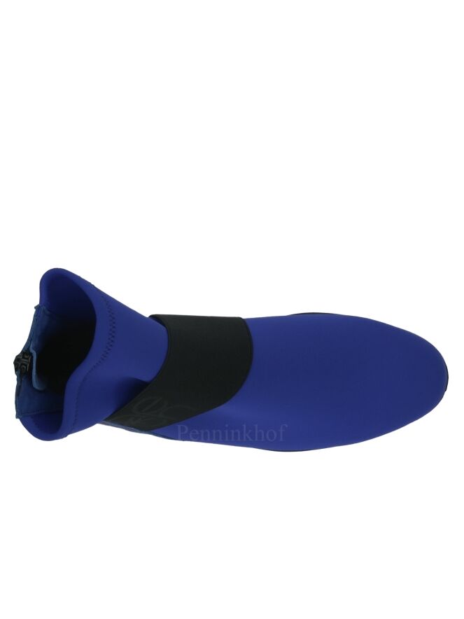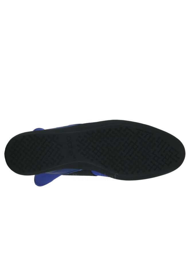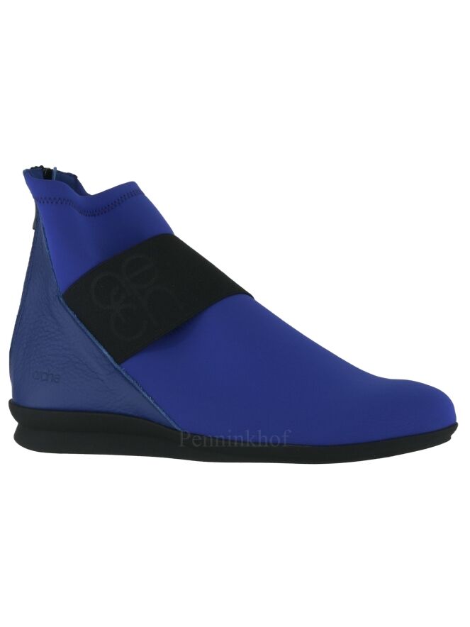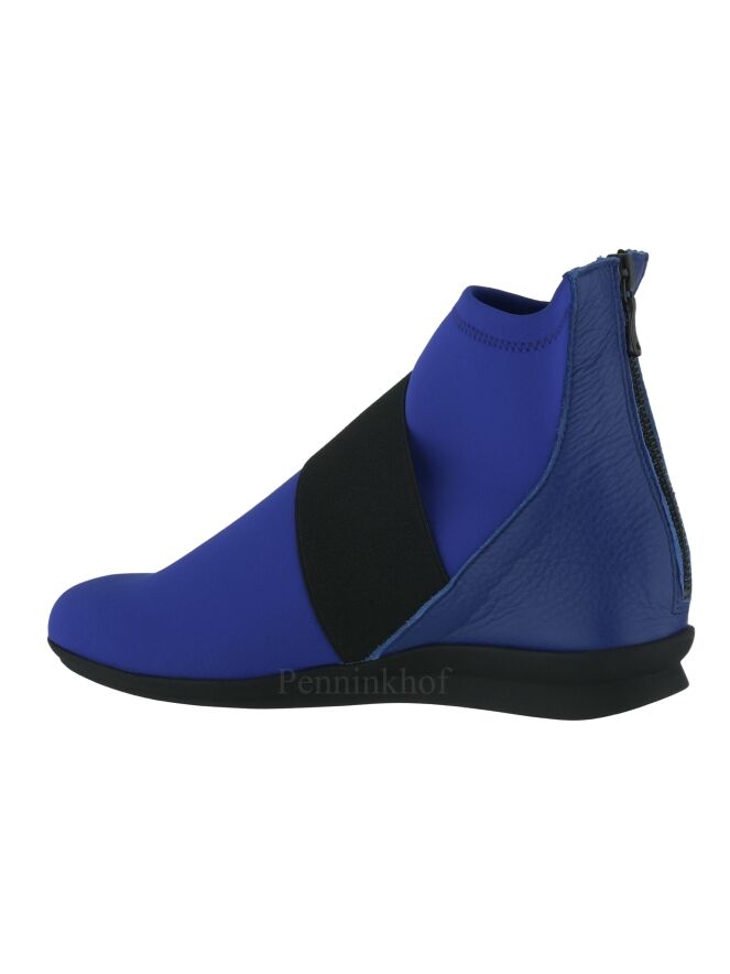 A short boot from Arche in the color cobalt blue. Across the forefoot is a broad black band. The heel is made of leather and in the middle of the heel is a zipper.