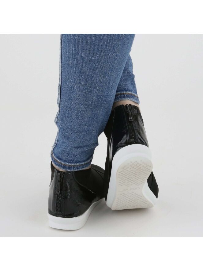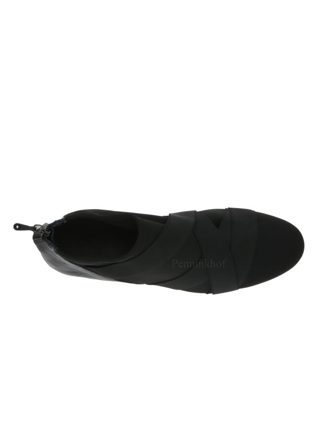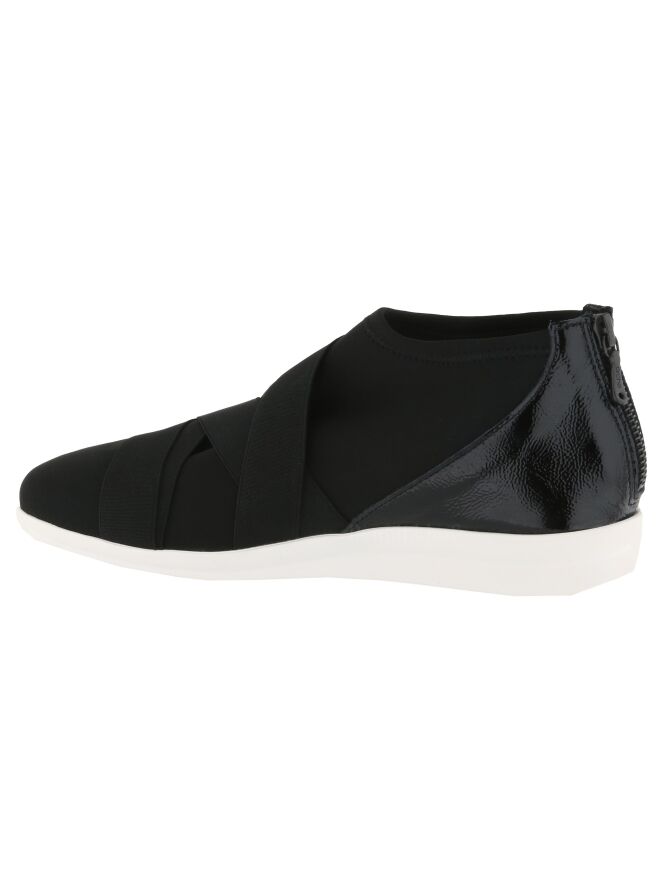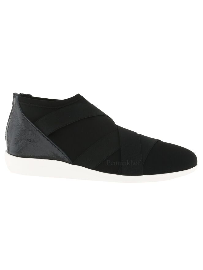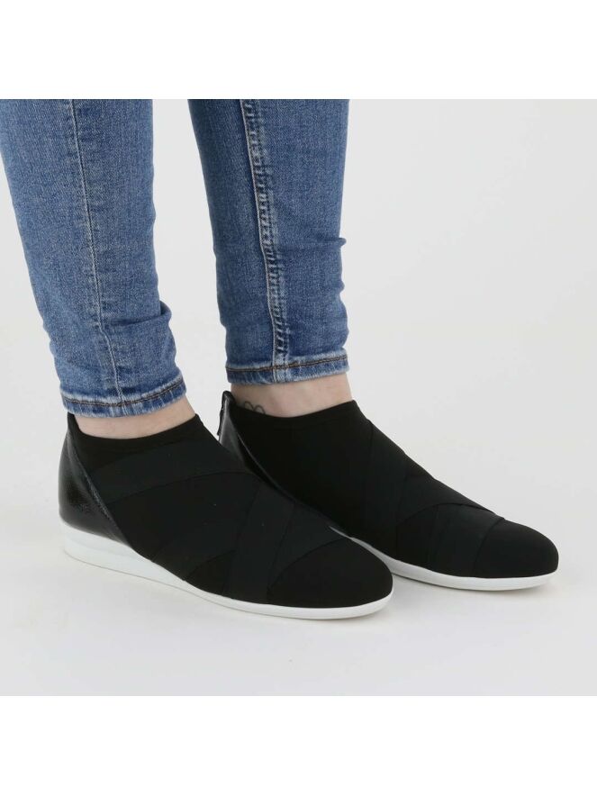 A loafer from Arche in an elastic black fabric with a black elastic trim that runs diagonally over the instep. The heel is in a black patent leather. On the heel is a short black zipper. The sole is in the color white.