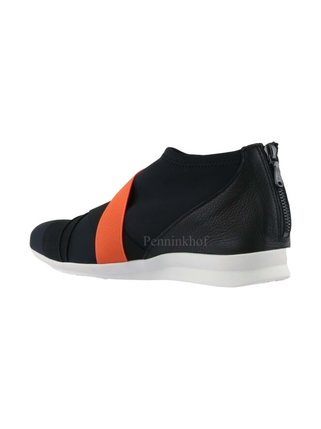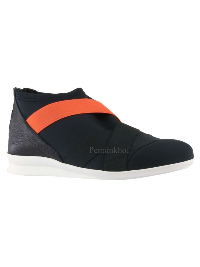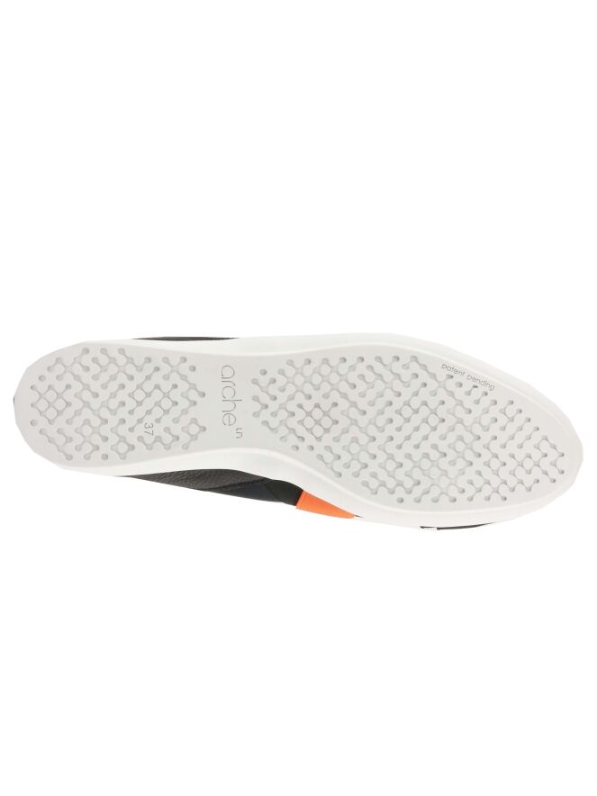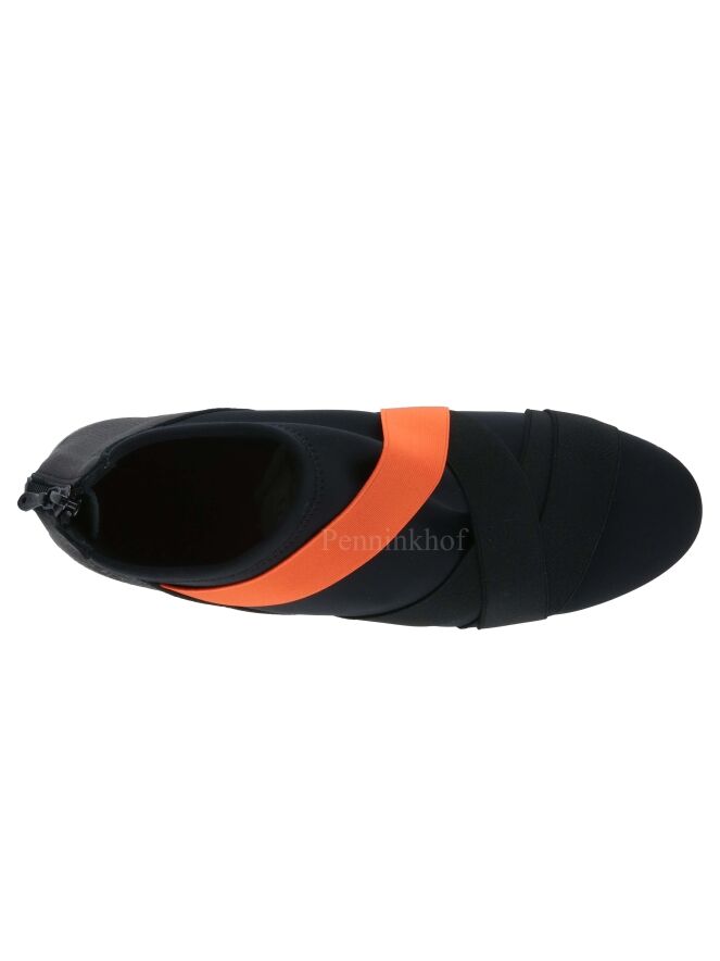 A slip-on from Arche in an elastic black fabric with an orange elastic band that runs diagonally across the instep. The heel is in a black leather. There is a short black zipper on the heel. The sole is black in the color.