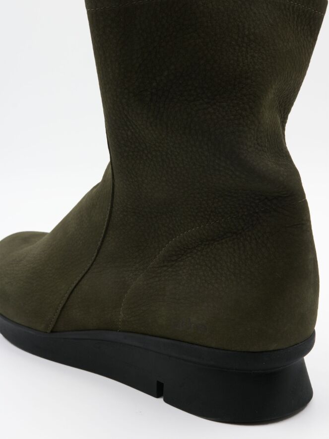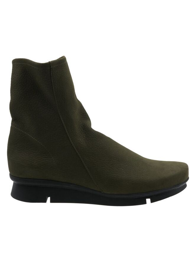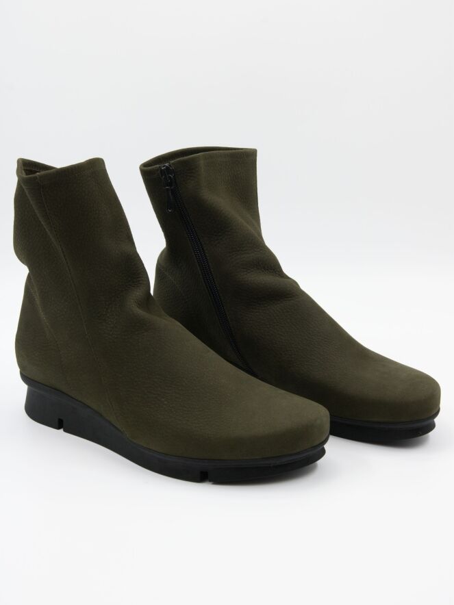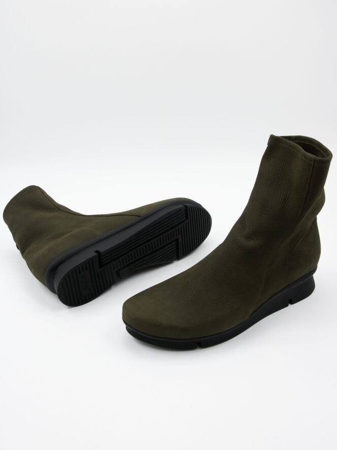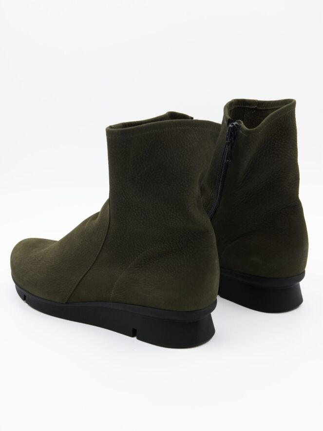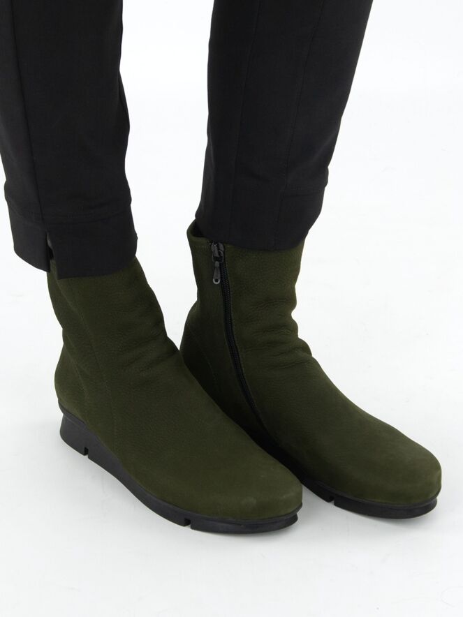 An ankle boot from Arche in the colour khaki. The boot has a slightly raised sporty latex sole in the colour black. On the inside is a black zip. The boot has a round toe and the inside is unlined.
