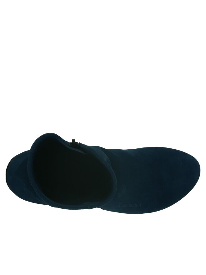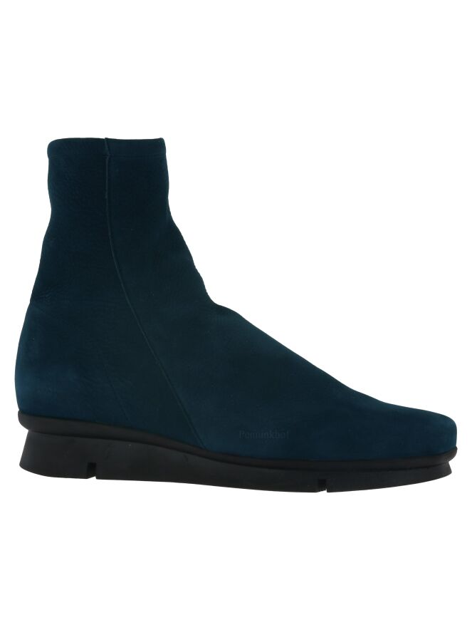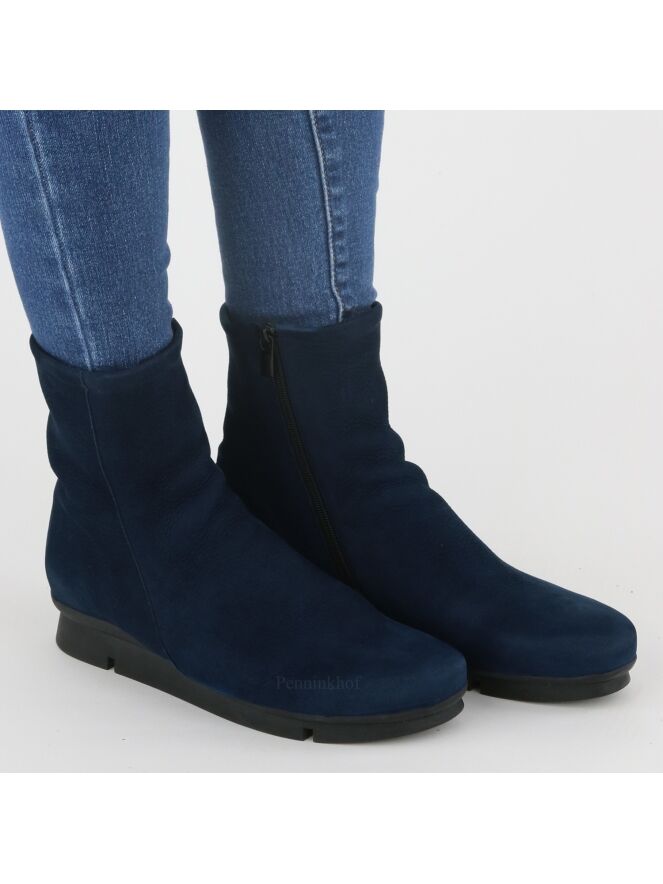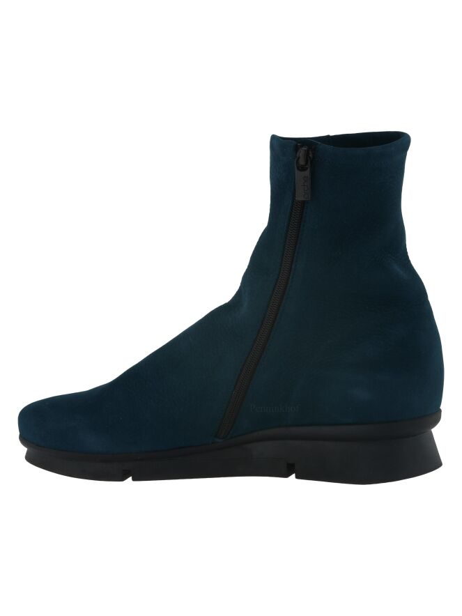 An ankle boot from Arche in the color midnight blue. The boot has a slightly raised sporty latex sole in the color black. There is a black zipper on the inside. The boot has a round toe and the inside is unlined.