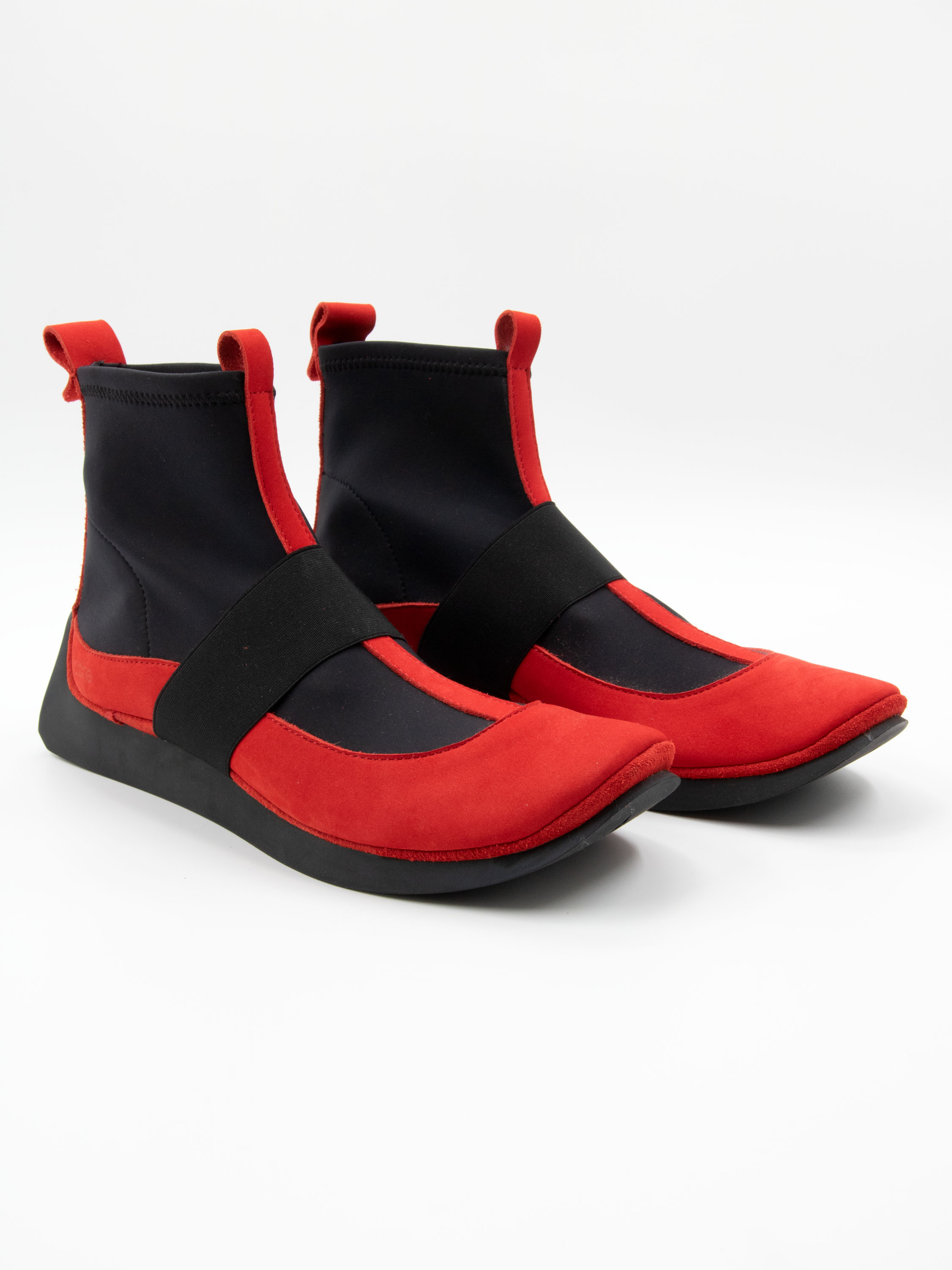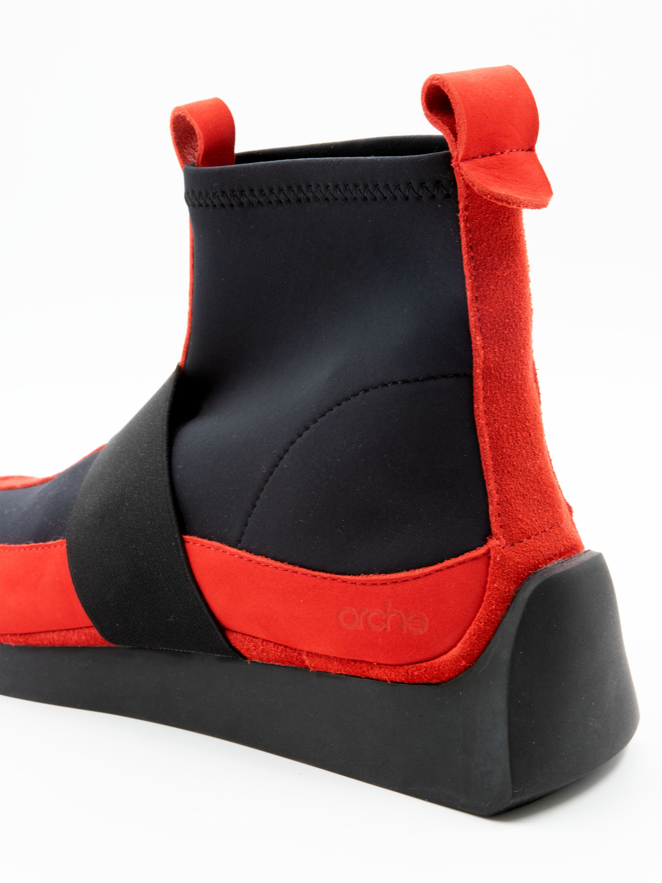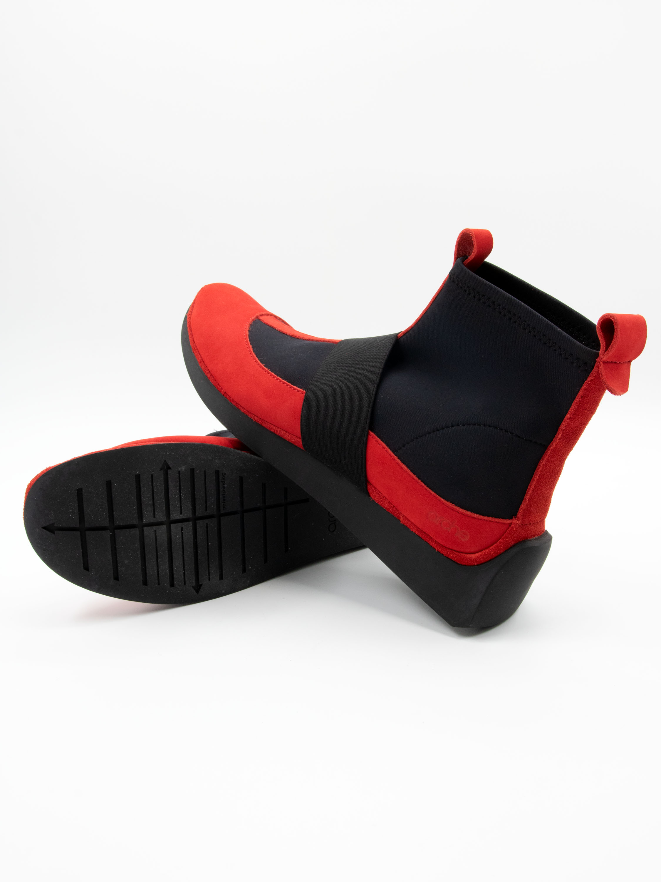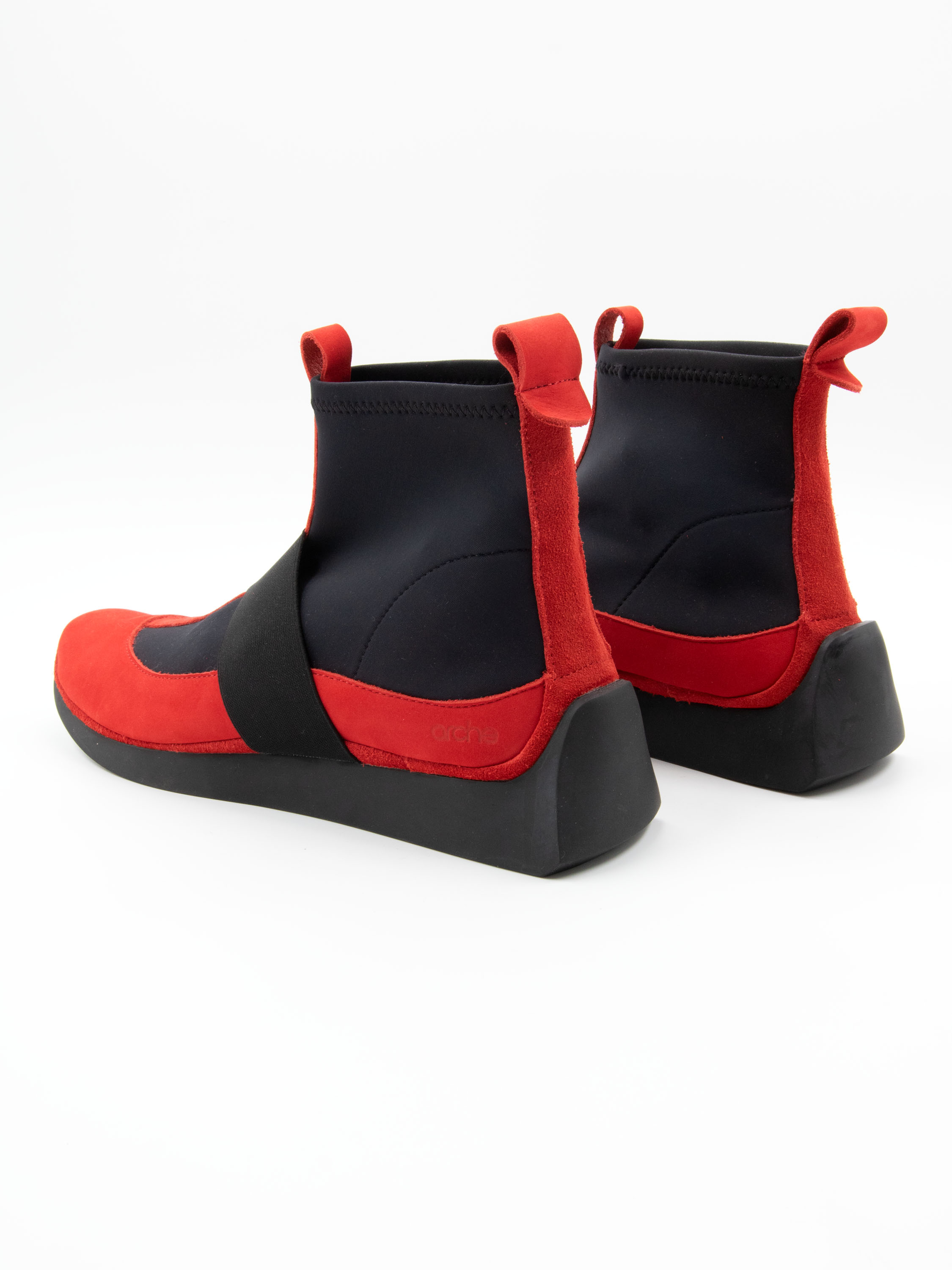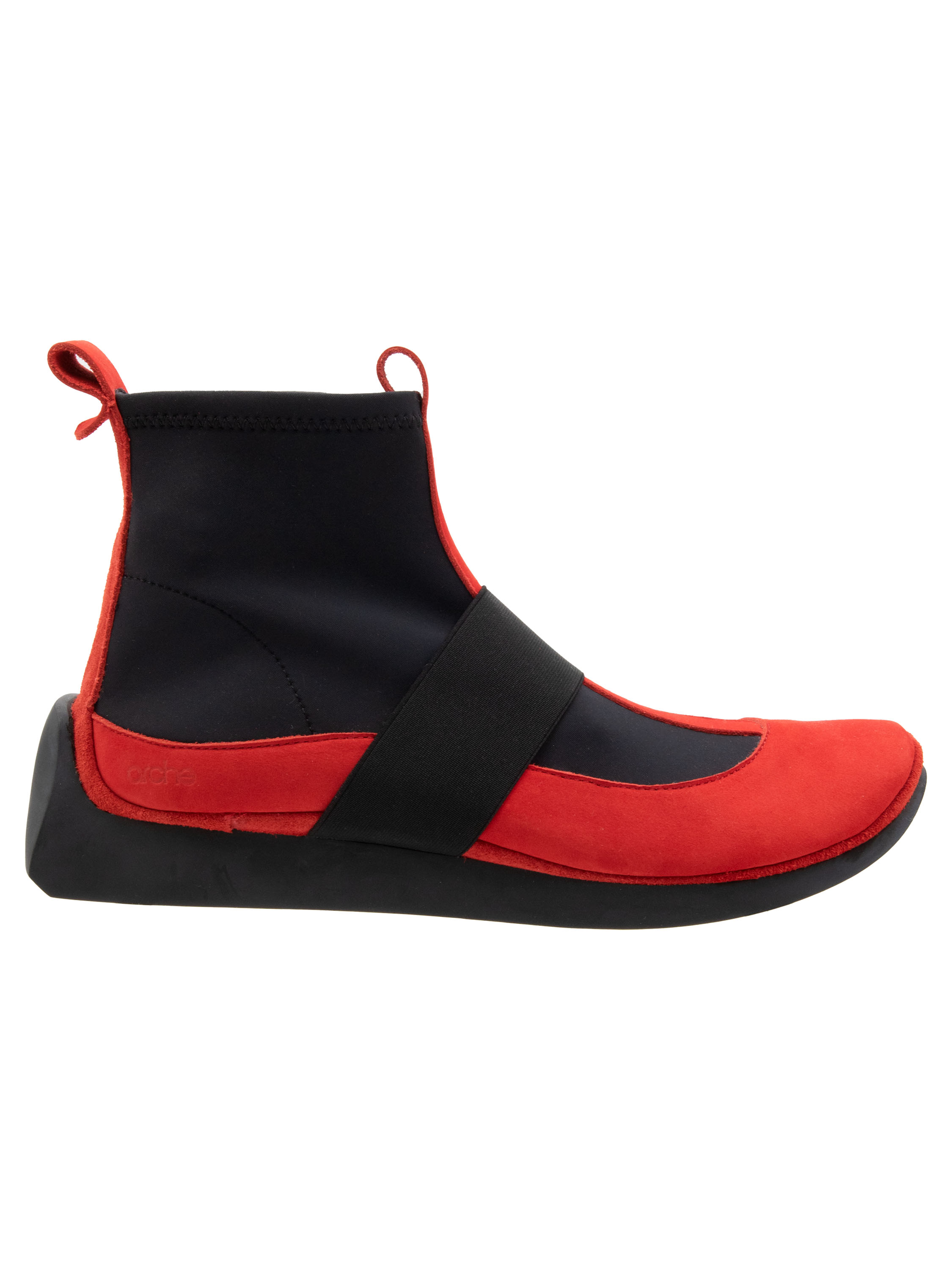 A short ankle boot by Arche in a vibrant red shade. Black elastic inserts extend from the sides of the forefoot up to the shaft. A nubuck trim is featured on the heel. A wide elastic band crosses the forefoot. The inside of the boot is unlined.
